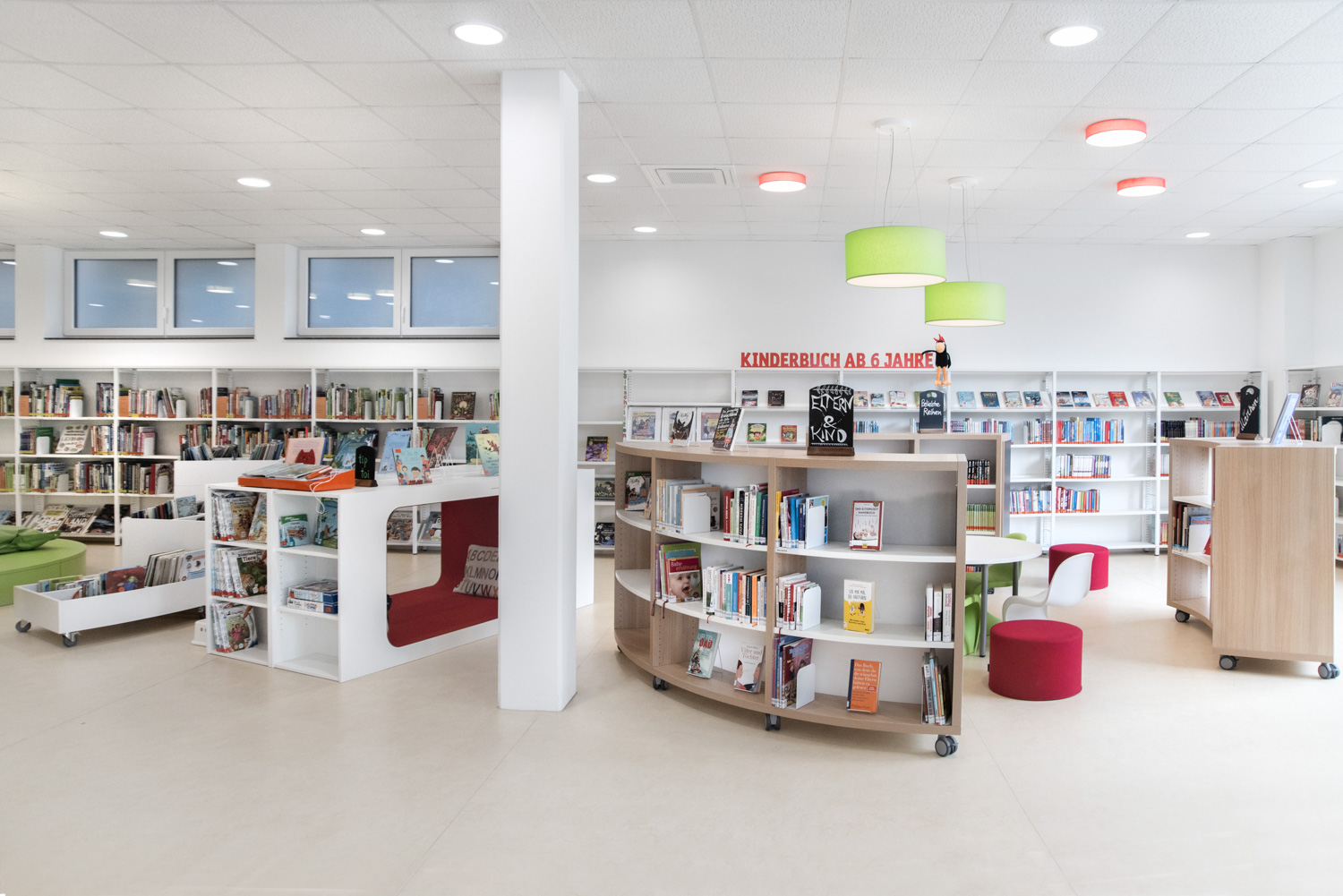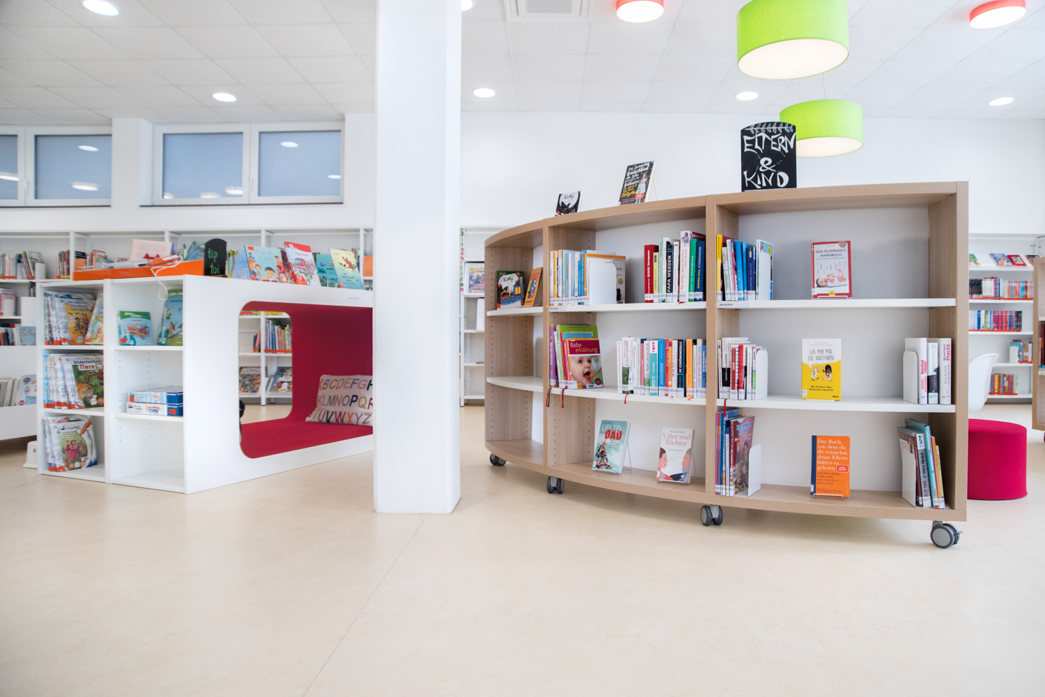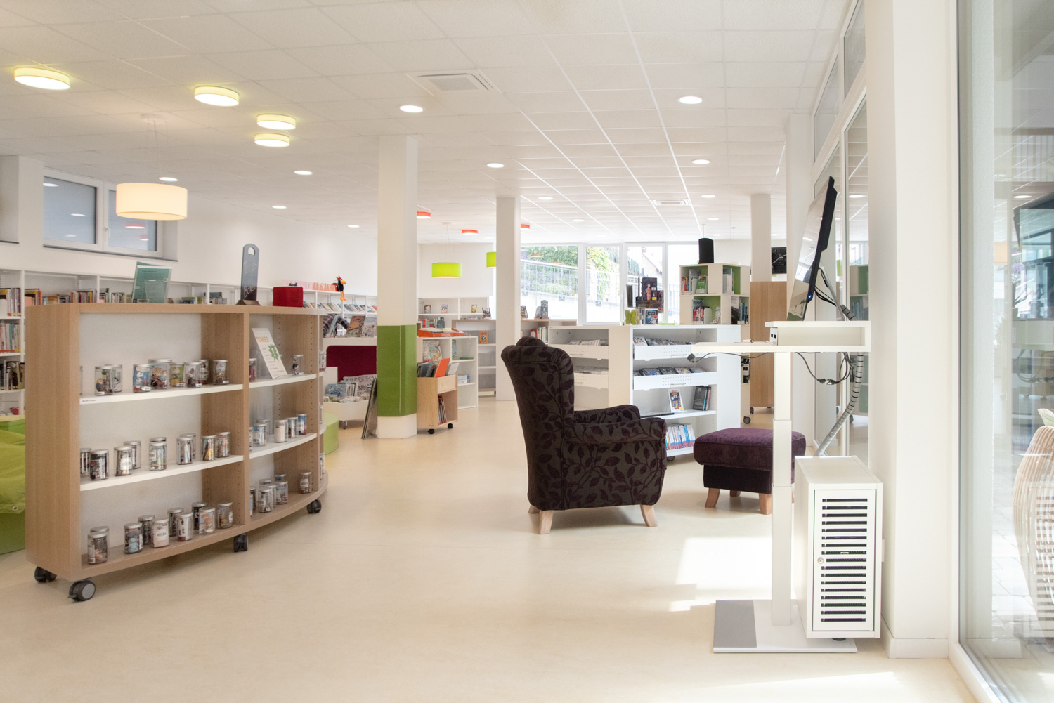 Notre équipe d'architectes, en collaboration avec la bibliothèque d'Ilsfeld, a proposé des solutions originales concernant les couleurs et les formes du mobilier. Cela a donné naissance à cette très belle bibliothèque, accueillante et de haute qualité.