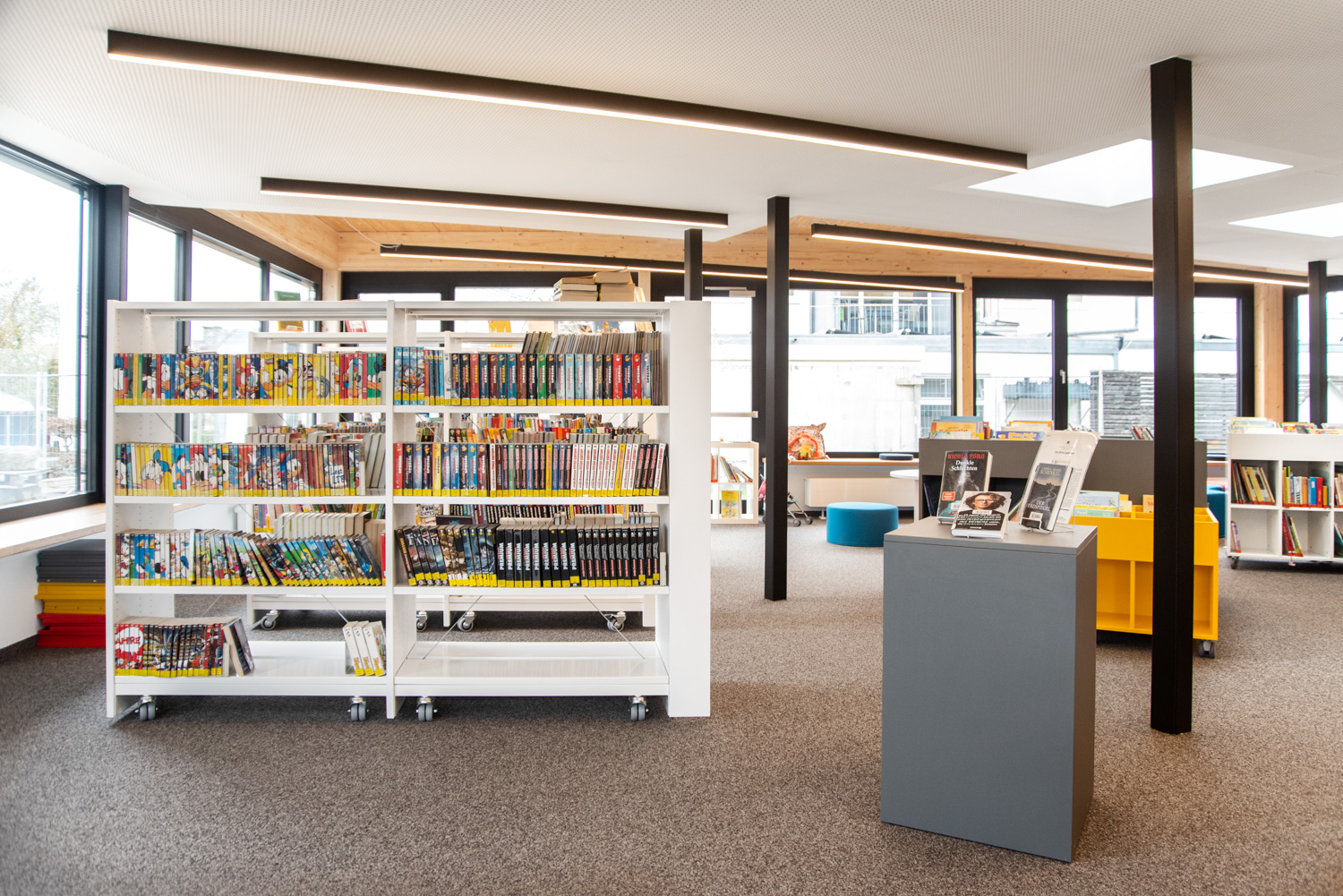 La répartition des espaces a été le plus grand défi, mais nous avons réussi à obtenir un bon résultat permettant d'accueillir tous types de public à l'intérieur sans que la bibliothèque ne semble trop exiguë ou saturée. Désormais, les habitants de Rot an See se retrouvent dans un environnement moderne et accueillant où ils peuvent trouver tout ce dont ils ont besoin.