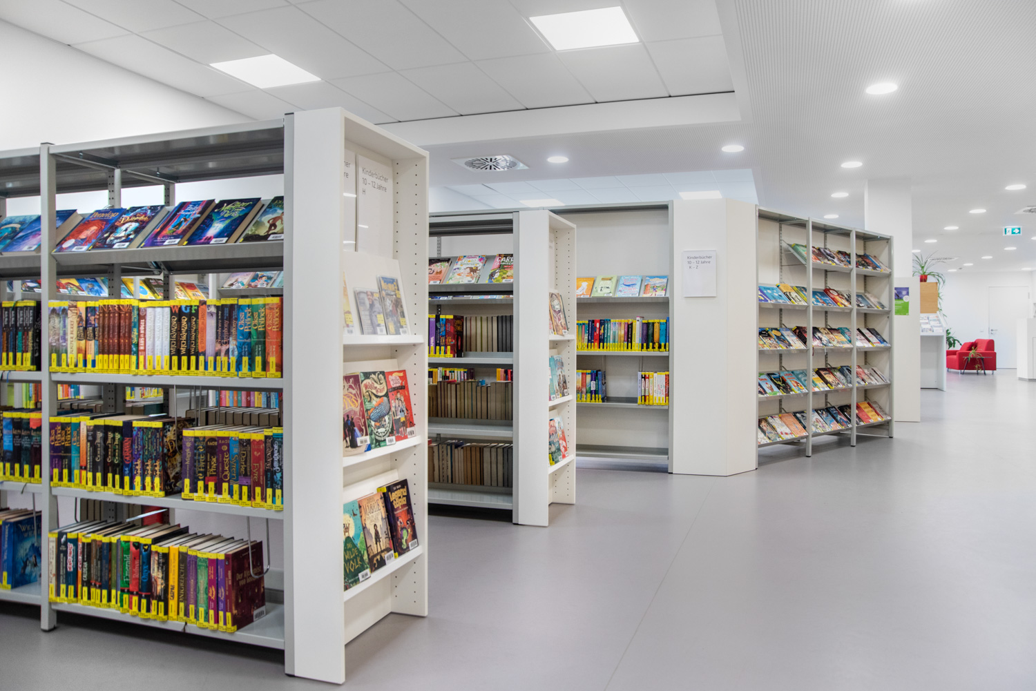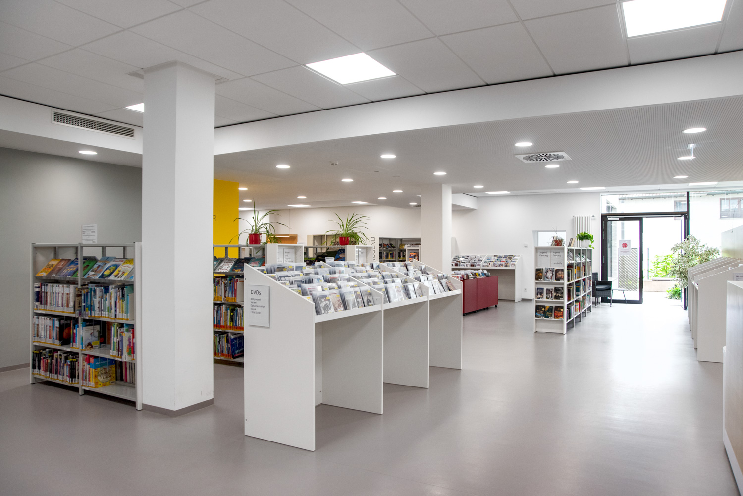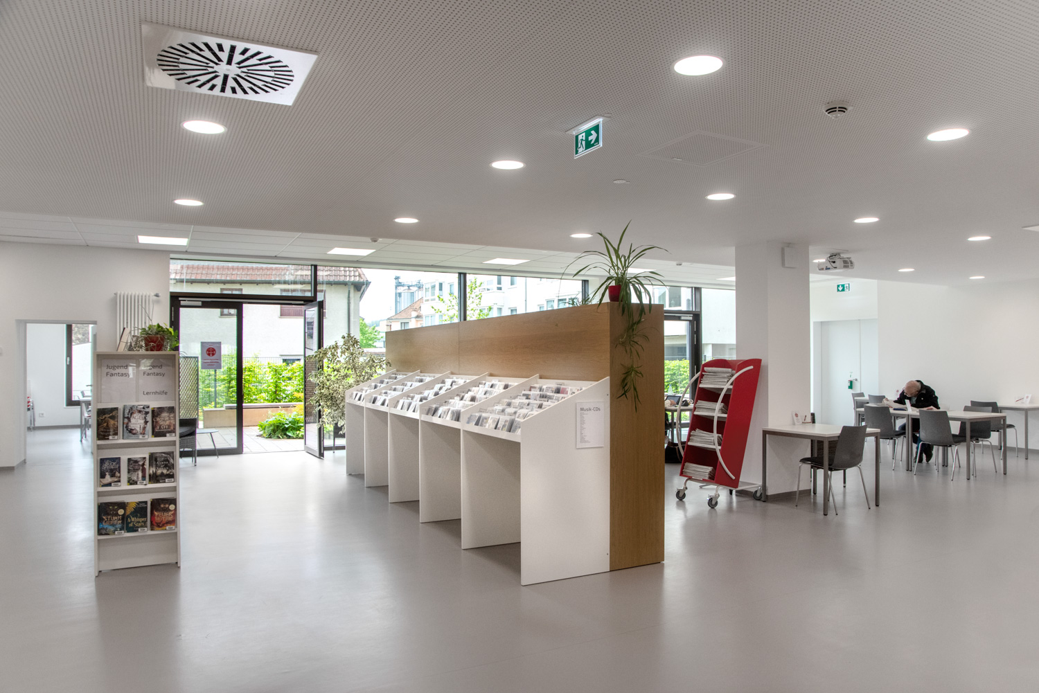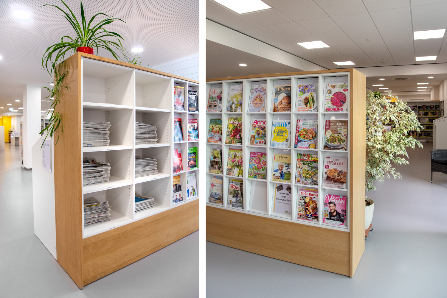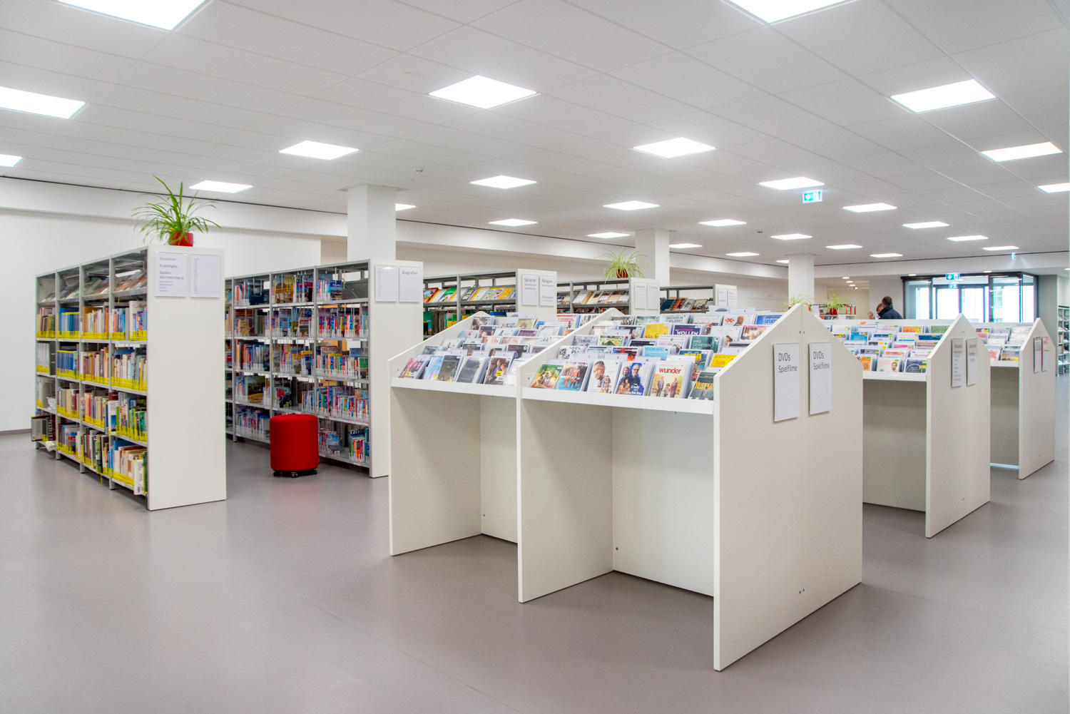 A la bibliothèque de Sinsheim tous les rayonnages métalliques existants ont été réutilisés et modernisées. Parallèlement, de nouveaux meubles, tels que la pyramide de présentation Wow et la table Inform, ont été ajoutés à la bibliothèque pour lui donner un nouveau look.