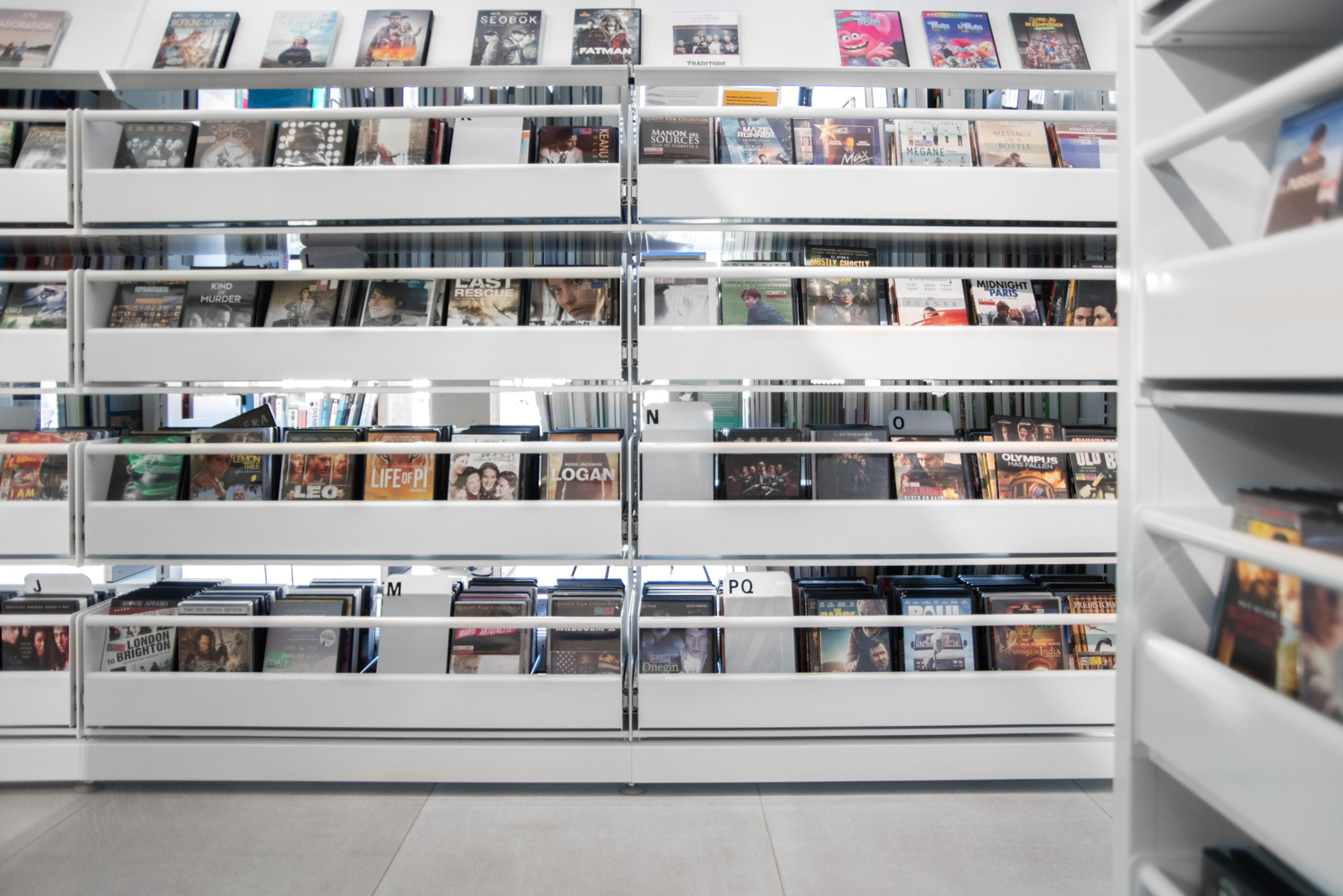 Autres détails : Un espace important est prévu pour la présentation des nouveautés et des stands thématiques, et une signalisation appropriée montre au visiteur le chemin à travers cette bibliothèque lumineuse.