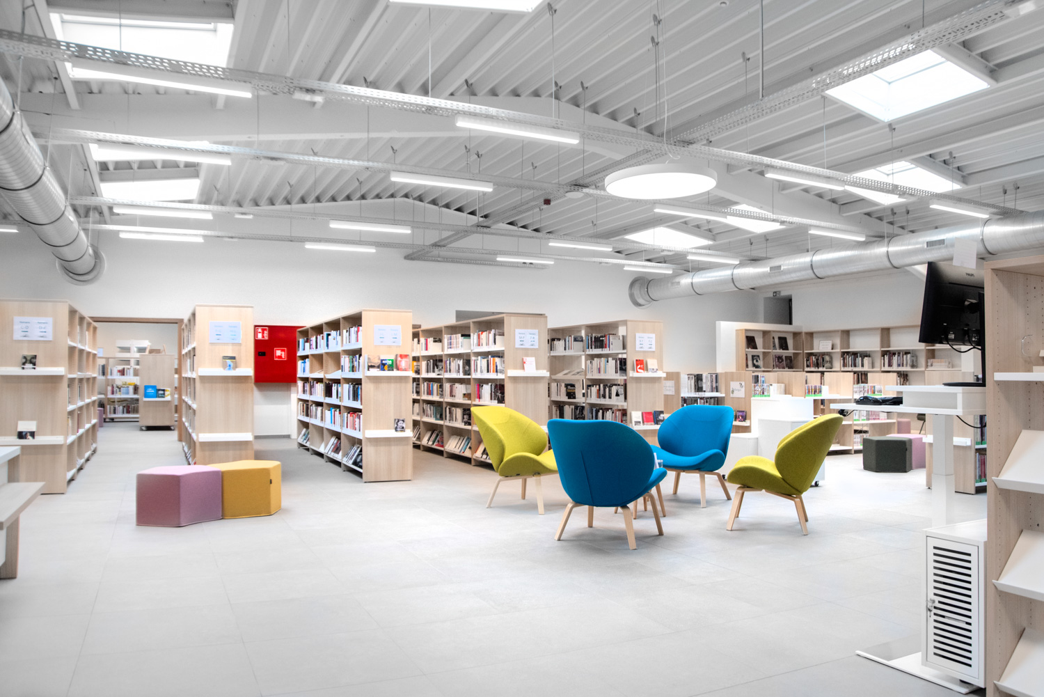 La bibliothécaire Christine Gillard raconte : « En mettant le toit à nu, avec des ouvertures et sans faux-plafond, nous avons obtenu une lumière naturelle accrue. Le choix d'étagères en bois et de sièges aux tons chauds a contribué à créer l'atmosphère conviviale que nous recherchions. Lors de la conception de ce lieu, nous avions des exigences spécifiques, auxquelles Schulz a répondu avec succès ».