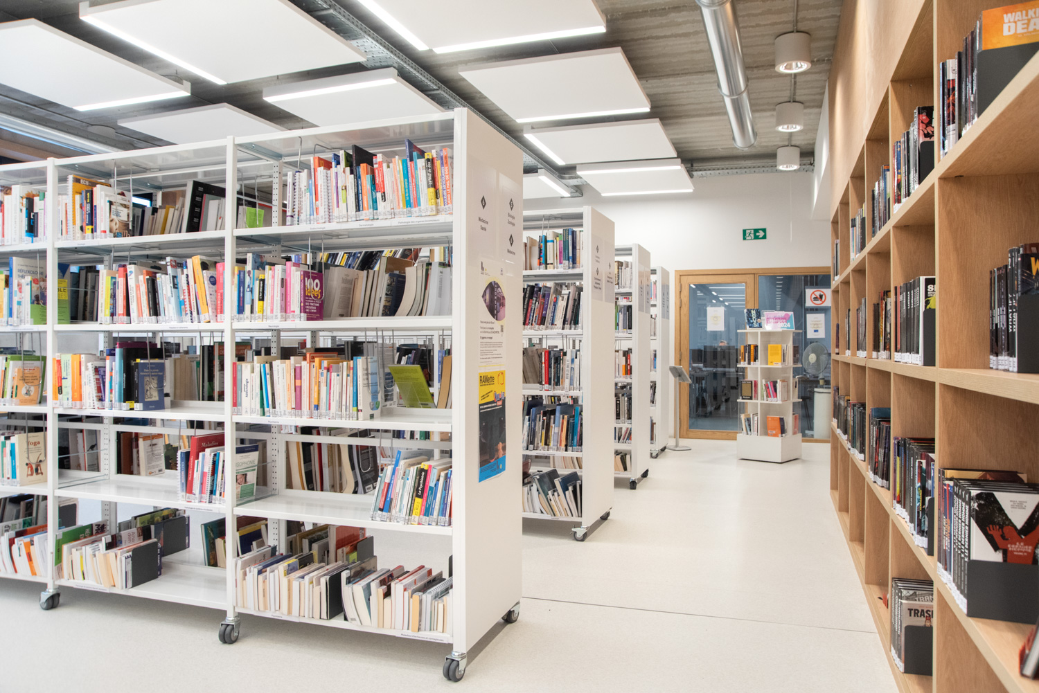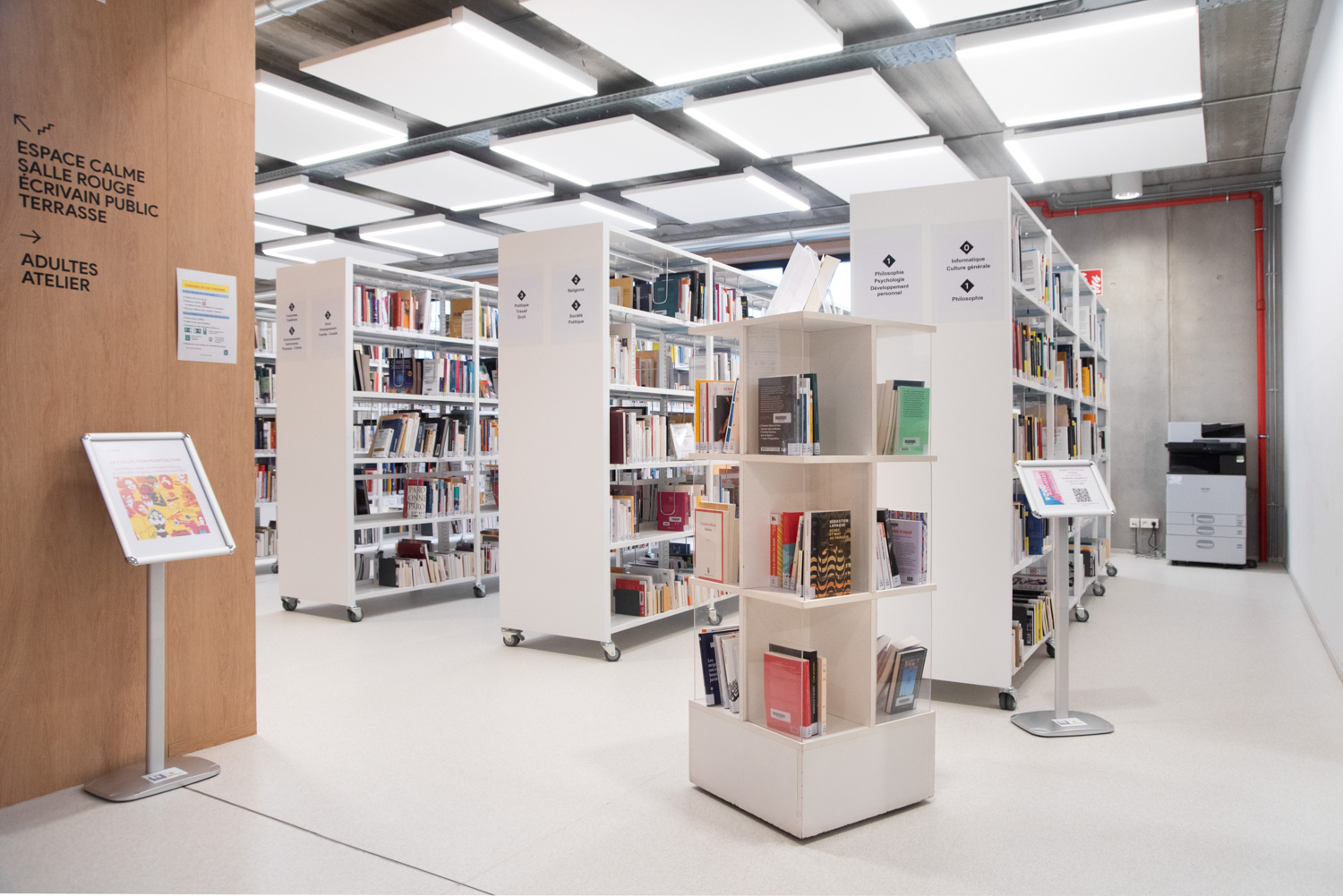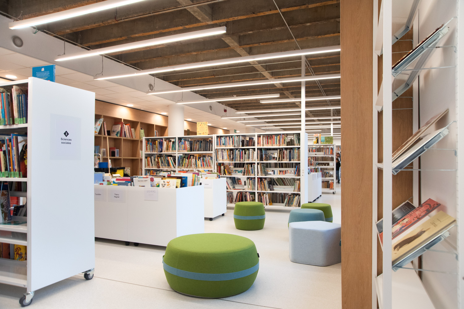 Silvia Maria Rossi - agent technique en chef : « A l’ère du numérique, la bibliothèque, en tant qu’espace public, subit une vraie révolution. C’est actuellement un des lieux publics des plus évolutifs. La bibliothèque devient de plus en plus un lieu de vie social, beaucoup plus hétérogène que ce que l’on pense. Pour cette raison, les espaces sont conçus par plateaux open-space, délimités et connectés entre eux par des cloisons/étagères en bois sur mesure ou des « aquariums » vitrés. «