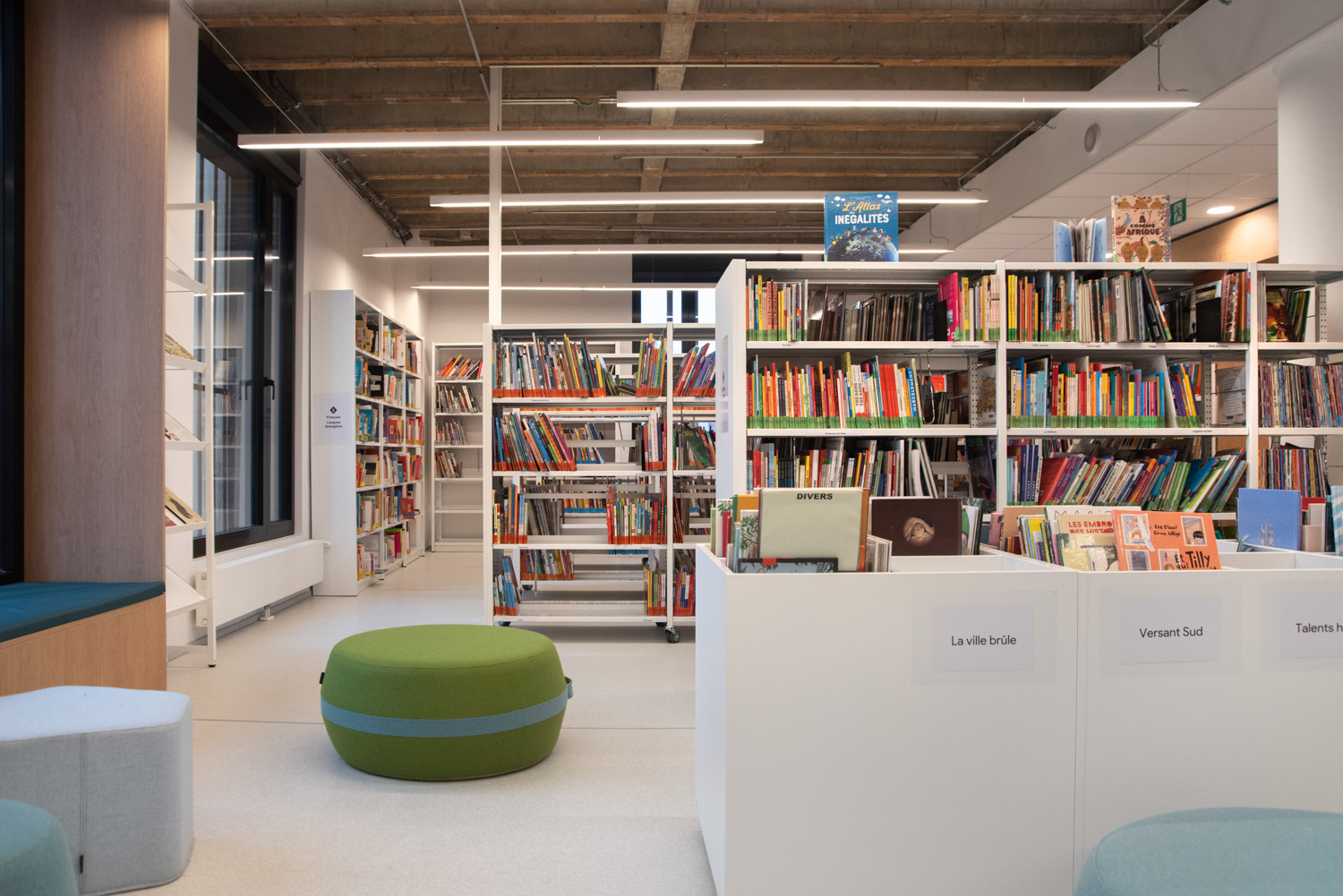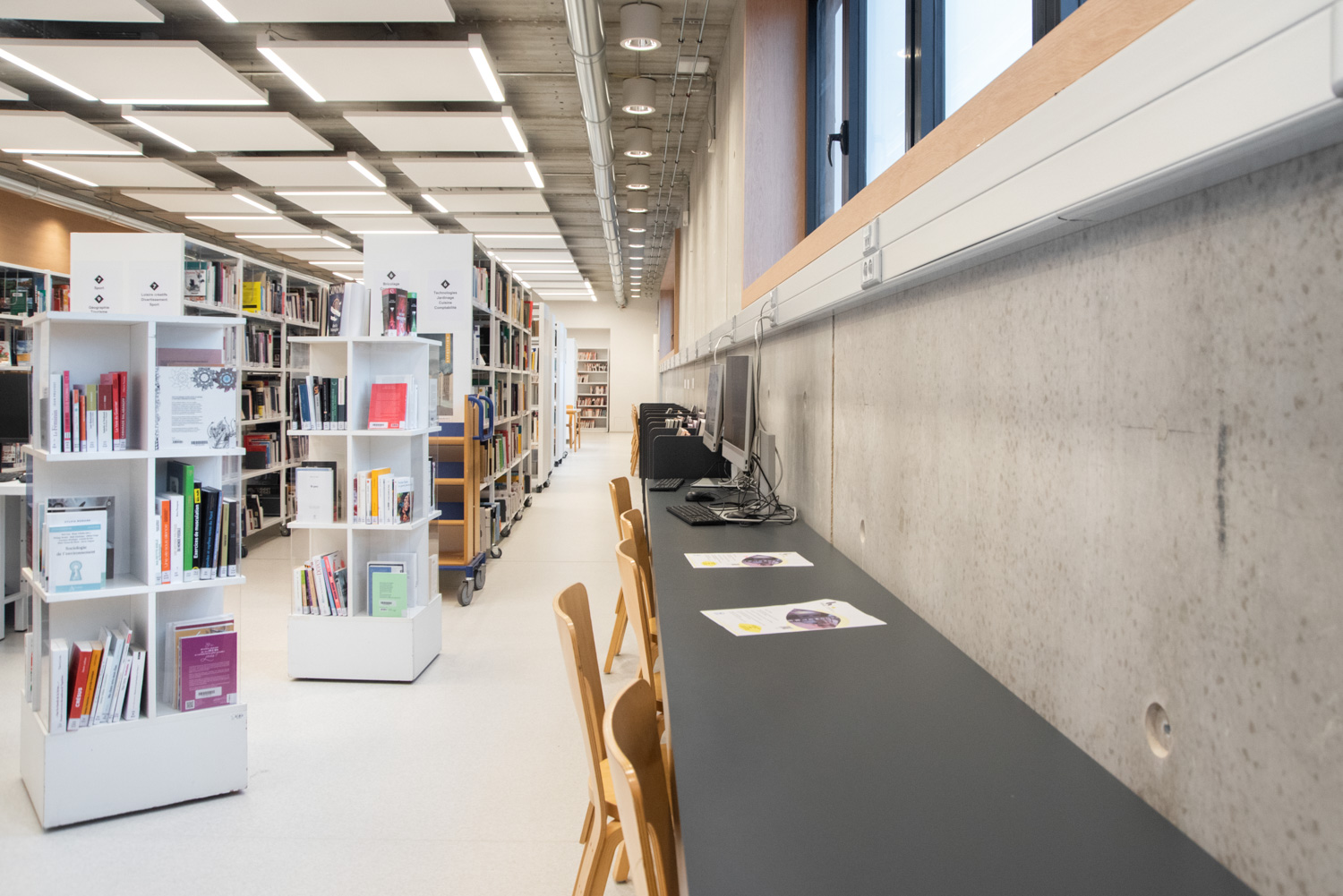 Une attention particulière a été apportée aux choix des matériaux et à leur durabilité. Le résultat : un aménagement cosy et épuré. Le public apprécie l’intérieur confortable et lumineux, où on se sent bien. Mme Rossi cite Gaston Bachelard pour souligner l’importance d’une bibliothèque contemporaine: "Le paradis, à n'en pas douter, n'est qu'une immense bibliothèque".