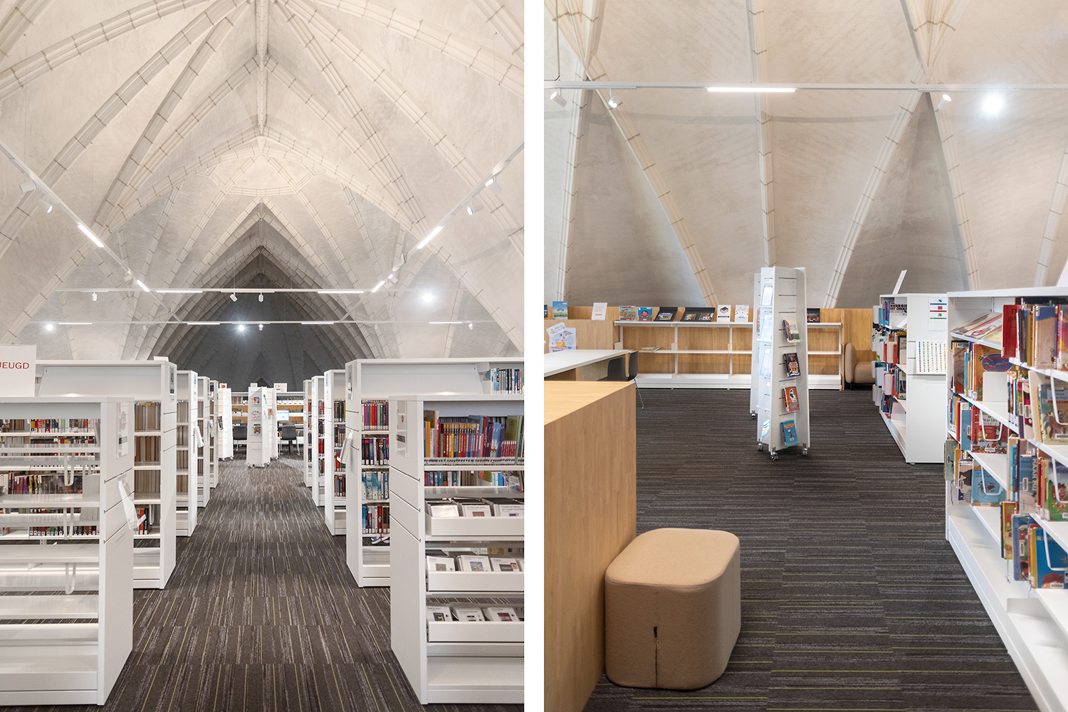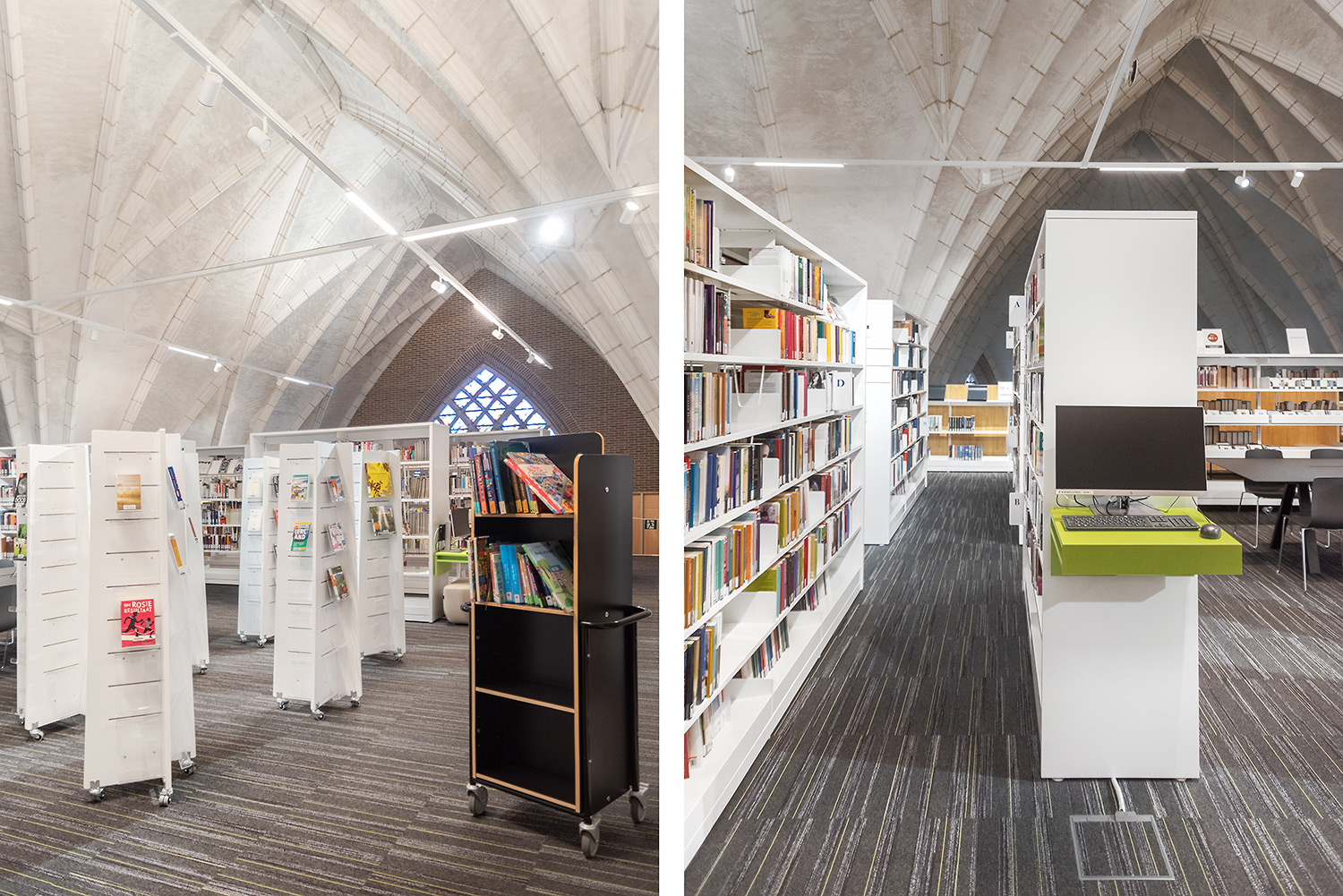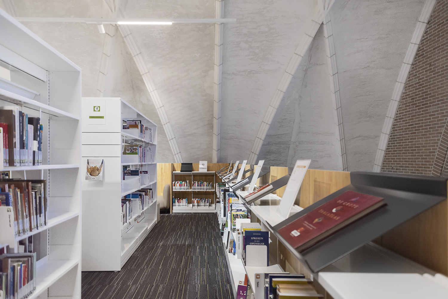 La bibliothèque aménagée à l’intérieur et à côté de l’église Sint-Laurentius de Wielsbeke, toujours en activité, jouit d’une implantation unique. Elle est installée dans un nouvel entresol de la nef tandis qu’un nouveau bâtiment jouxtant l’église abrite l’accueil, les sections bandes dessinées et DVD et le back-office, entre autres. Les architectes ont créé un lien visuel entre le bâtiment existant et la nouvelle construction : les panneaux de façade ondulés rouge-brun évoquent le dos des livres et s’accordent joliment avec les teintes de l’église.