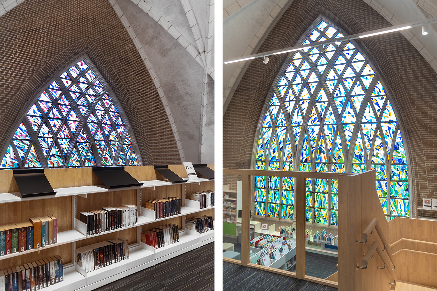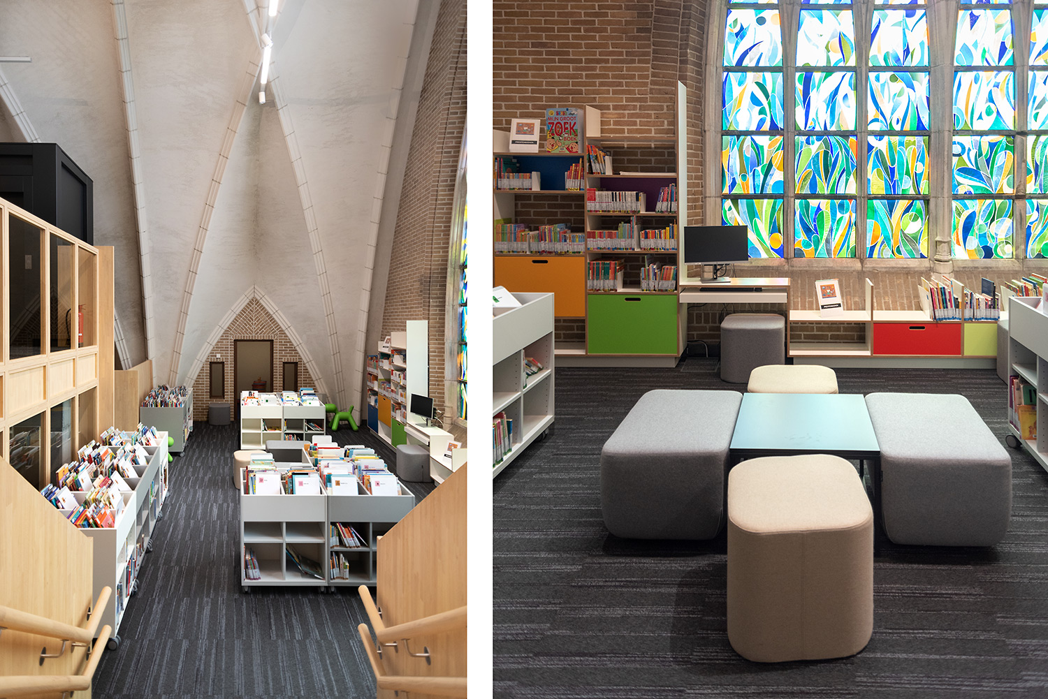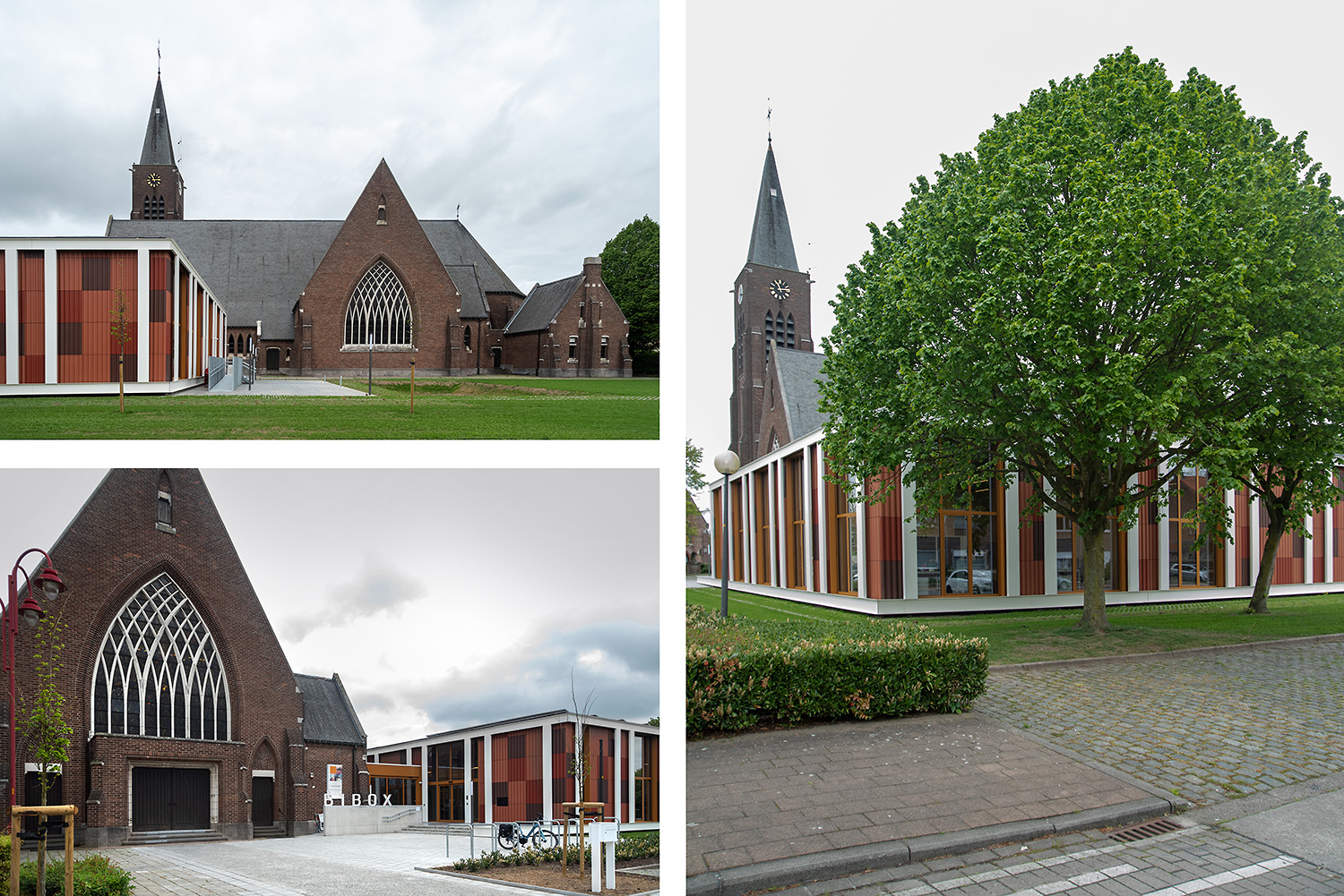 La bibliothèque aménagée à l’intérieur et à côté de l’église Sint-Laurentius de Wielsbeke, toujours en activité, jouit d’une implantation unique. Elle est installée dans un nouvel entresol de la nef tandis qu’un nouveau bâtiment jouxtant l’église abrite l’accueil, les sections bandes dessinées et DVD et le back-office, entre autres. Les architectes ont créé un lien visuel entre le bâtiment existant et la nouvelle construction : les panneaux de façade ondulés rouge-brun évoquent le dos des livres et s’accordent joliment avec les teintes de l’église.