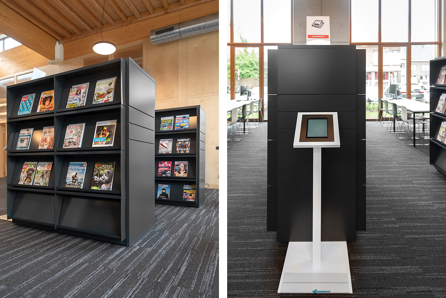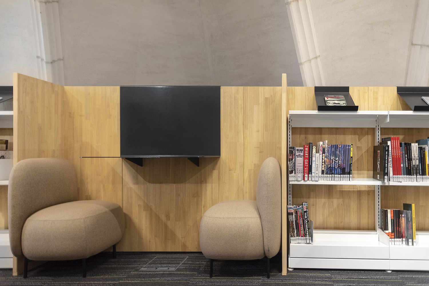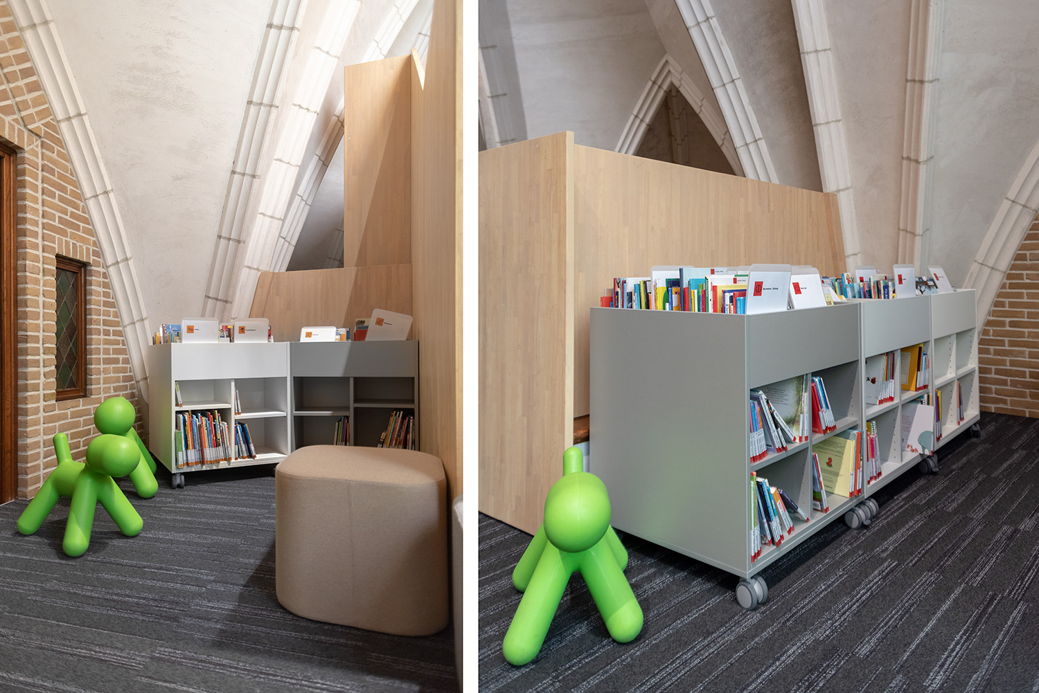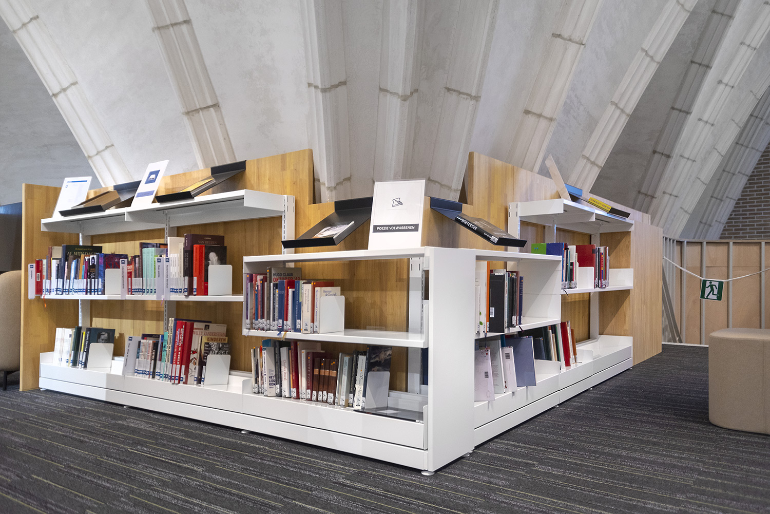 Les rayonnages de bibliothèque et les meubles blancs ou déclinés dans des teintes douces mettent véritablement les livres en valeur. L’espace offre toutefois bien d’autres perspectives, comme l’explique Nele Verfaille, bibliothécaire : « Notre collection d’ouvrages est présentée confortablement et nous avons prévu plusieurs endroits où les visiteurs peuvent s’asseoir pour lire, faire des recherches, se rencontrer ou encore assister à une activité organisée au sein de la bibliothèque. »