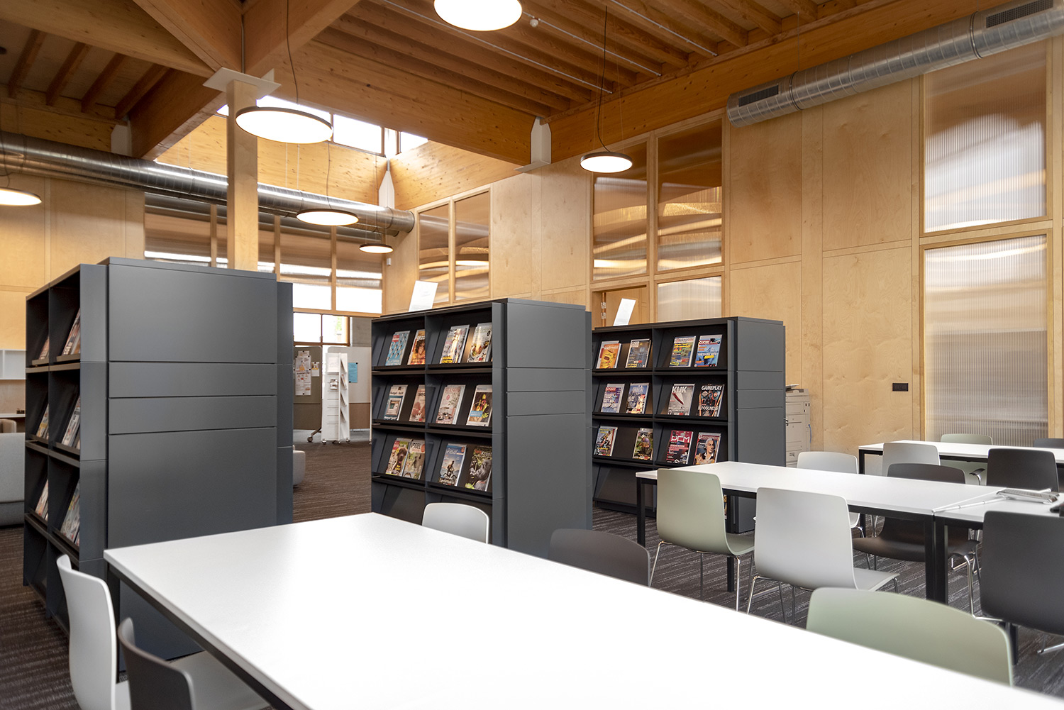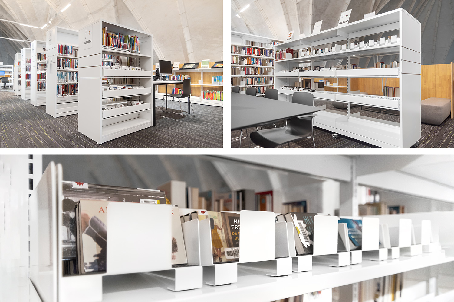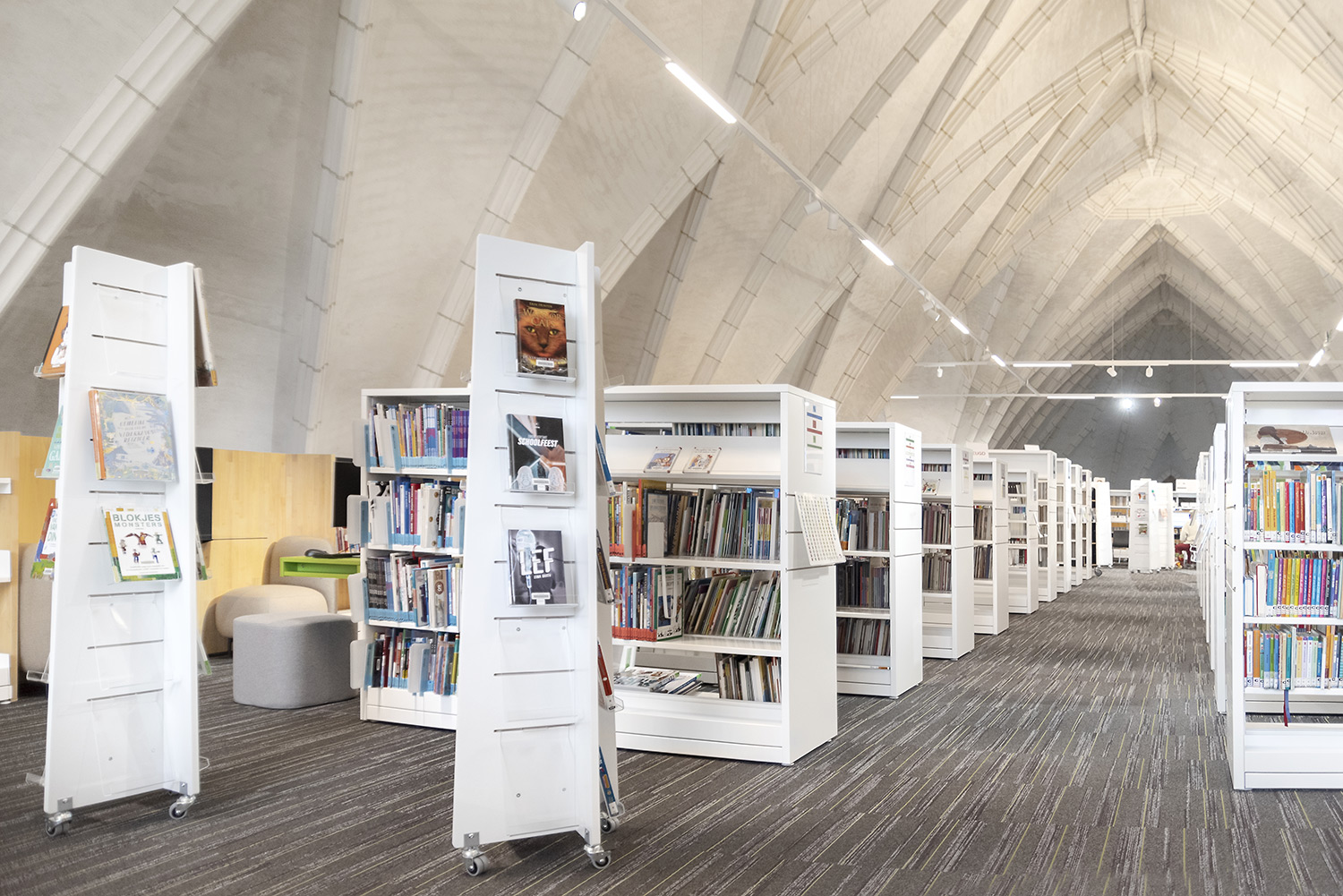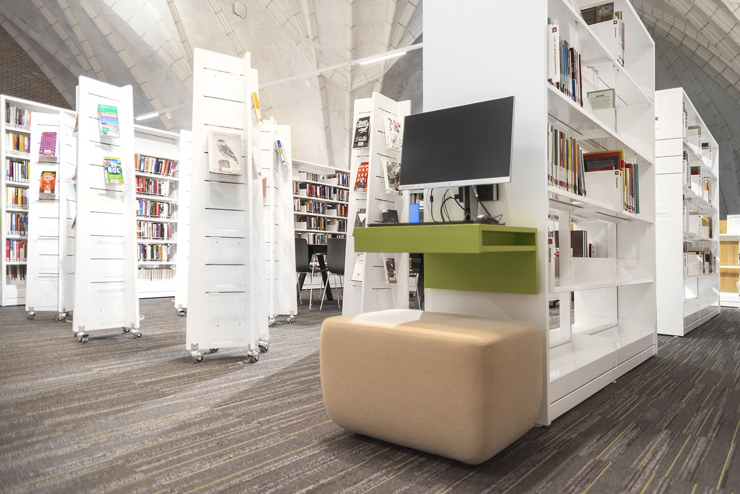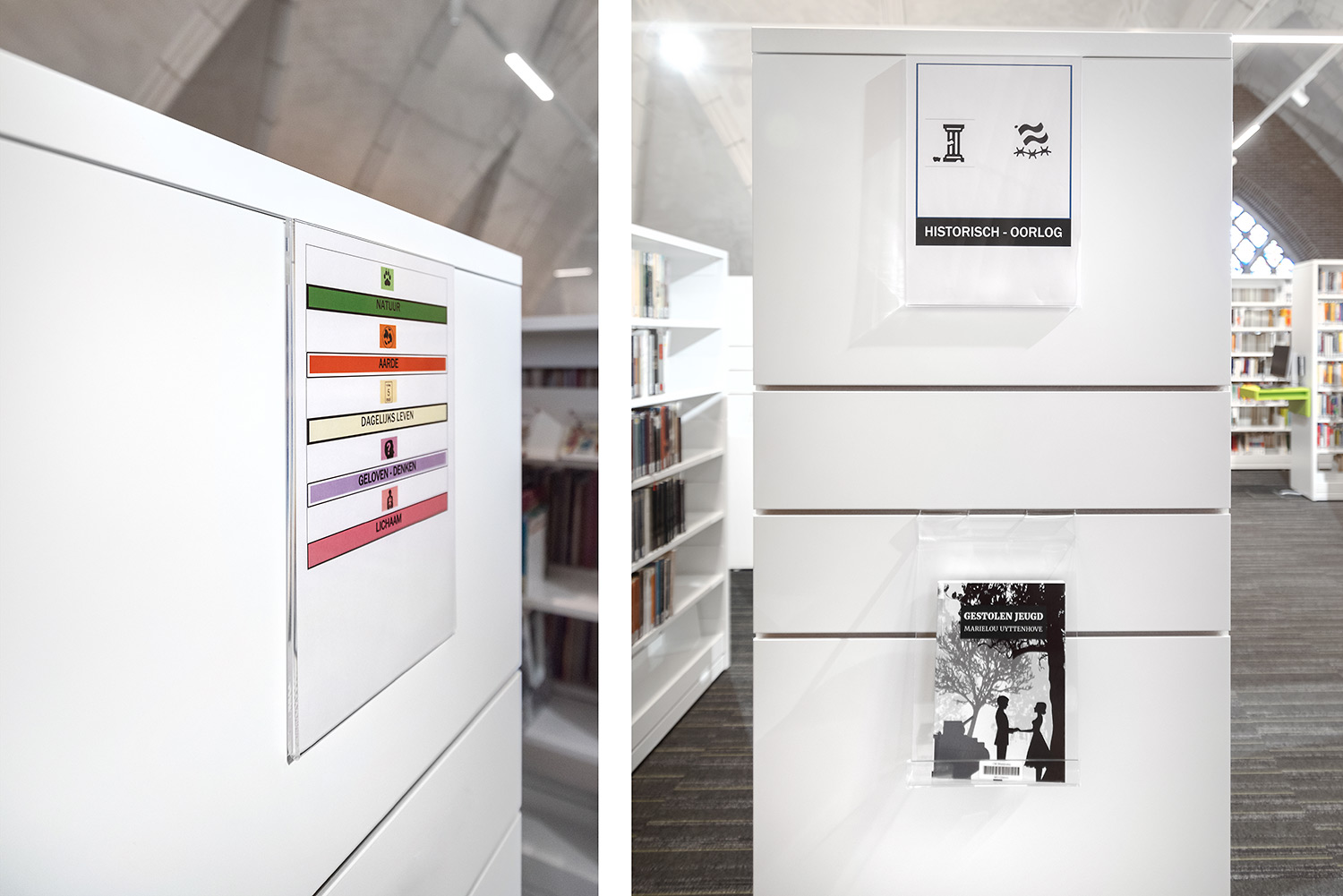 Les rayonnages de bibliothèque et les meubles blancs ou déclinés dans des teintes douces mettent véritablement les livres en valeur. L’espace offre toutefois bien d’autres perspectives, comme l’explique Nele Verfaille, bibliothécaire : « Notre collection d’ouvrages est présentée confortablement et nous avons prévu plusieurs endroits où les visiteurs peuvent s’asseoir pour lire, faire des recherches, se rencontrer ou encore assister à une activité organisée au sein de la bibliothèque. »