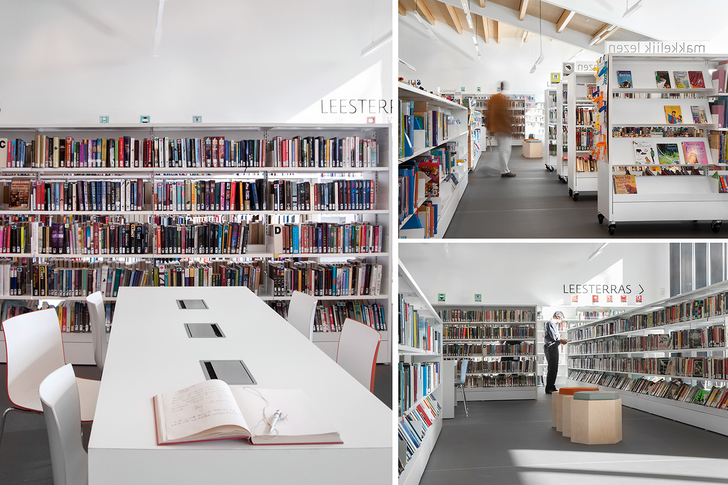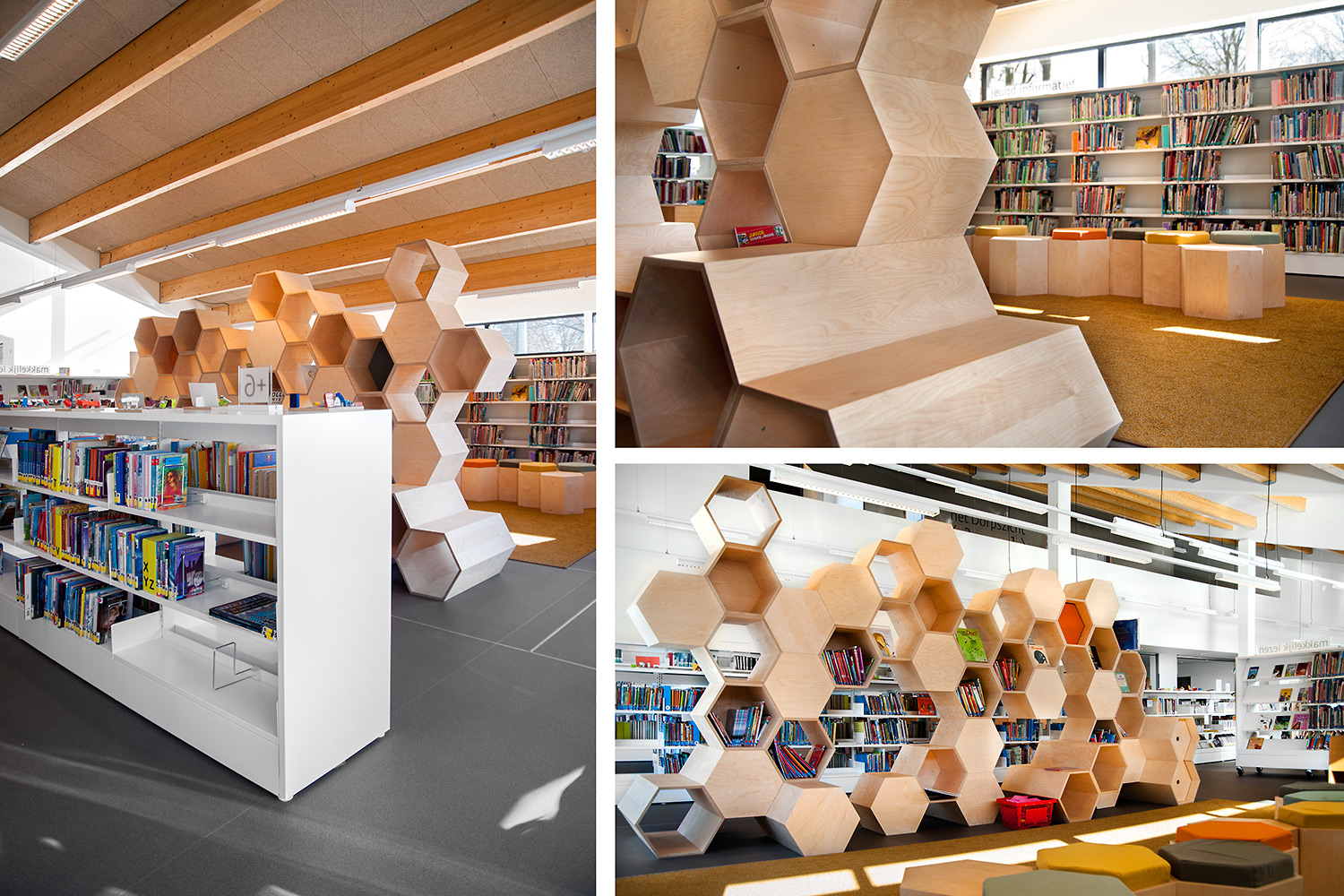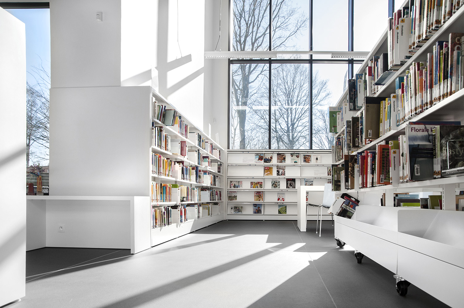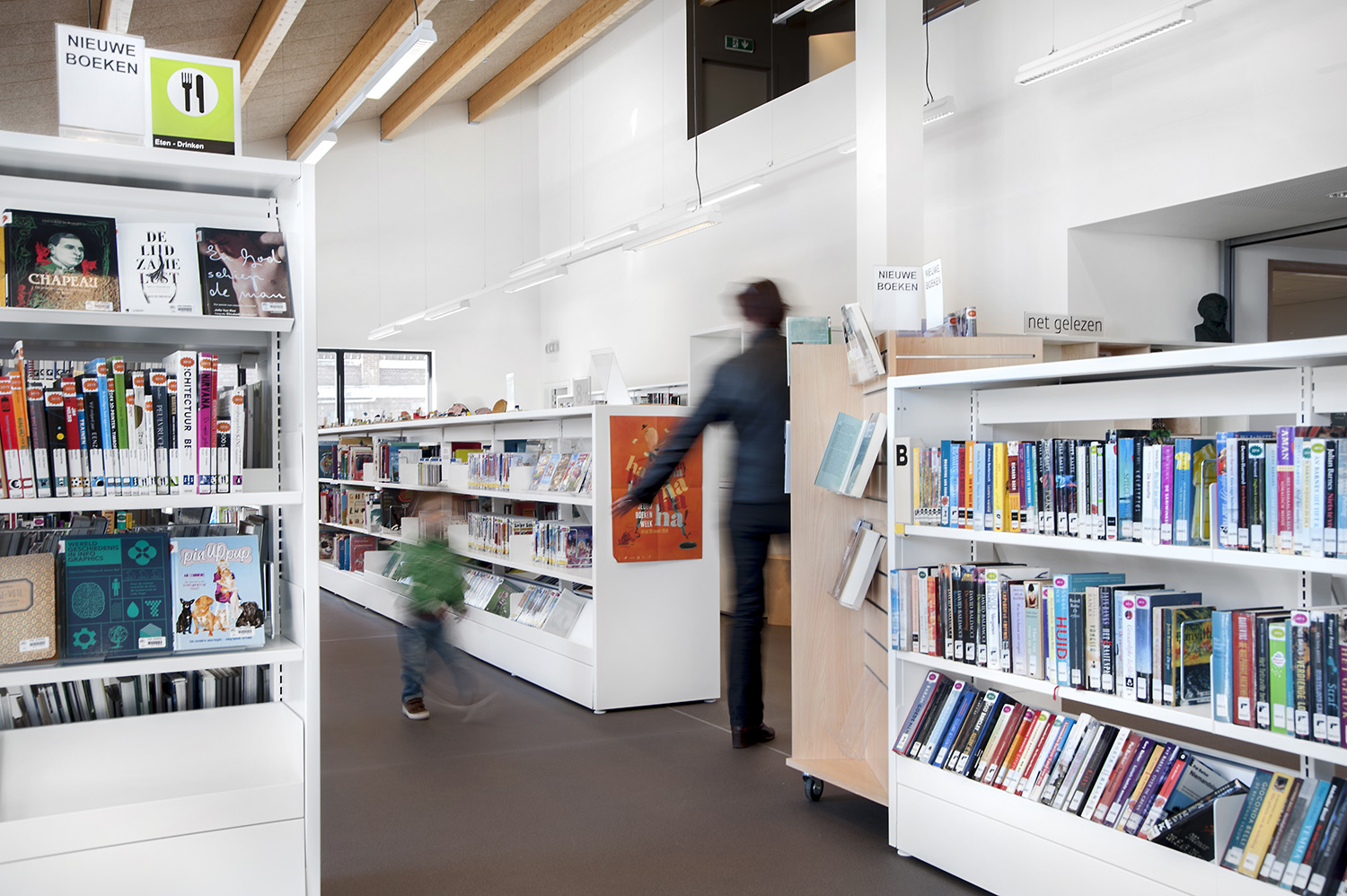 Après des années de nomadisme et un aménagement dans un bâtiment provisoire, la toute nouvelle bibliothèque publique de Zoersel a enfin ouvert ses portes le 24 janvier 2015. L’architecture unique du bâtiment et sa position centrale l’ont naturellement élue au rang de nouvelle icône urbaine. L’édifice offre des espaces de lecture confortables, il est équipé de tables destinées à l’étude et au travail informatique, et se distingue également par son mobilier personnalisé. Le contraste entre les rayonnages d’un blanc épuré et les autres modules de rangement revêtus d’une finition en bois de bouleau ainsi que l’utilisation de formes hexagonales ponctuées de notes colorées d’orange et de jaune créent une atmosphère moderne, reposante et particulièrement accueillante pour les visiteurs. Avec un local informatique séparé et différentes salles de réunion, la bibliothèque répond parfaitement aux besoins de sa communauté de lecteurs et mérite définitivement sa nouvelle place au cœur du centre-ville.