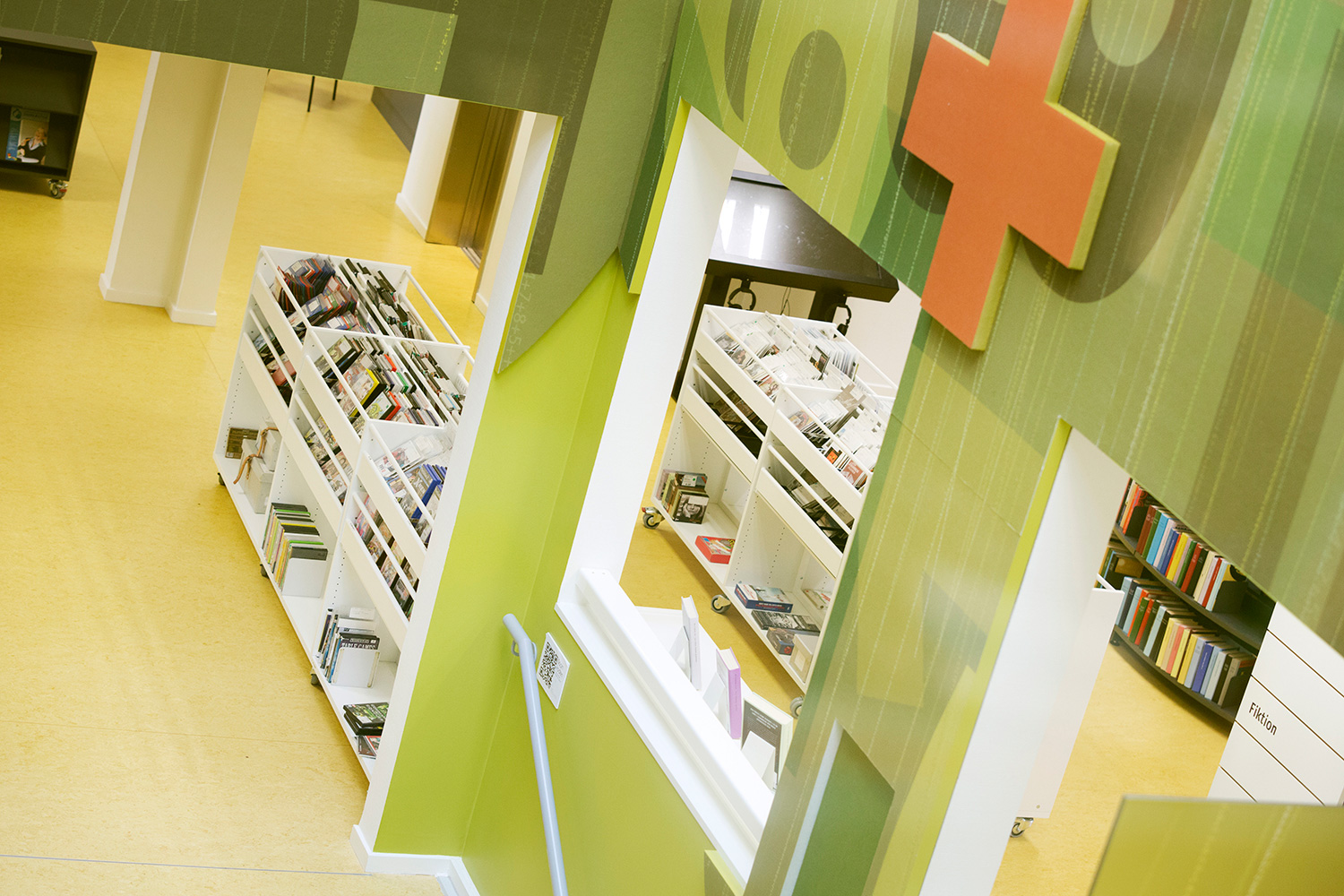 L’architecte d’intérieur Kirsten Brandt Jørgensen de Lammhults Biblioteksdesign A/S a notamment puisé son inspiration dans la décoration des escaliers et des espaces de promenade de Peter Holst ainsi que dans les nombreux tilleuls que compte la ville de Christianfeld. Des tapis en forme de feuilles de tilleul ont notamment été réalisés. L’aménagement du rez-de-chaussée prévoit des espaces suffisants pour les retours de livres, les prêts et les réservations ainsi que pour le matériel et les zones dédiées aux petits ou encore pour le département adultes consacré aux fictions. Le département jeunesse arbore une grande bibliothèque de forme arrondie, comprenant des niches de part et d’autre pour le rangement et la présentation des livres pour enfants. Un imposant fauteuil de conteur crée un environnement merveilleux pour petits et grands.