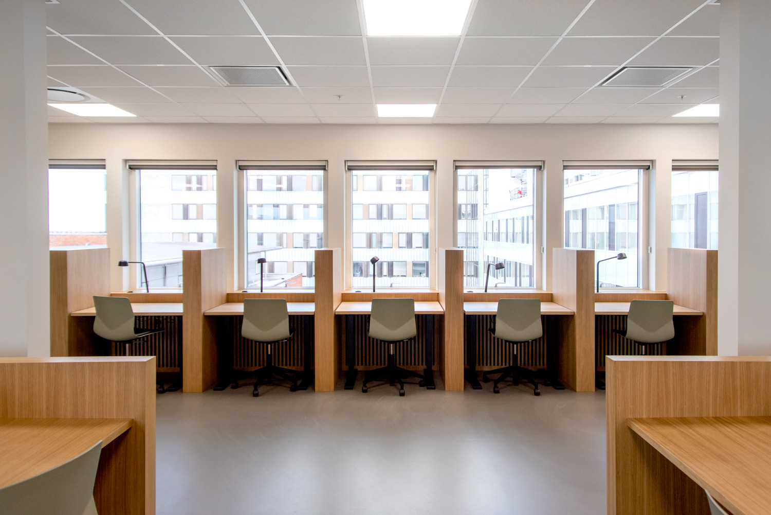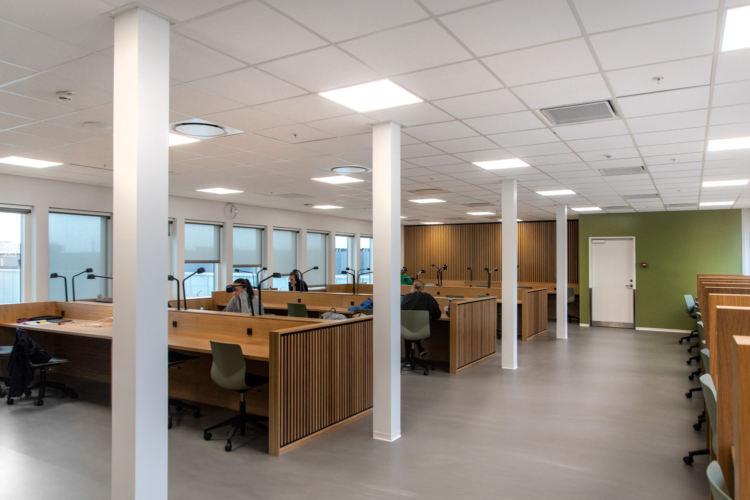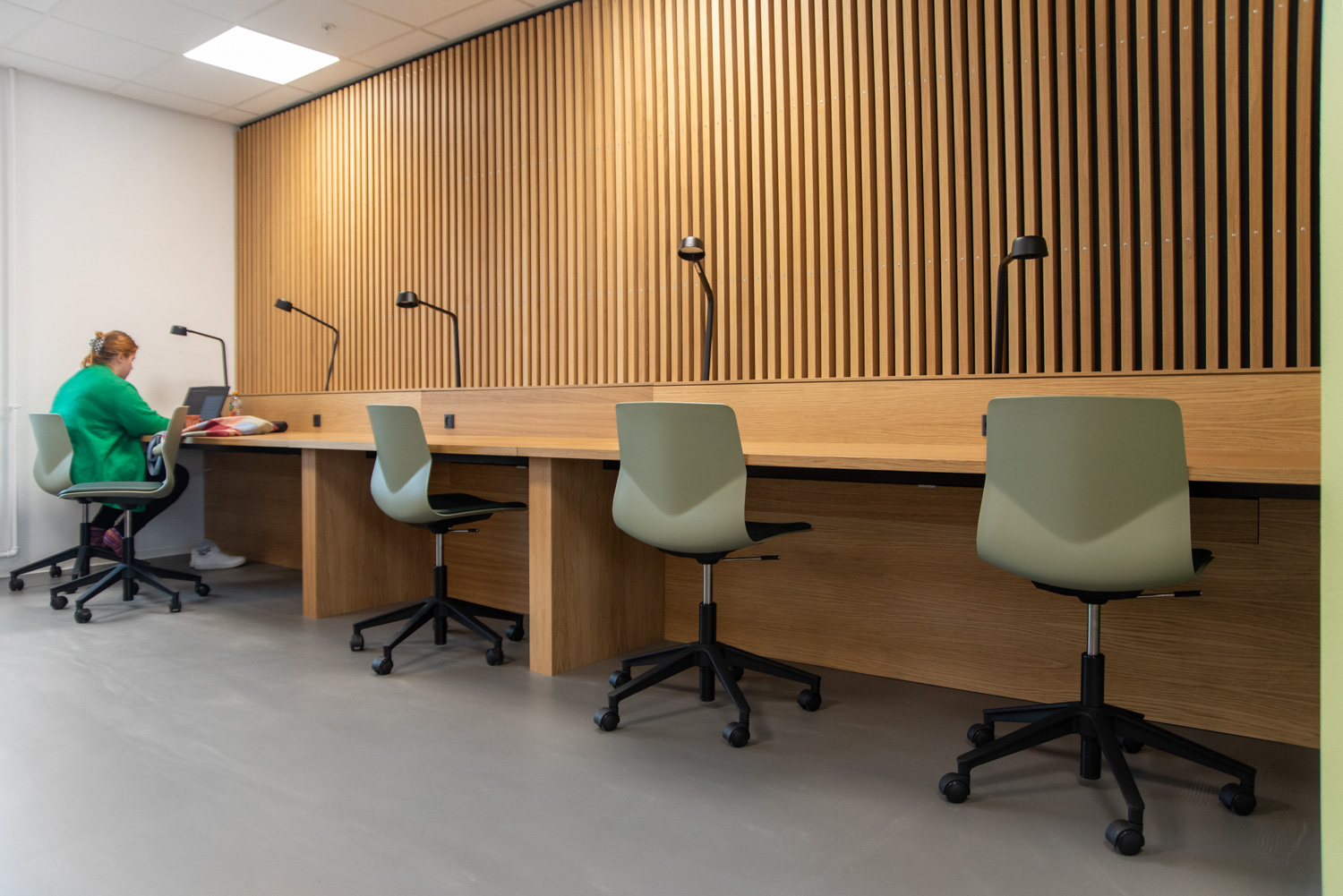 La chaleur du bois contraste avec le verre et le béton du bâtiment. Au fil des ans, le bois se patinera, ce qui donnera une apparence " authentique " et singulière. Nous avons également fourni les systèmes d'étagères courbes ainsi que les grandes tables de travail en chêne où les étudiants peuvent s'asseoir, soit en groupe, soit individuellement. Tout le câblage a été soigneusement dissimulé dans la structure des tables. Les séparations entre les tables créent des espaces de calme et de concentration. Les étudiants travaillent dans un environnement agréable et confortable où les matériaux chaleureux et la lumière naturelle produisent un très bel effet.