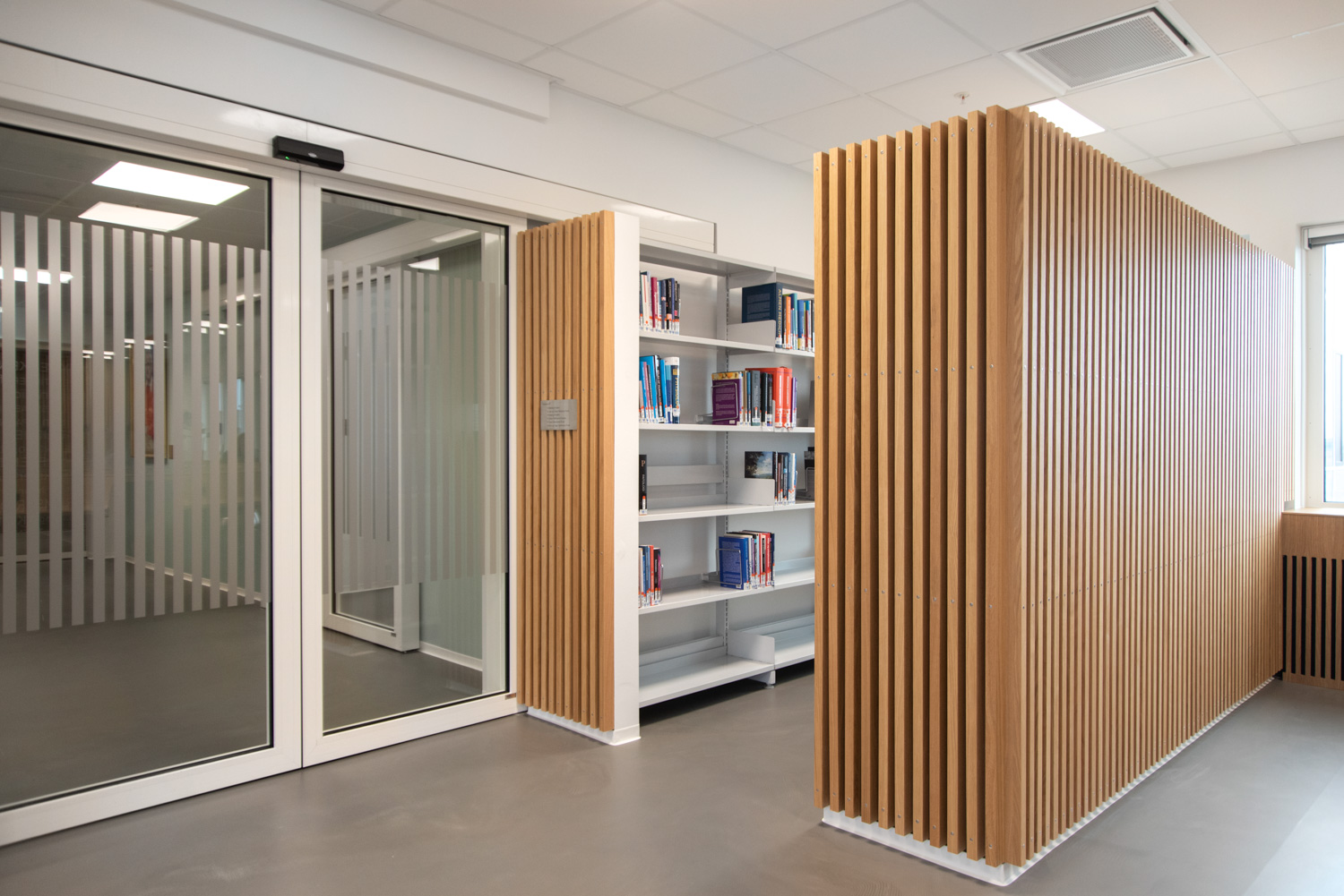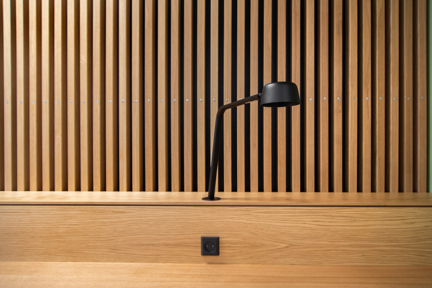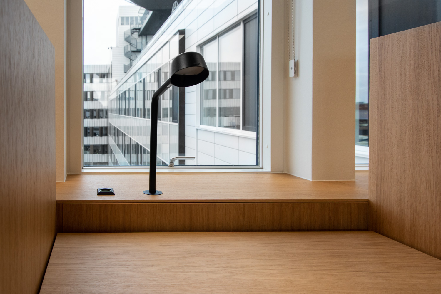 La chaleur du bois contraste avec le verre et le béton du bâtiment. Au fil des ans, le bois se patinera, ce qui donnera une apparence " authentique " et singulière. Nous avons également fourni les systèmes d'étagères courbes ainsi que les grandes tables de travail en chêne où les étudiants peuvent s'asseoir, soit en groupe, soit individuellement. Tout le câblage a été soigneusement dissimulé dans la structure des tables. Les séparations entre les tables créent des espaces de calme et de concentration. Les étudiants travaillent dans un environnement agréable et confortable où les matériaux chaleureux et la lumière naturelle produisent un très bel effet.