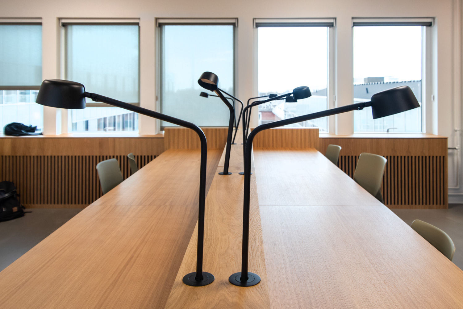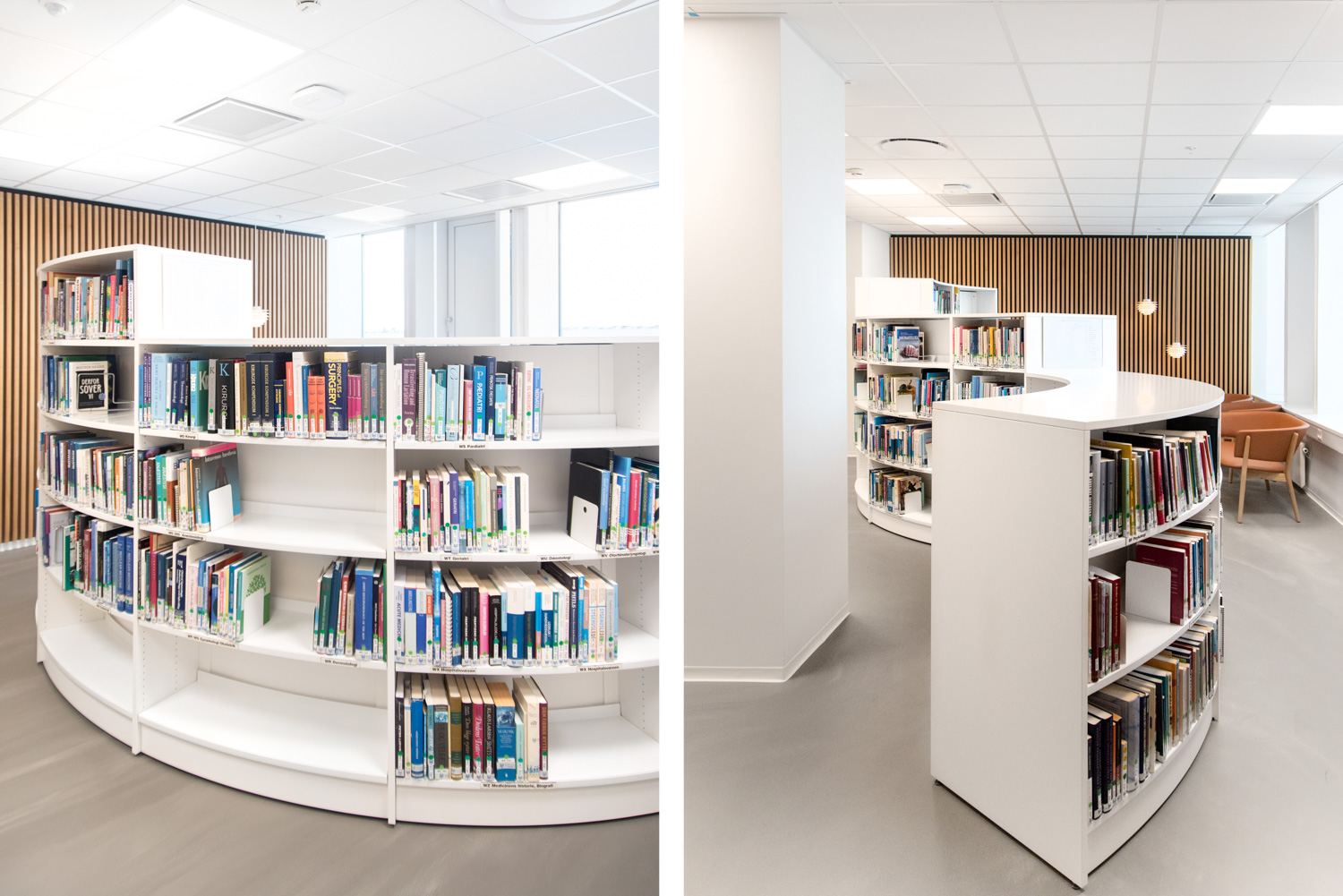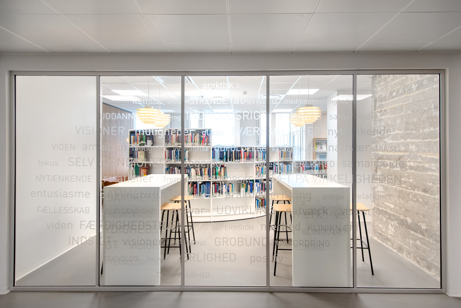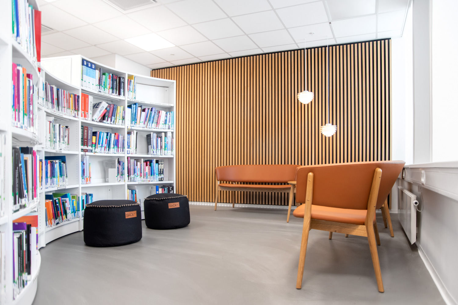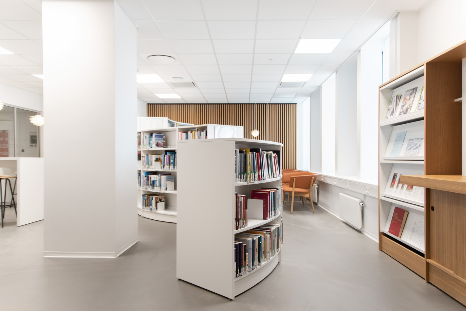 Avec notre fidèle partenaire Bygholm Inventar & Møbelsnedkeri, nous avons imaginé et fabriqué un mobilier spécial en chêne qui donne à la bibliothèque l'aspect d'une belle unité enveloppante et chaleureuse et le sentiment d'être assis comme "en extérieur".