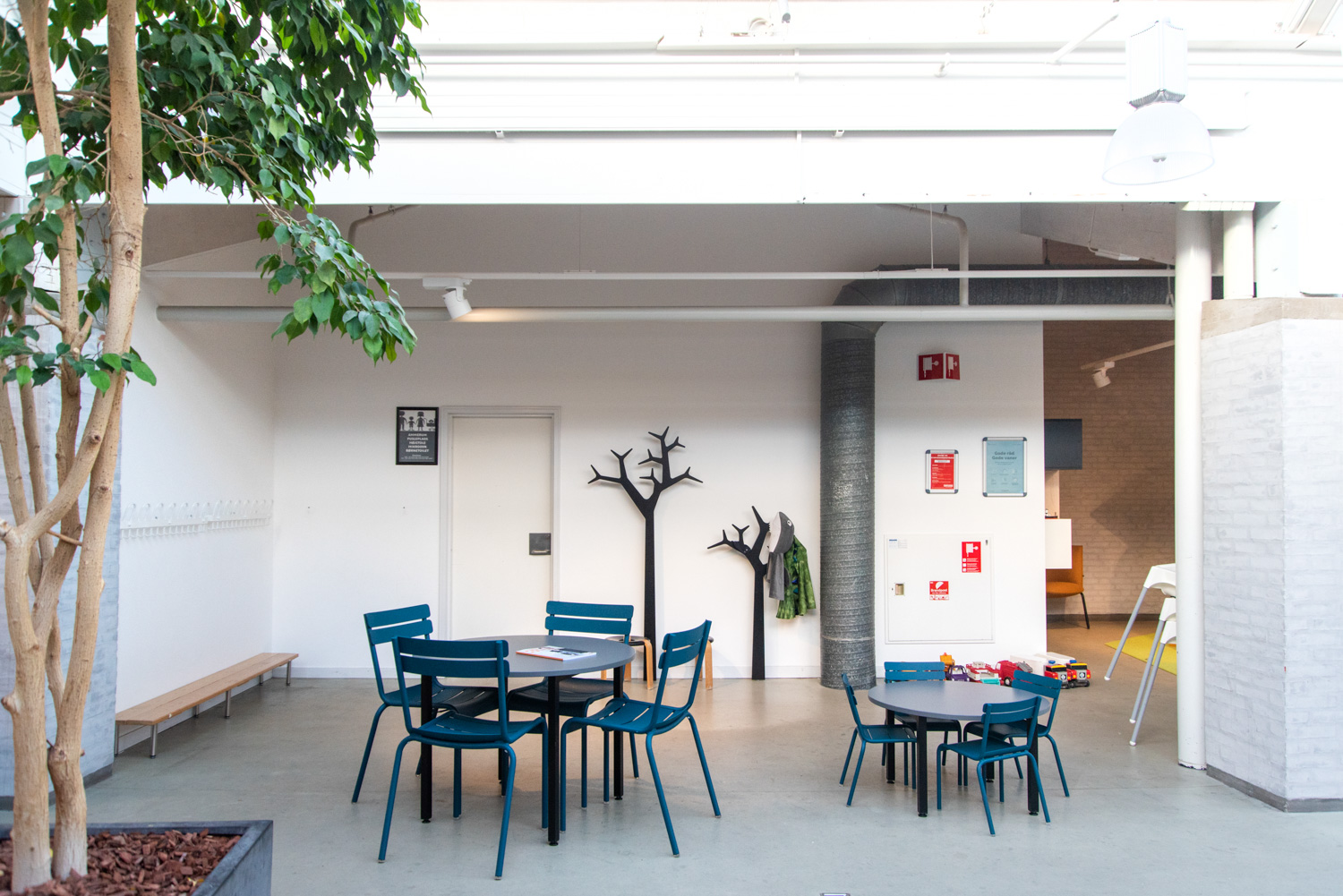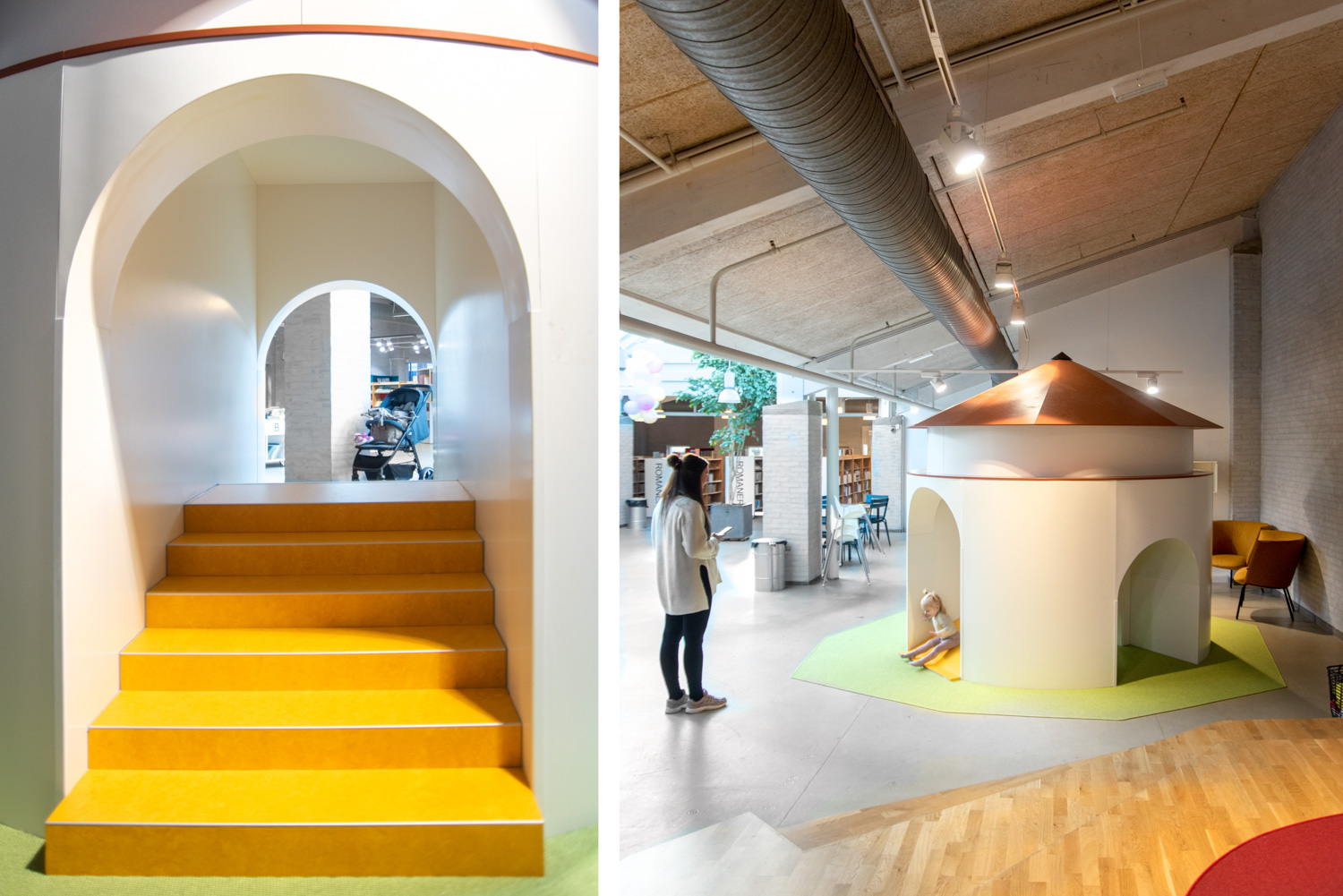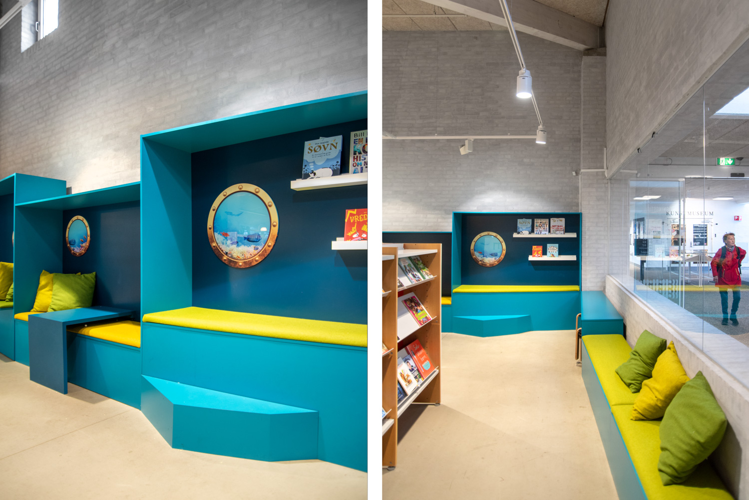 Pour les plus petits, l'accent a été mis sur l'aménagement d'un espace de jeux et de lecture accueillant également les parents. Il y a une tour appelée "Krudttårnet" (baril de poudre), une miniature d’un ancien magasin de poudre à canon de la ville, sur laquelle les enfants sont ravis de grimper et de glisser. De ravissantes « niches » de lecture turquoise, réalisées sur mesure, ont été dotées de hublots donnant l'impression d'être sous l'eau. Les parents ou les grands-parents peuvent s'installer dans les différents salons et profiter des activités des enfants. En outre, la bibliothèque dispose d'un nouvel espace avec tables de restauration et armoire-vestiaire.