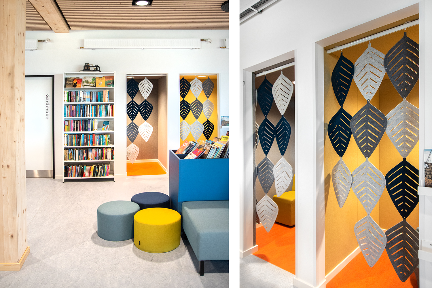 Les visions de l'école en matière de climat et de durabilité sont respectées avec nos étagères et notre mobilier nordique en bois certifié écologique et FSC. De même, tous les revêtements des canapés et des poufs sont en matériaux recyclés.