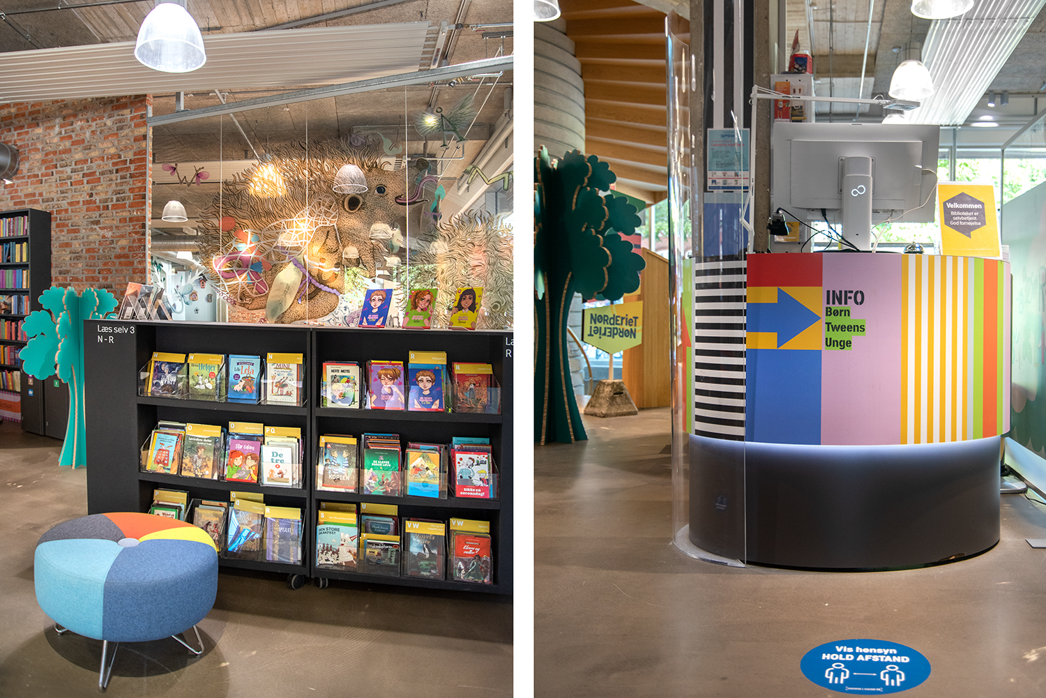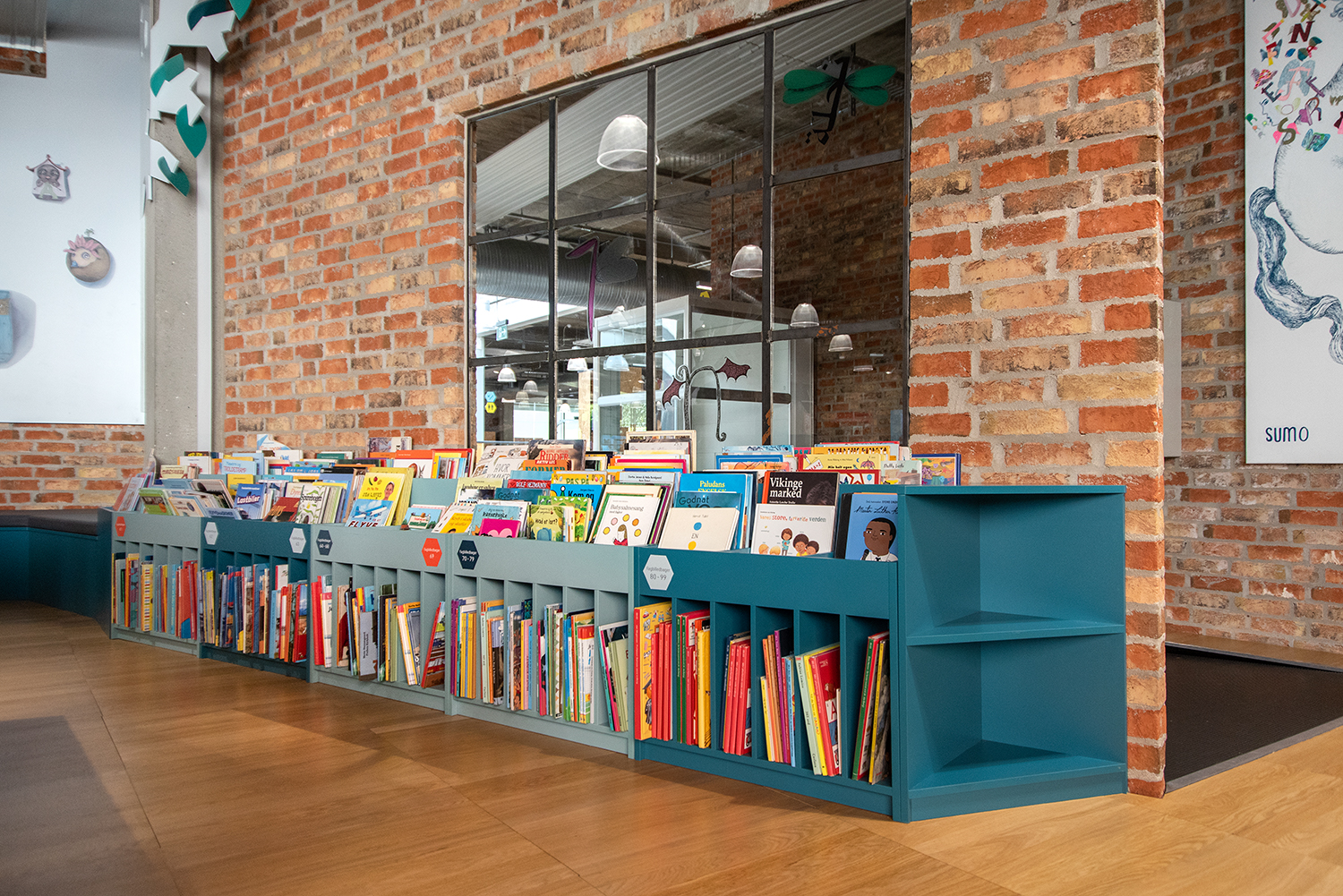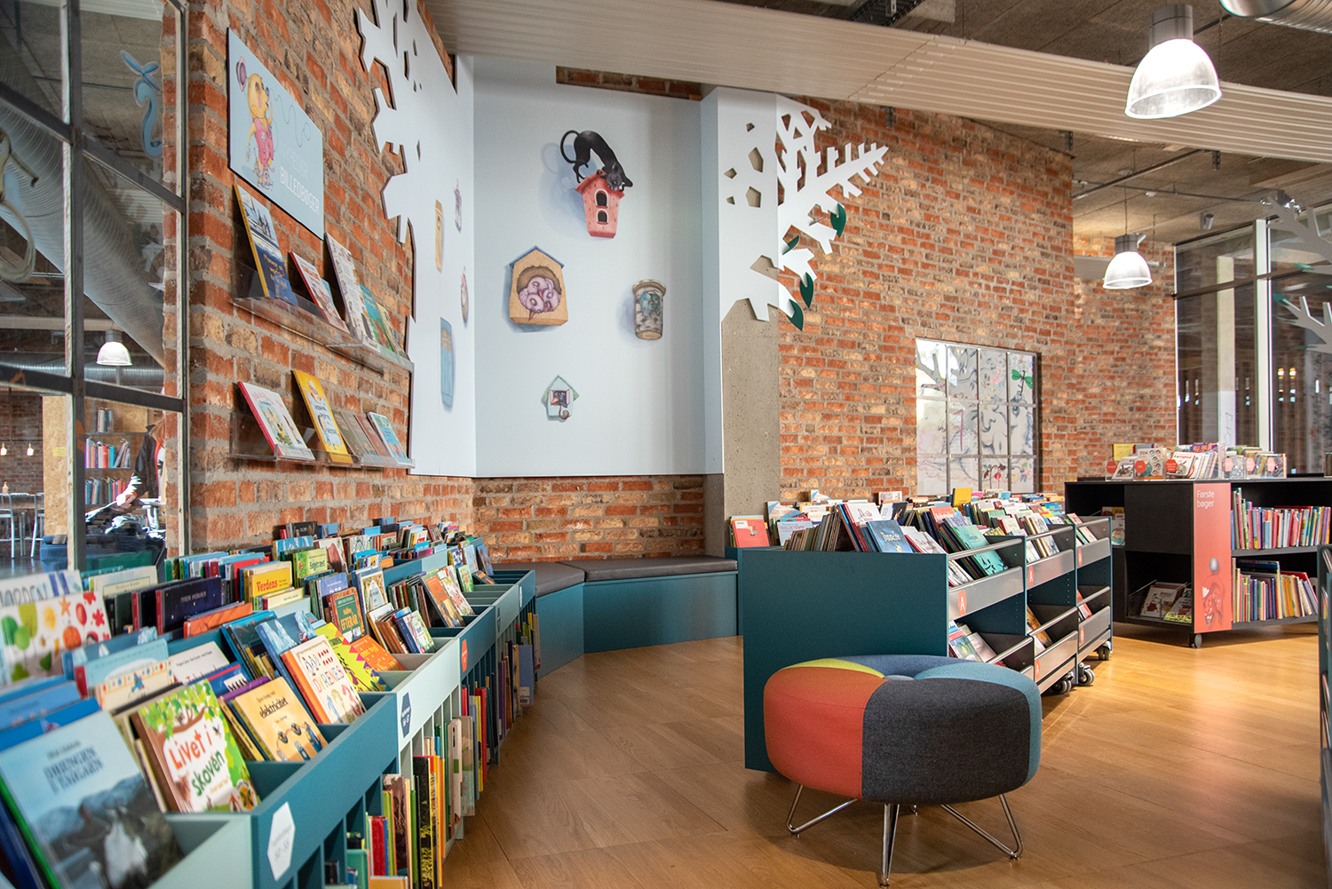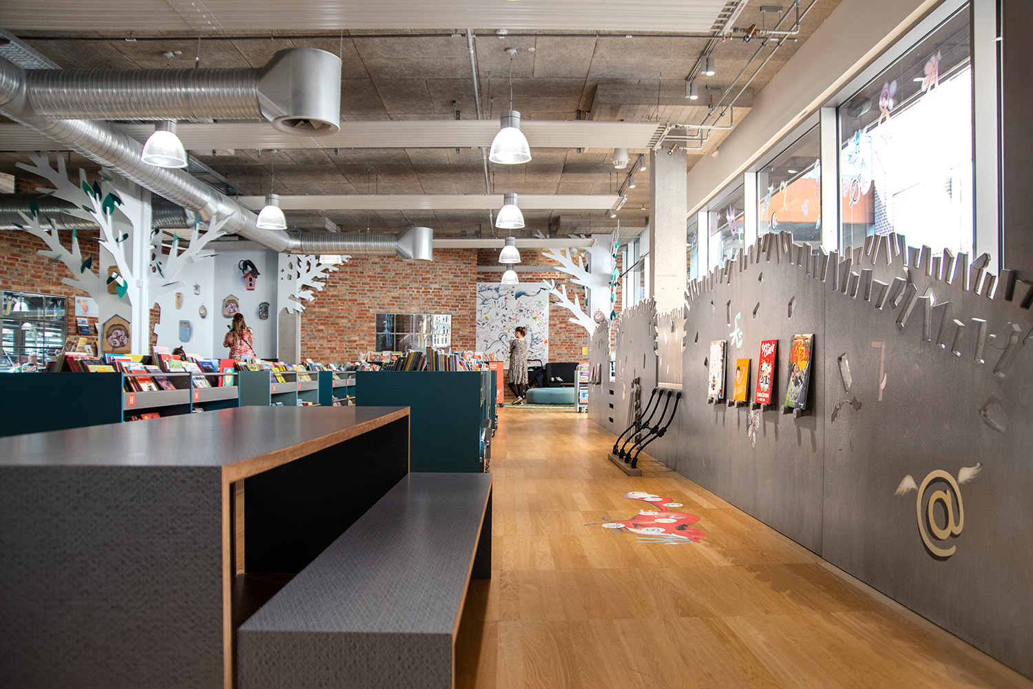 En 2021, l'espace enfants a été rénové avec des bacs multimedia aux belles couleurs pastel. Le nouveau look doux contraste joliment avec l'environnement brut, style new-yorkais, existant.