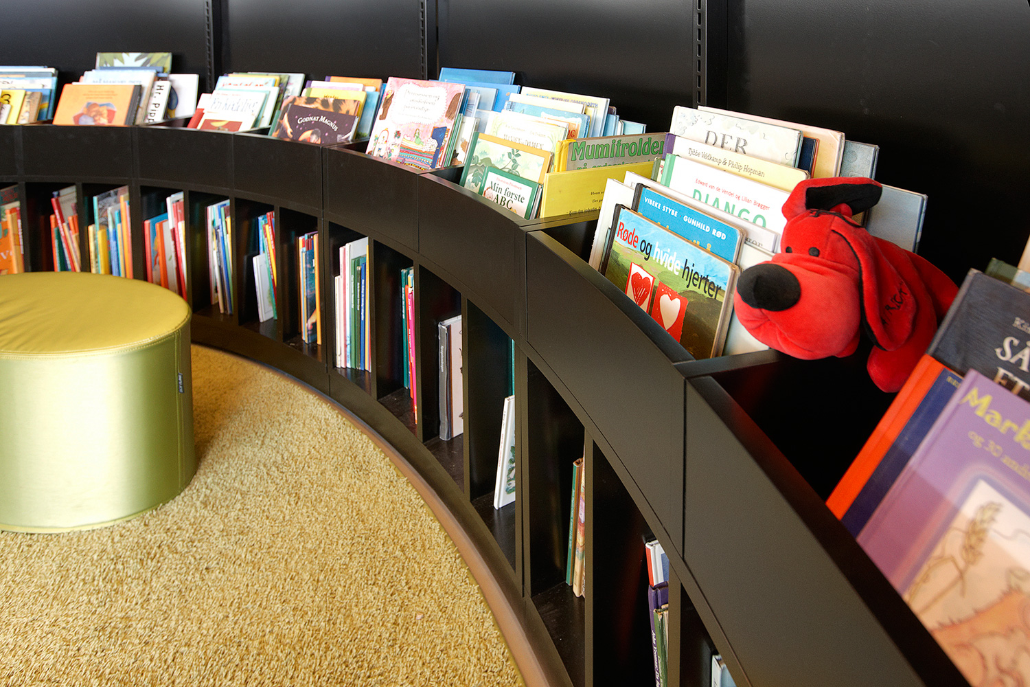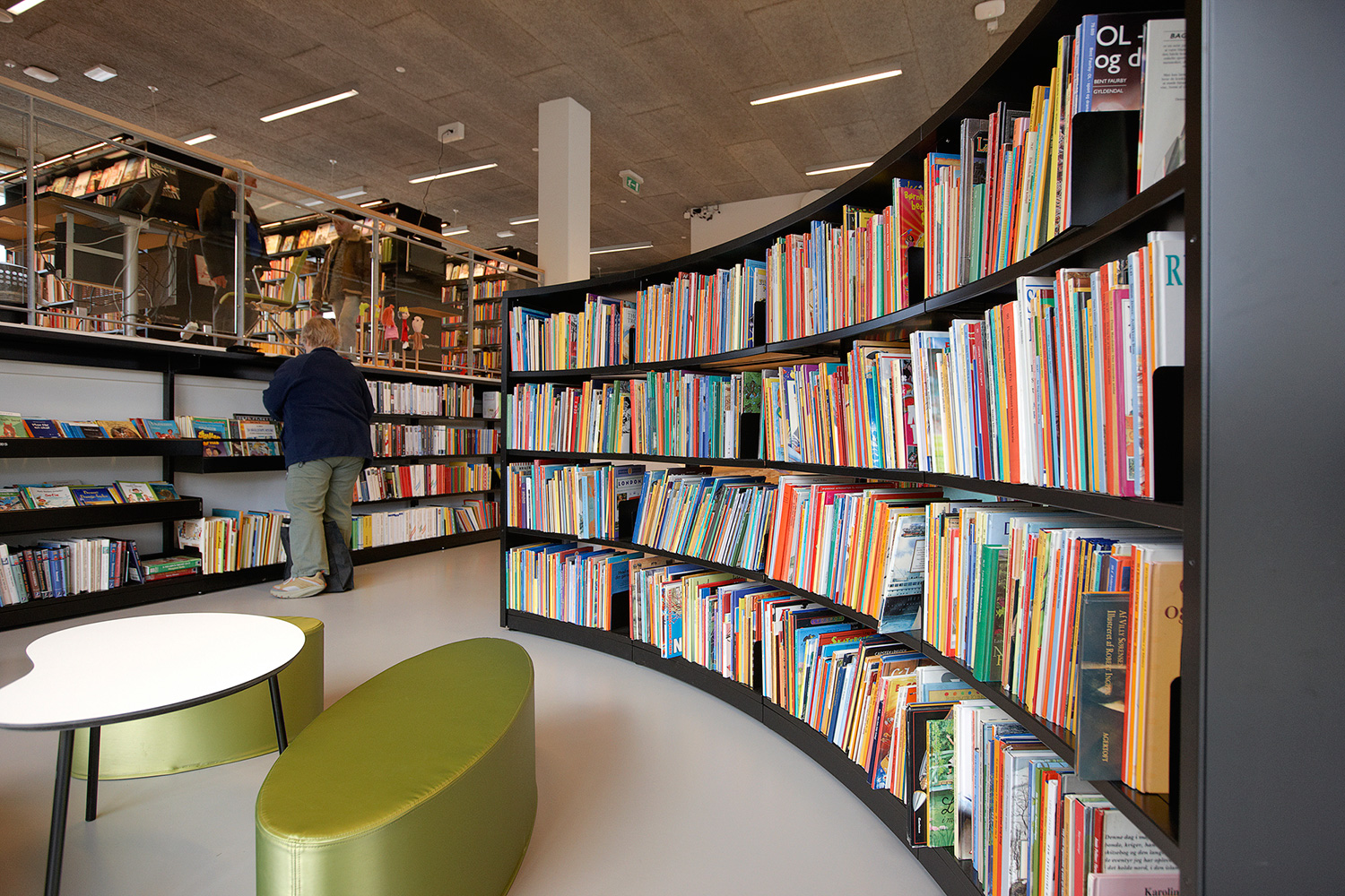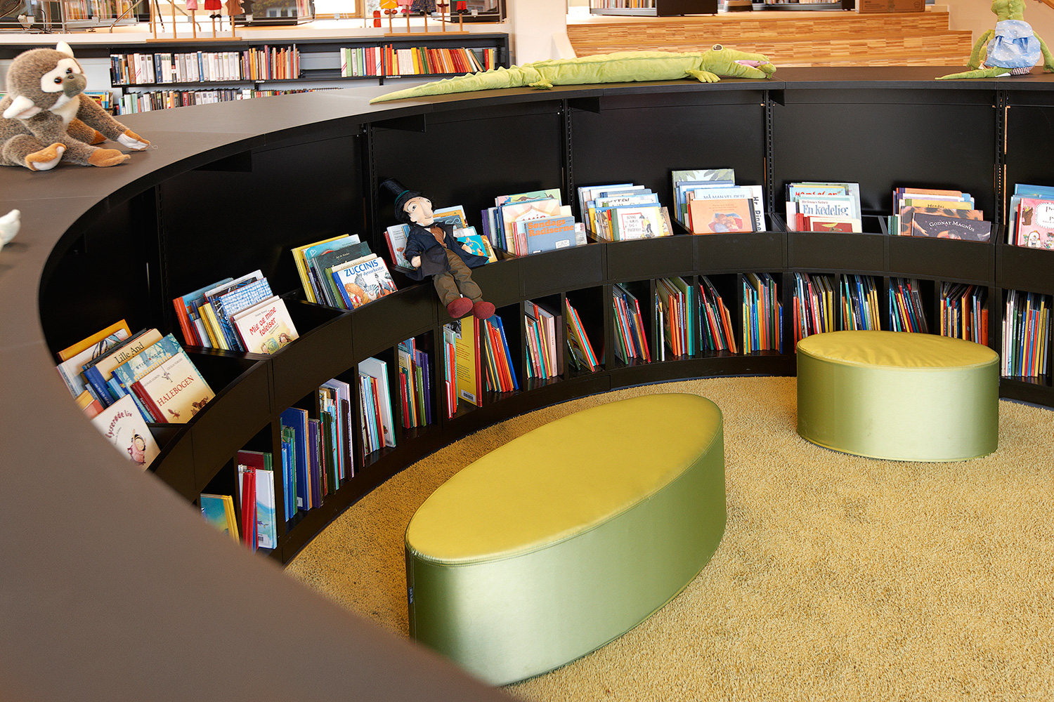 La bibliothèque est équipée avec la gamme «classic London» avec panneaux d’extrémités et de couvertures en médium laqué. Un luminaire est intégré dans les chants des panneaux de couverture. Le système intègre également des tables dans les rayonnages ainsi que des rayonnages circulaires à destination de l’espace dédié spécifiquement aux enfants.