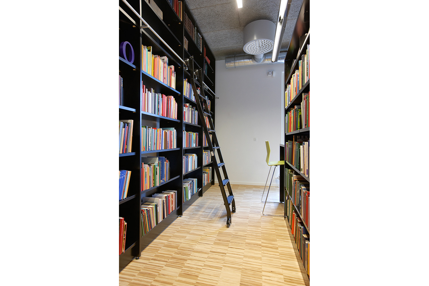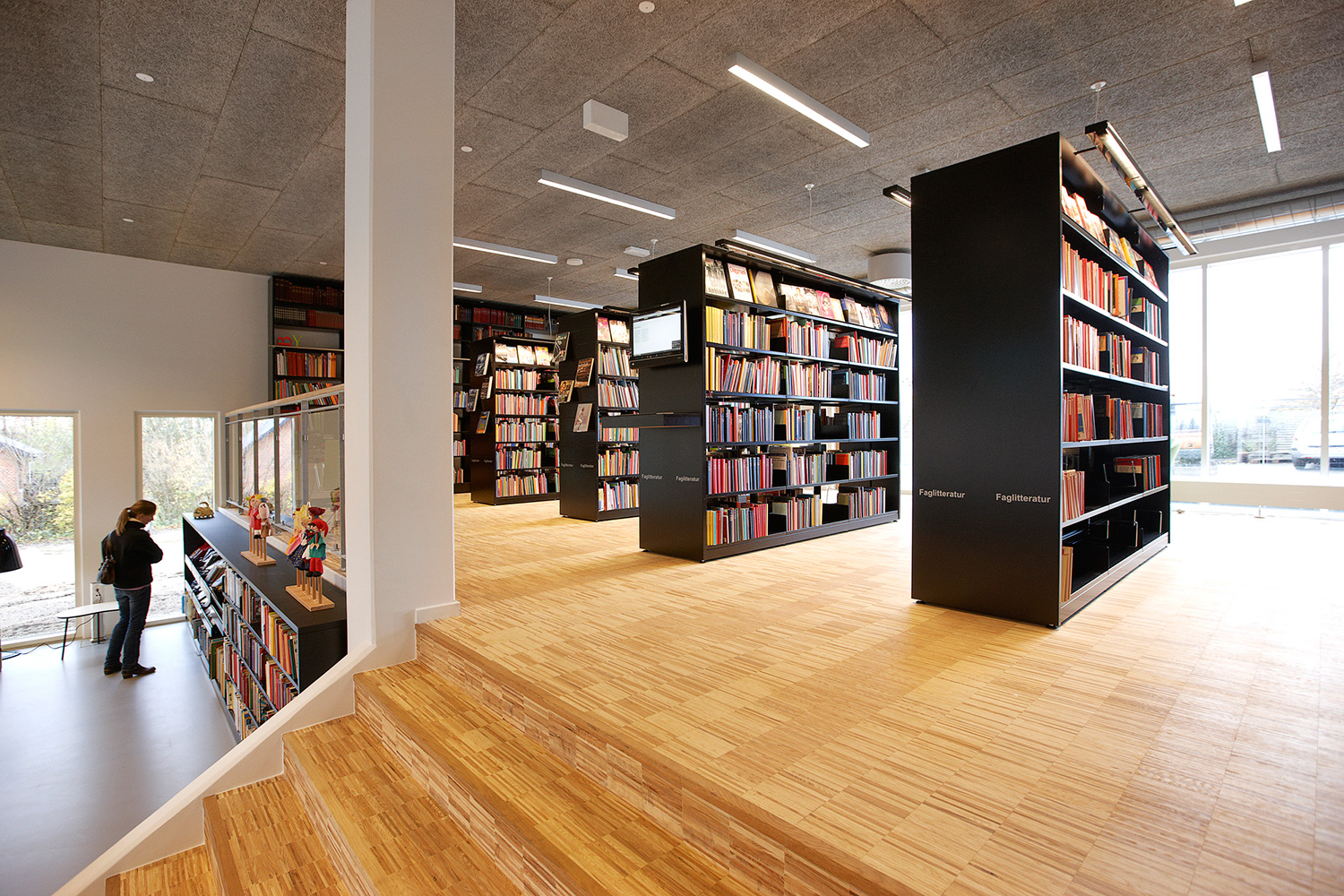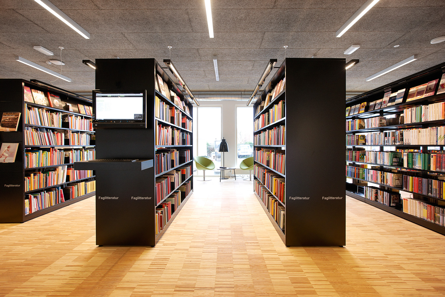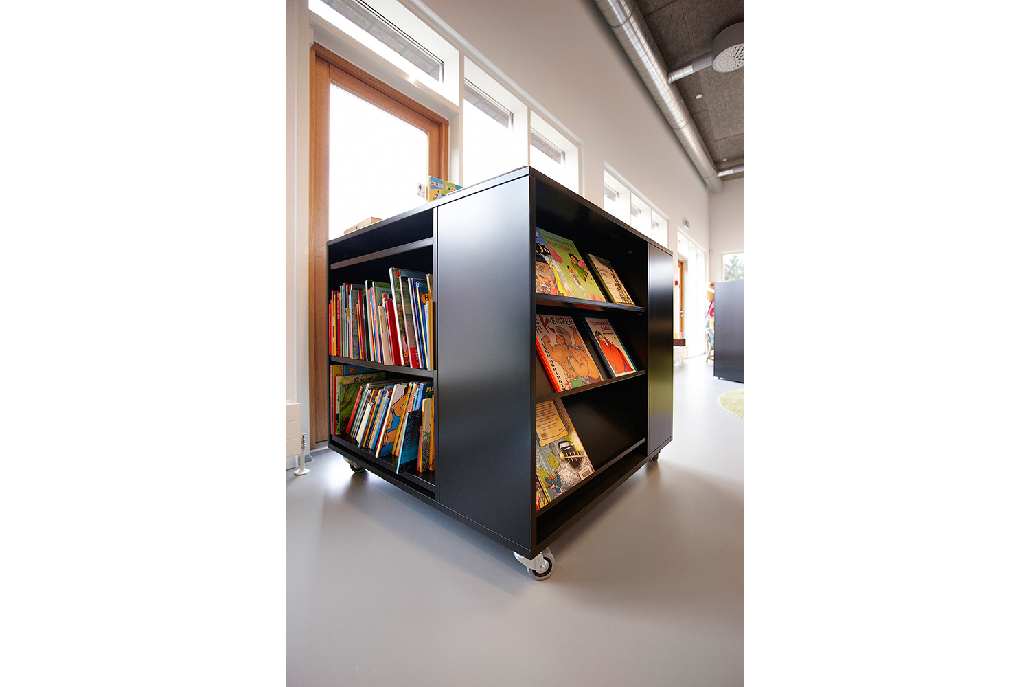 La bibliothèque est équipée avec la gamme «classic London» avec panneaux d’extrémités et de couvertures en médium laqué. Un luminaire est intégré dans les chants des panneaux de couverture. Le système intègre également des tables dans les rayonnages ainsi que des rayonnages circulaires à destination de l’espace dédié spécifiquement aux enfants.