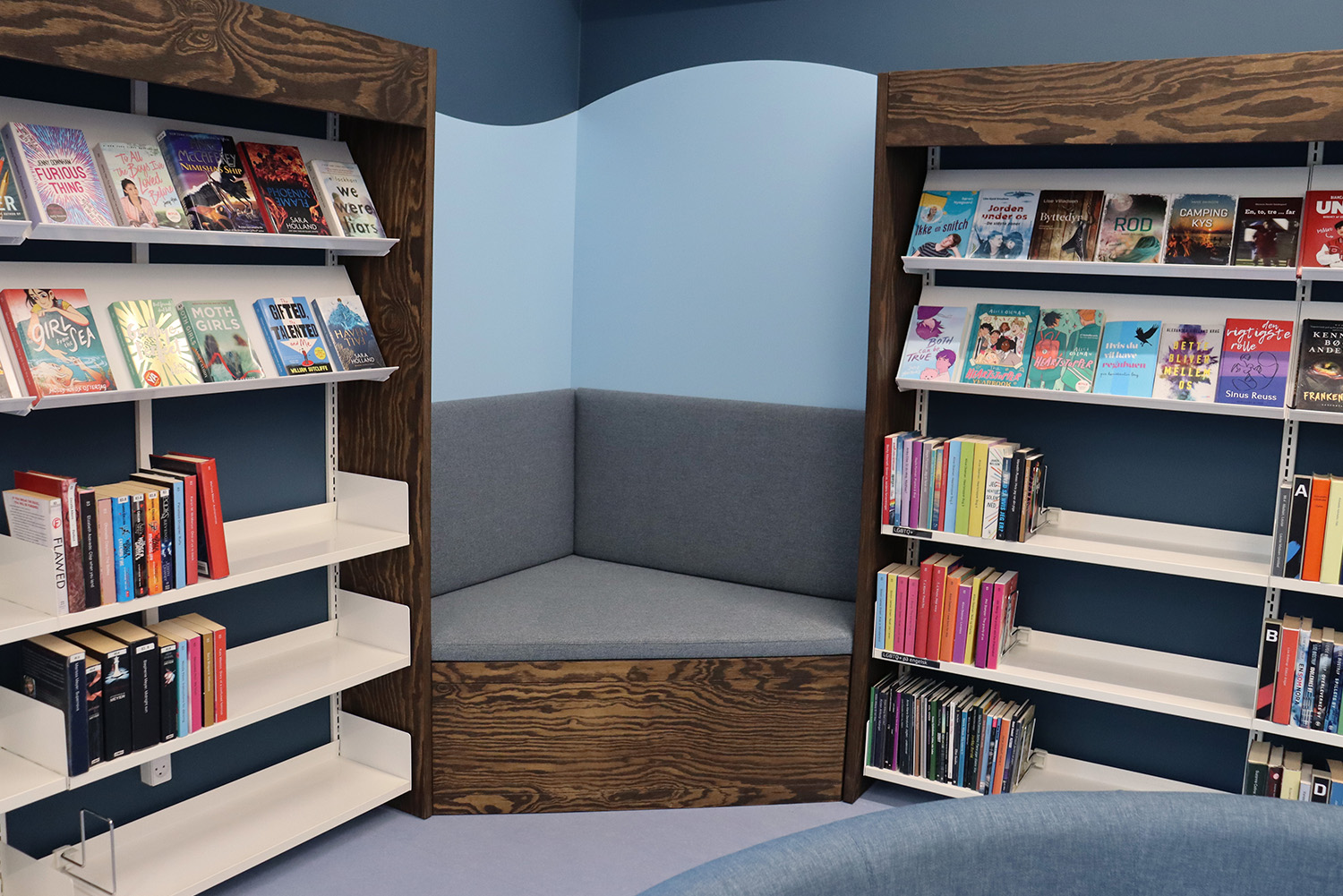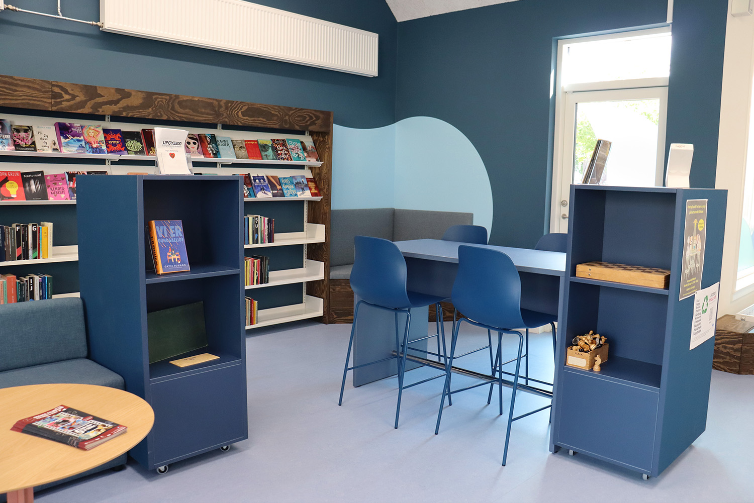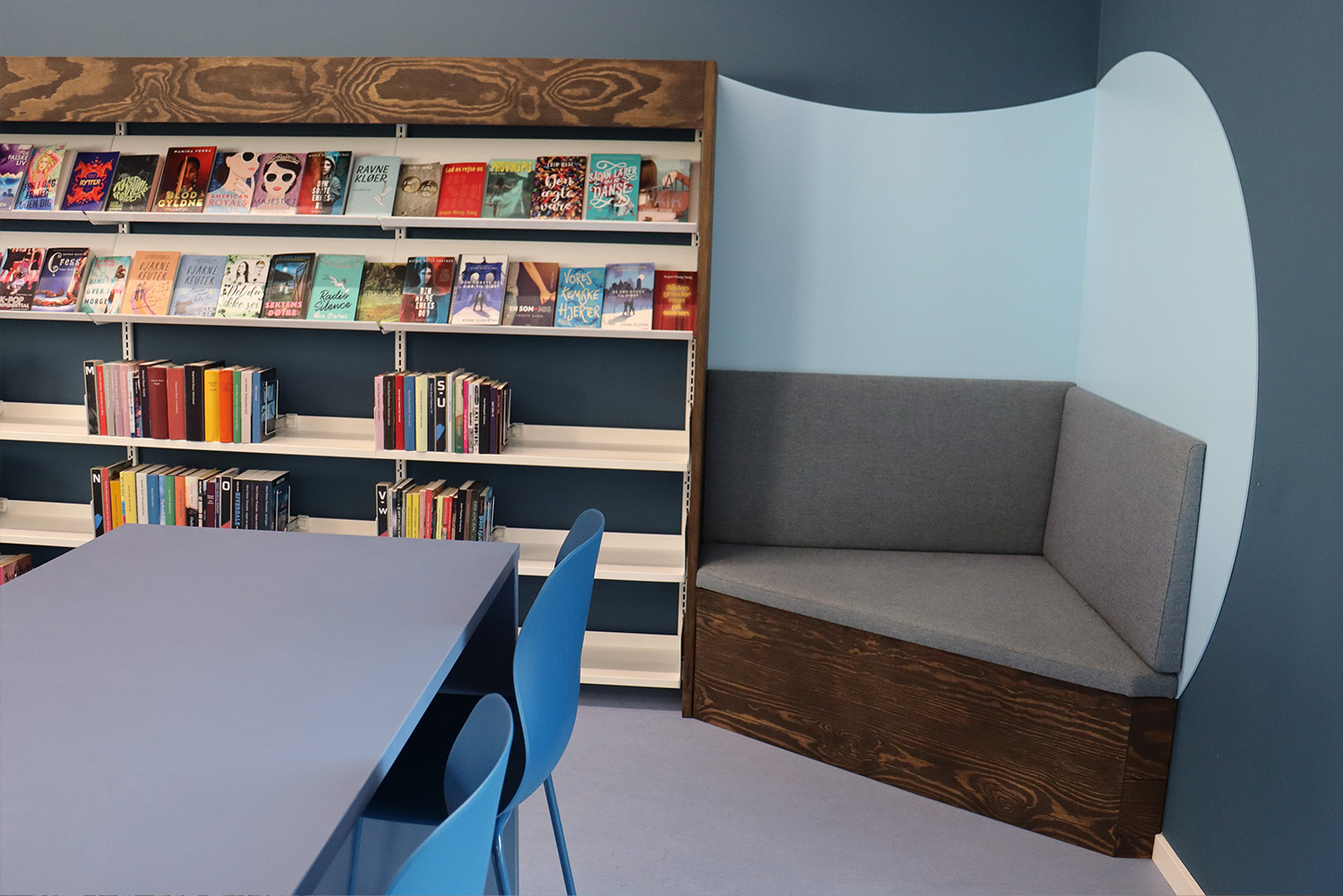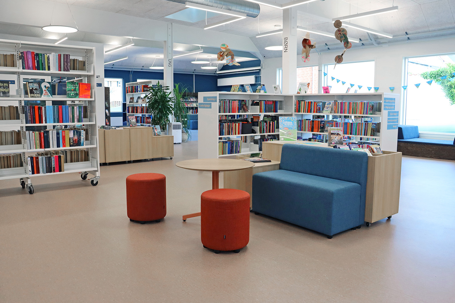Son design sur-mesure puise son inspiration dans le patrimoine maritime de Kerteminde, avec le navire de Ladby comme point central du thème de la bibliothèque. Une palette apaisante de bleu et de blanc crée une atmosphère accueillante pour les visiteurs de tous âges. La bibliothèque est intelligemment divisée en plusieurs zones distinctes, proposant aussi bien des espaces de lecture silencieux que des espaces créatifs et dynamiques, ainsi qu’une toute nouvelle section dédiée aux enfants. Cette disposition soigneusement réfléchie garantit à chacun de trouver un lieu propice à l’apprentissage et à l’inspiration.