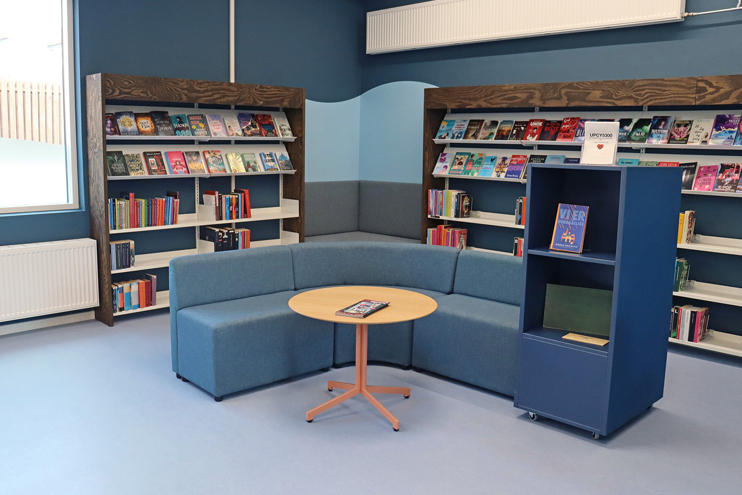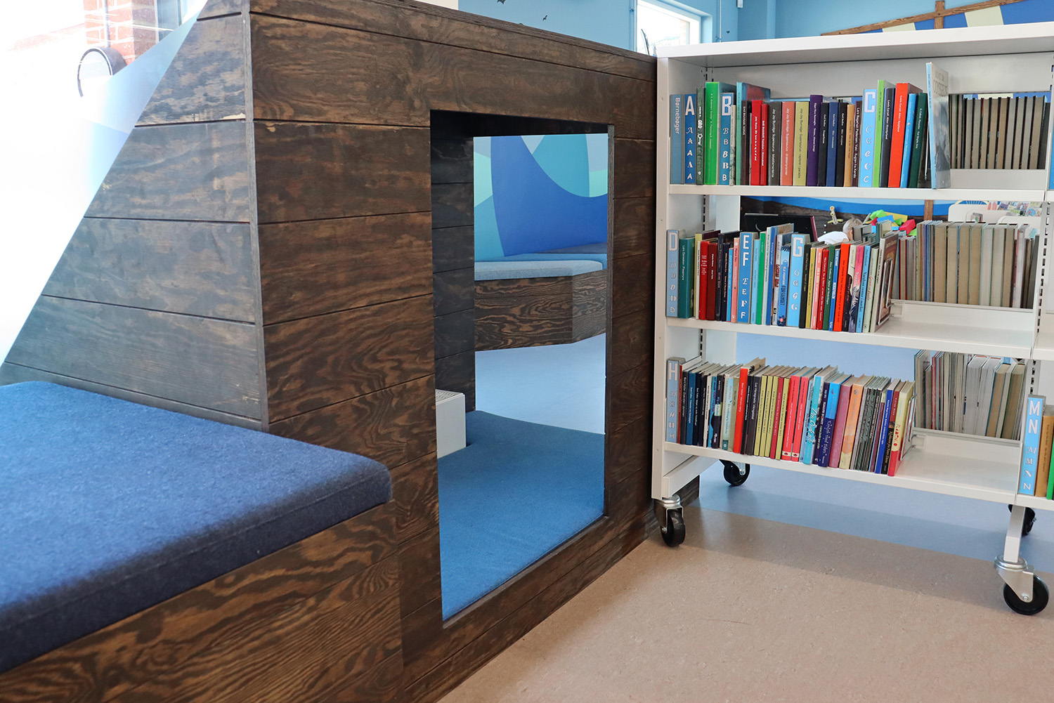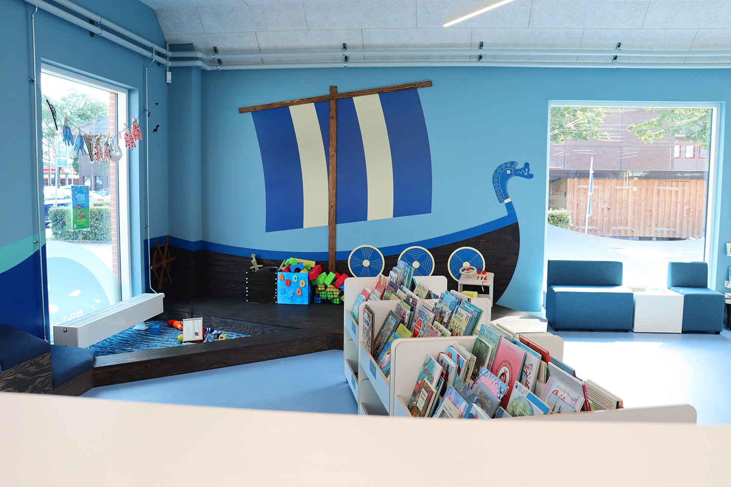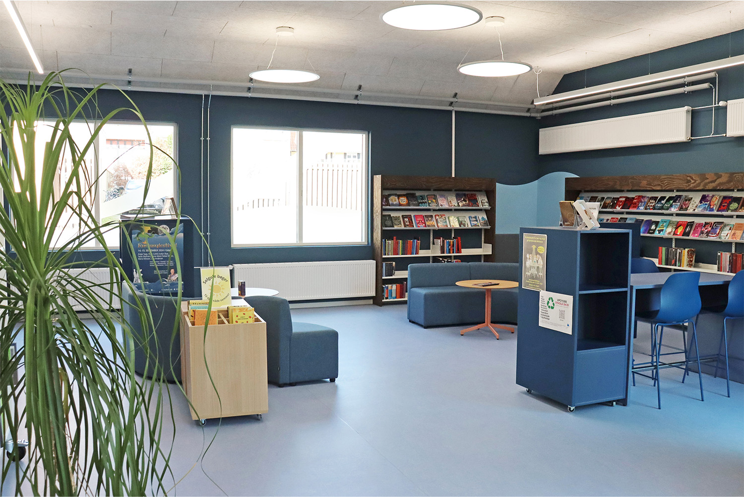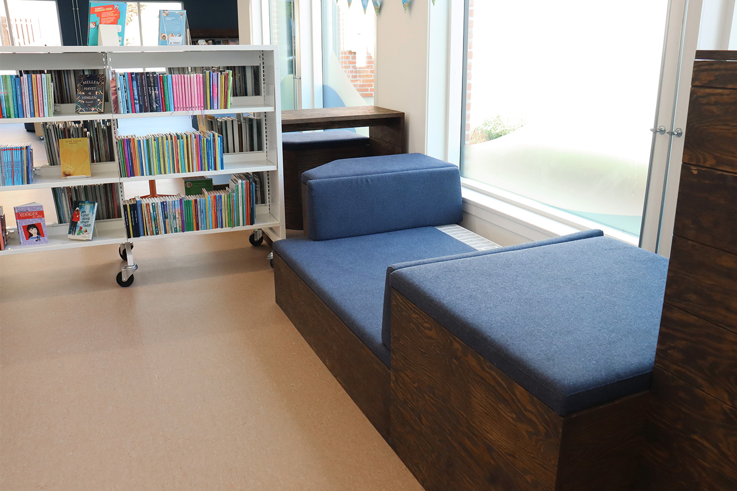 Son design sur-mesure puise son inspiration dans le patrimoine maritime de Kerteminde, avec le navire de Ladby comme point central du thème de la bibliothèque. Une palette apaisante de bleu et de blanc crée une atmosphère accueillante pour les visiteurs de tous âges. La bibliothèque est intelligemment divisée en plusieurs zones distinctes, proposant aussi bien des espaces de lecture silencieux que des espaces créatifs et dynamiques, ainsi qu’une toute nouvelle section dédiée aux enfants. Cette disposition soigneusement réfléchie garantit à chacun de trouver un lieu propice à l’apprentissage et à l’inspiration.