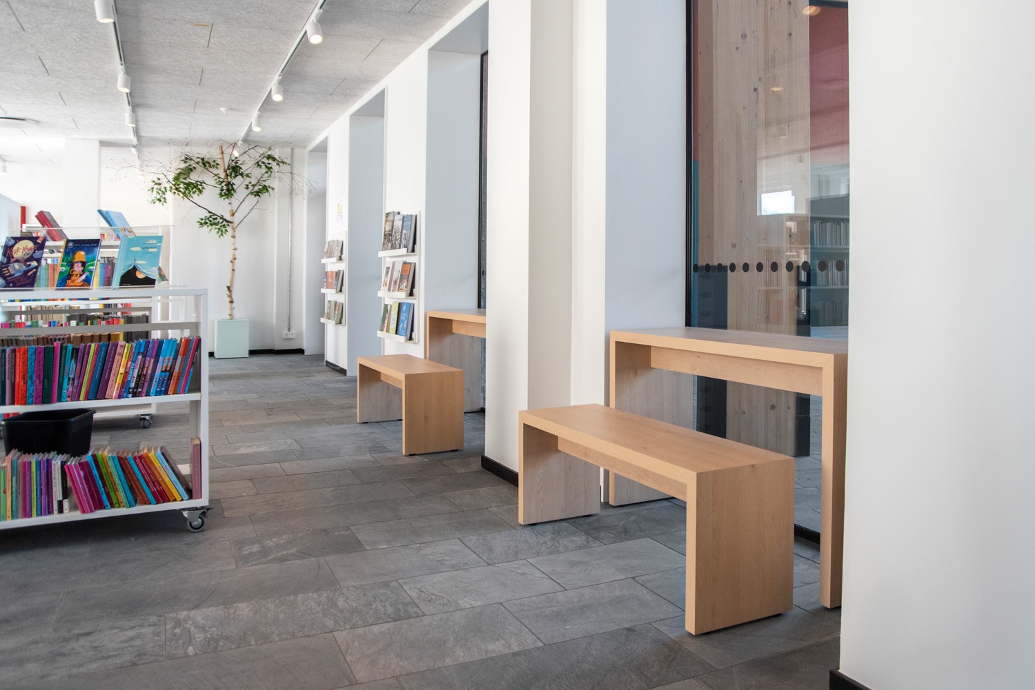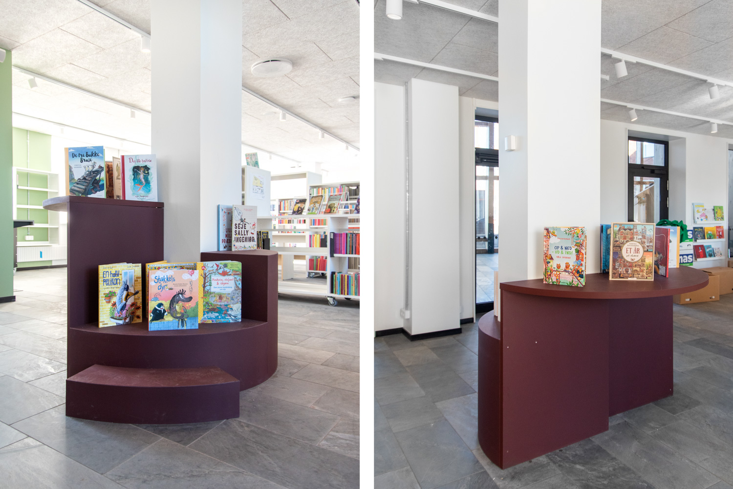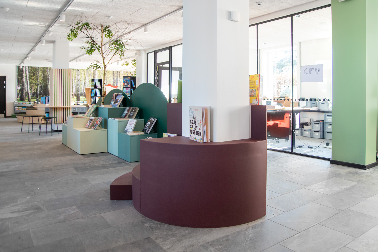 Les couleurs poudrées et orangées de certains meubles de la bibliothèque offrent un beau contraste avec les couleurs de la nature, plus sobres. Les nombreux podiums de présentation Maria permettent de créer des zones d'exposition et de mettre en valeur certains objets et documents.