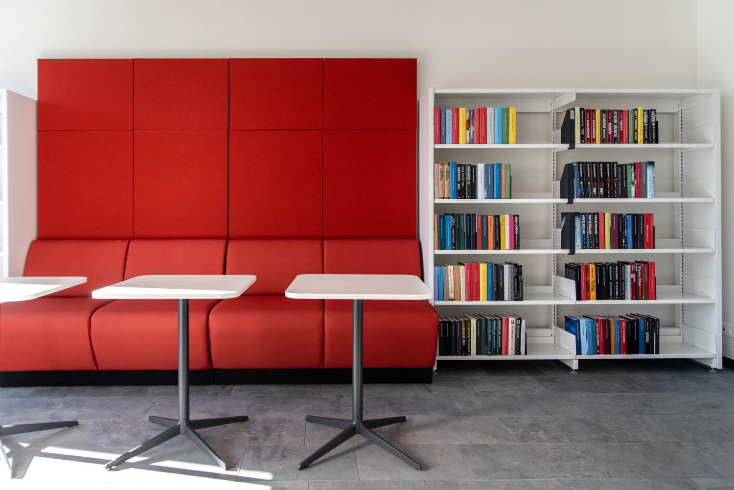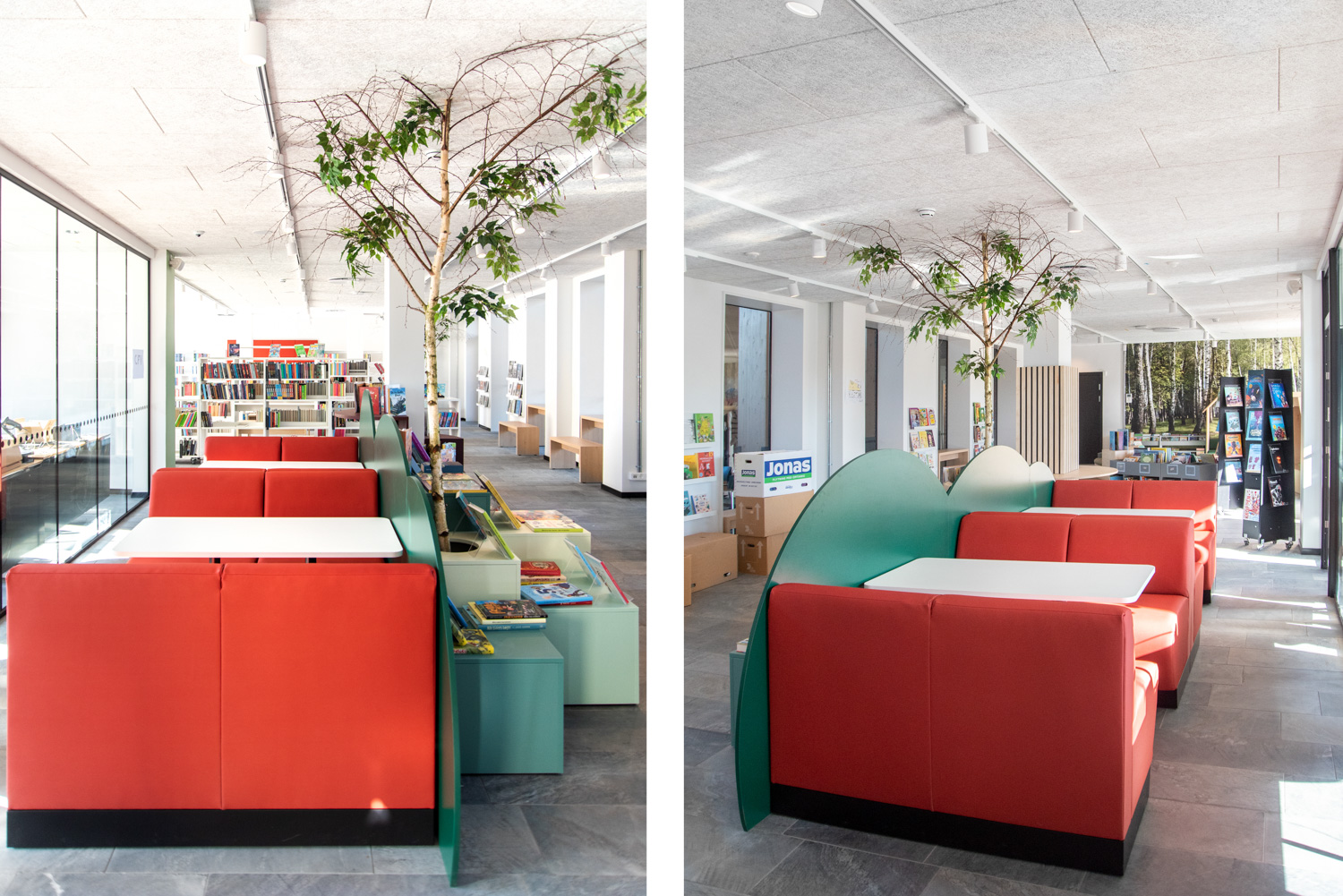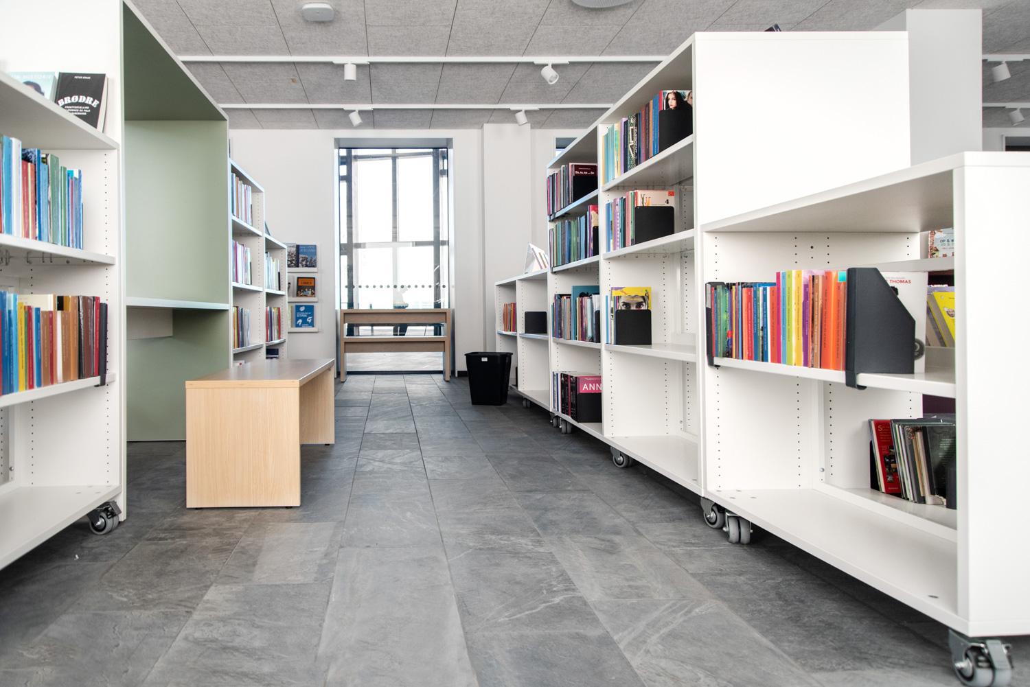 Les couleurs poudrées et orangées de certains meubles de la bibliothèque offrent un beau contraste avec les couleurs de la nature, plus sobres. Les nombreux podiums de présentation Maria permettent de créer des zones d'exposition et de mettre en valeur certains objets et documents.