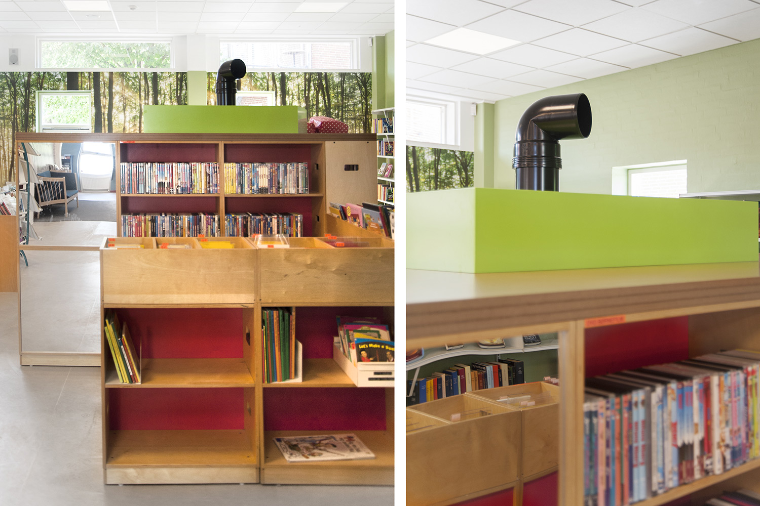 Dans la zone réservée aux enfants, les rayonnages en bois existants ont été disposés de sorte à former une grotte équipée d’un périscope grâce auquel les petits peuvent combiner exploration et amusement.