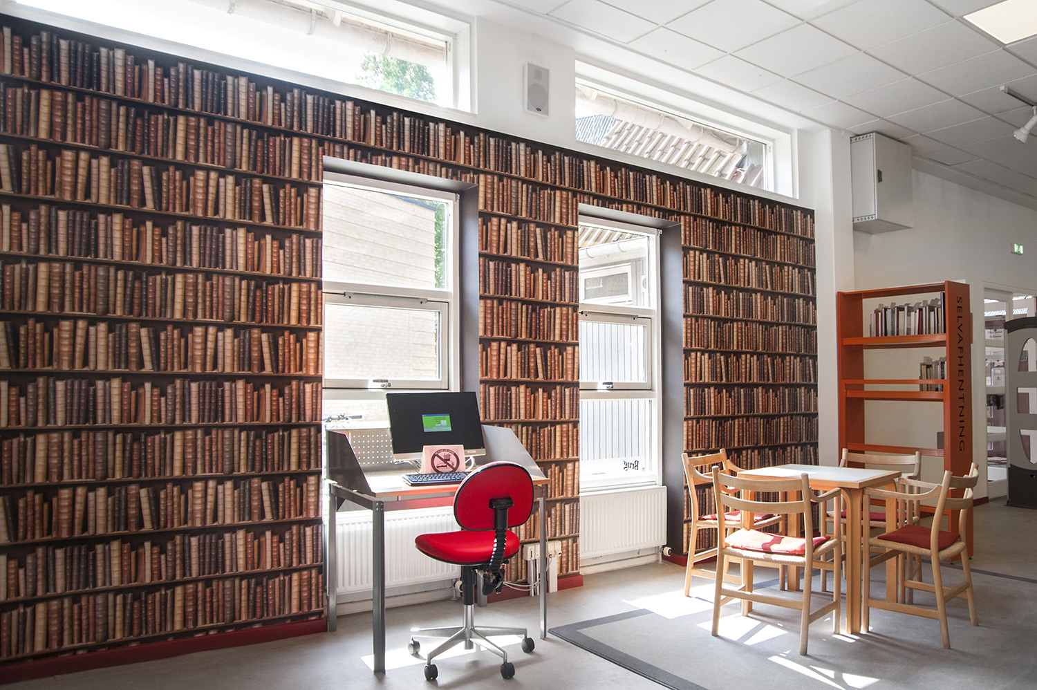 Certains murs ont été recouverts d’illustrations, apportant ainsi une touche de nature et de sérénité à la bibliothèque.