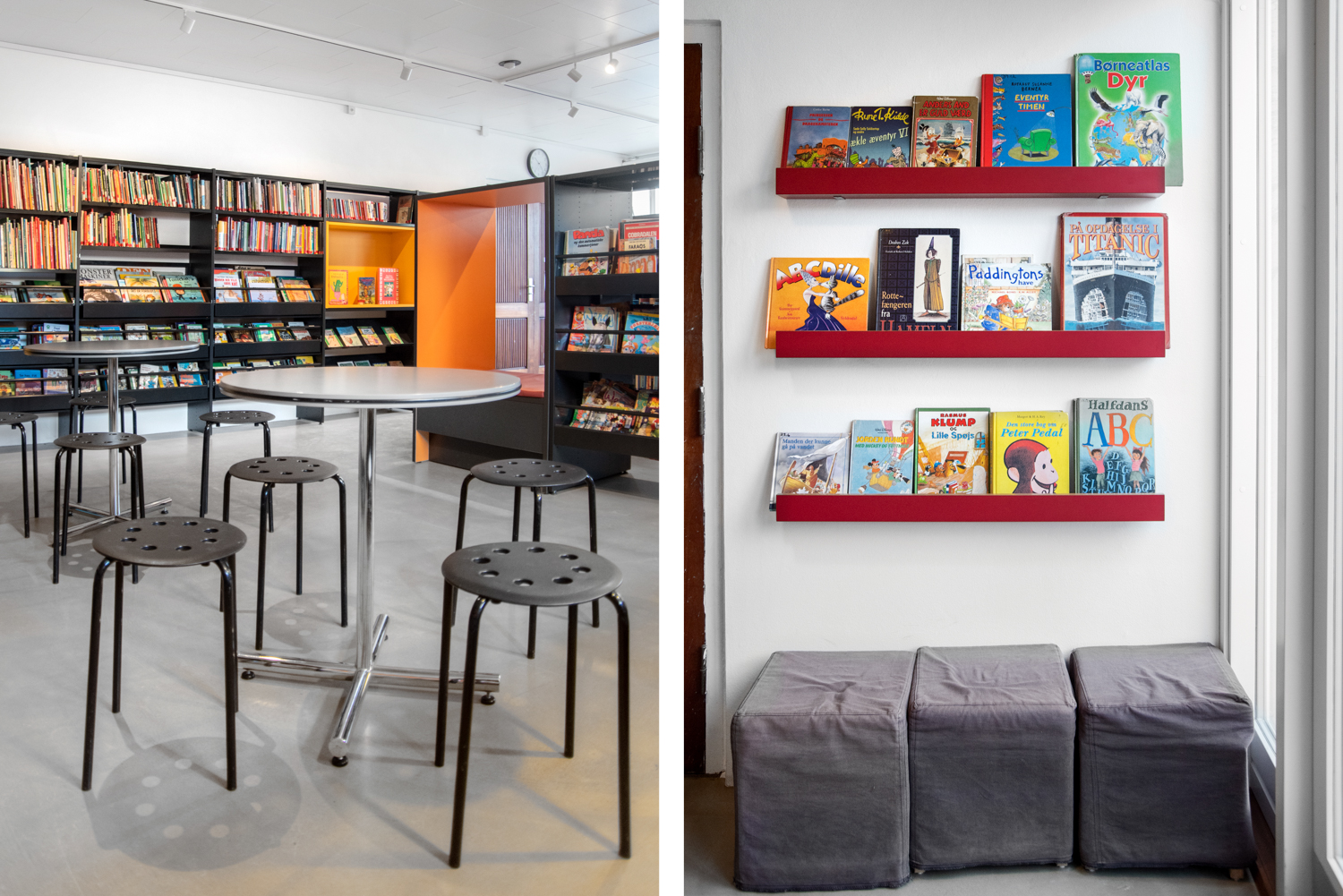 Le but de la rénovation était de créer suffisamment d’espaces pour accueillir une classe entière. L’idée était aussi de rendre la pièce moins compacte sans compromettre ni la capacité ni l’espace. L’accent a été mis sur l’optimisation de la pièce et l’atmosphère du lieu. Par exemple, la couleur sombre des étagères contraste agréablement avec la couleur chaude des niches de lecture renforçant ainsi le côté cocoon.