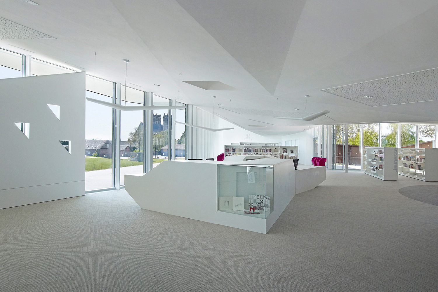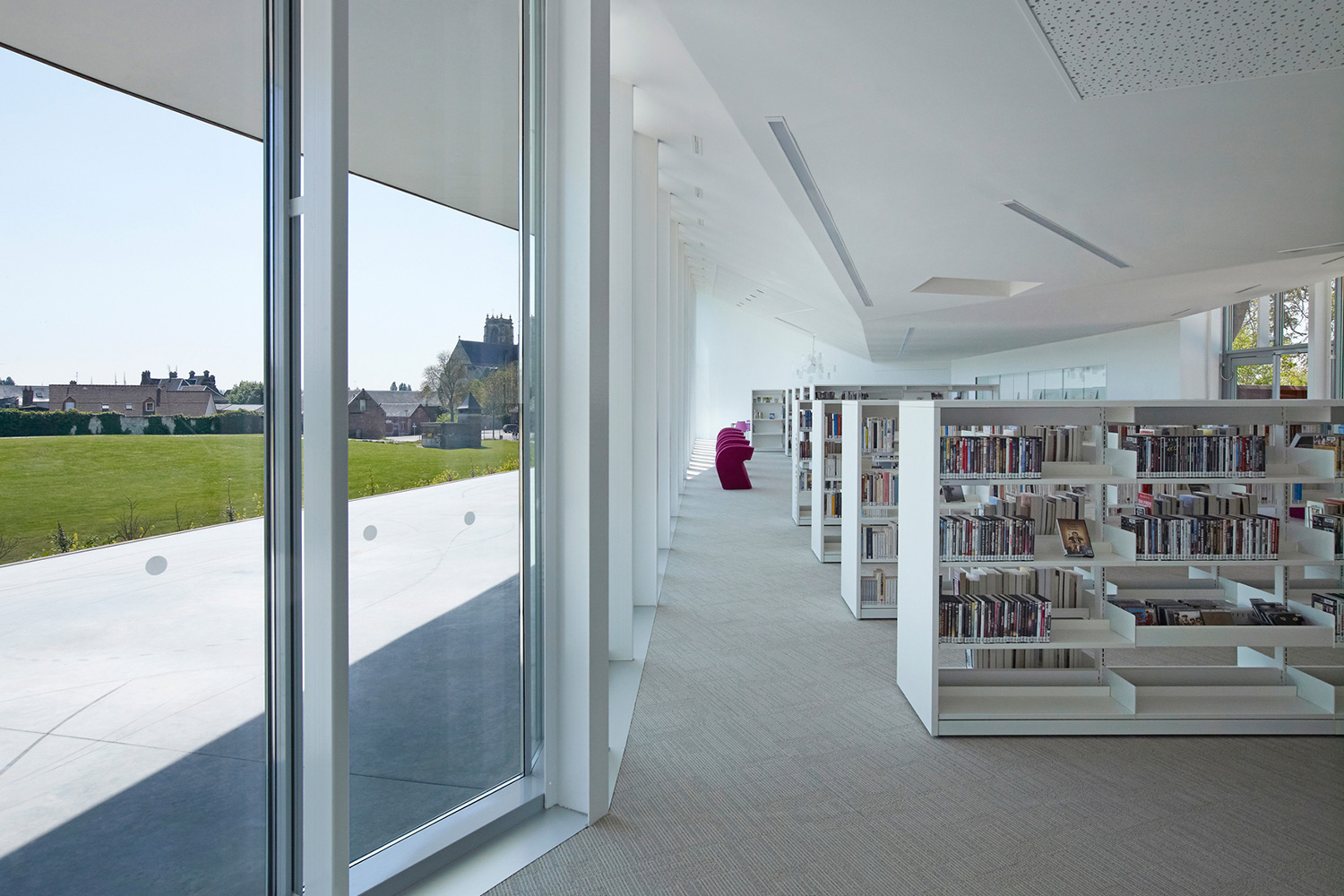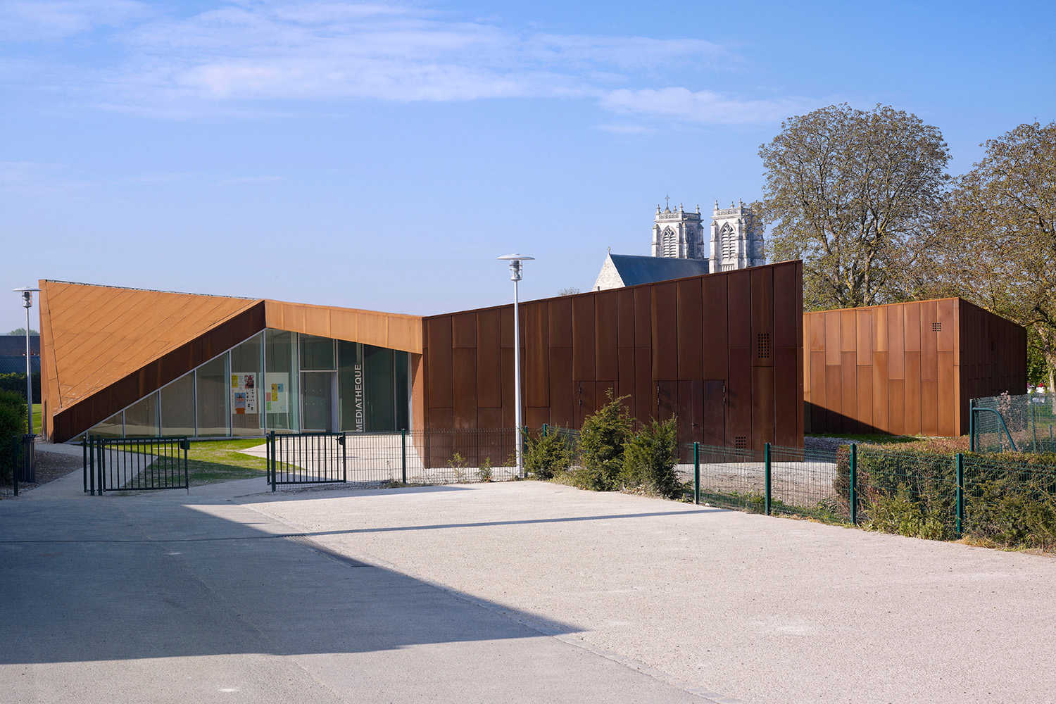 L’enceinte de l’abbaye de Corbie est délimitée par un long mur de pierre datant du 18e siècle. Nichée aux abords d’un promontoire à l’intérieur de cette enceinte, la nouvelle bibliothèque multimédias surplombe la ville magnifique et l’imposante abbaye de style gothique. Un bâtiment, une sculpture ou un reflet du paysage environnant : la bibliothèque multimédias de la Communauté du Val de Somme se veut tout à la fois.