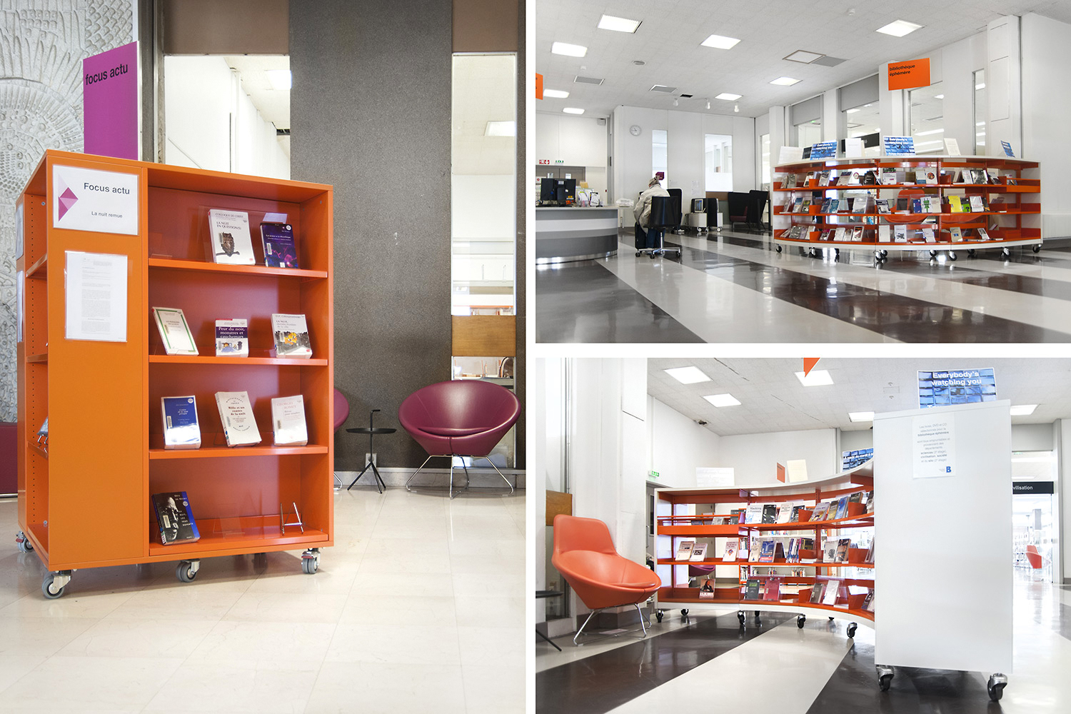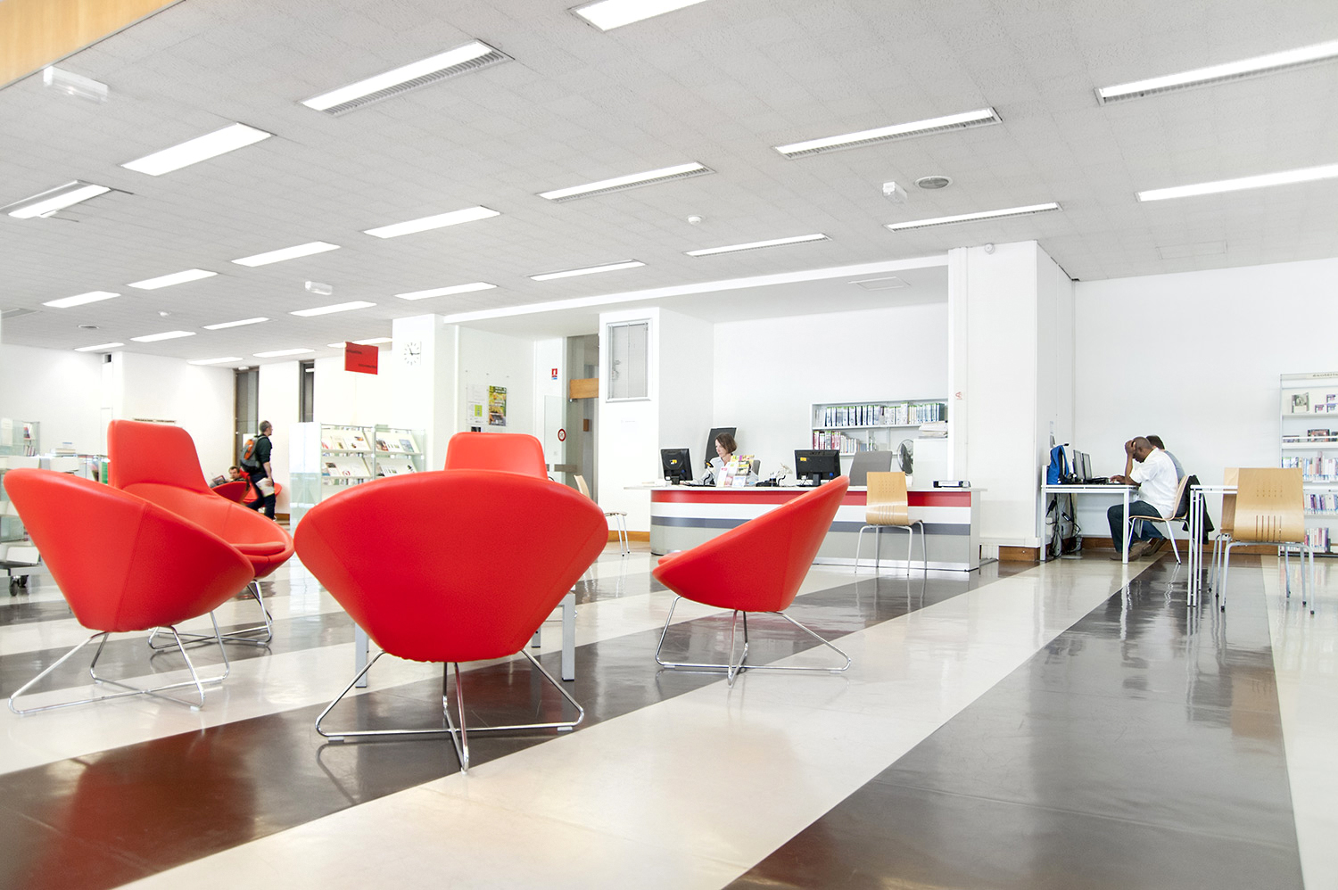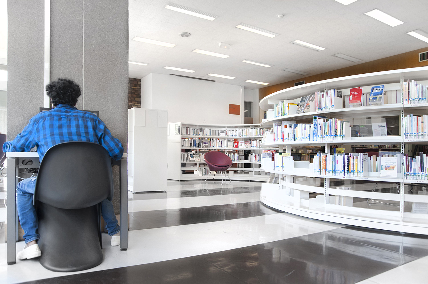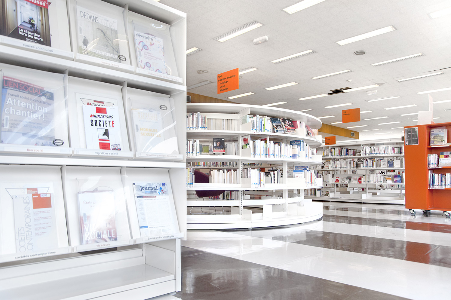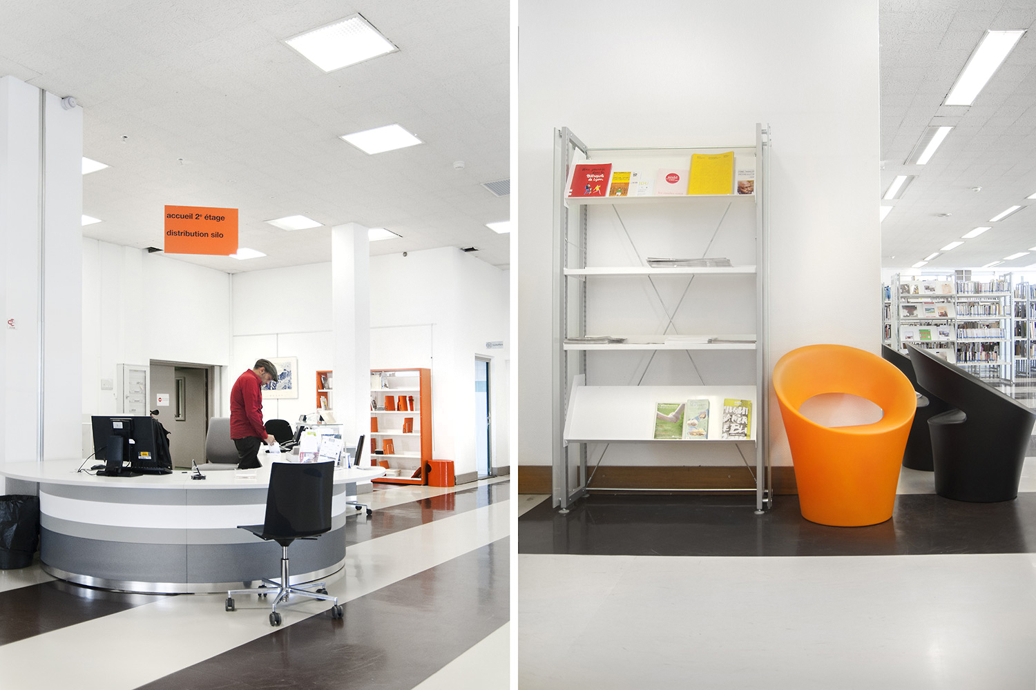 Le mobilier installé inclut notamment la gamme de rayonnages Classic London, droit et courbe, la gamme Opal verre, les banques d’accueil, des postes de travail, du mobilier de présentation et du mobilier de confort. Fonctionnel et esthétique le mobilier joue son rôle dans l’amélioration du confort général, des utilisateurs comme du personnel.