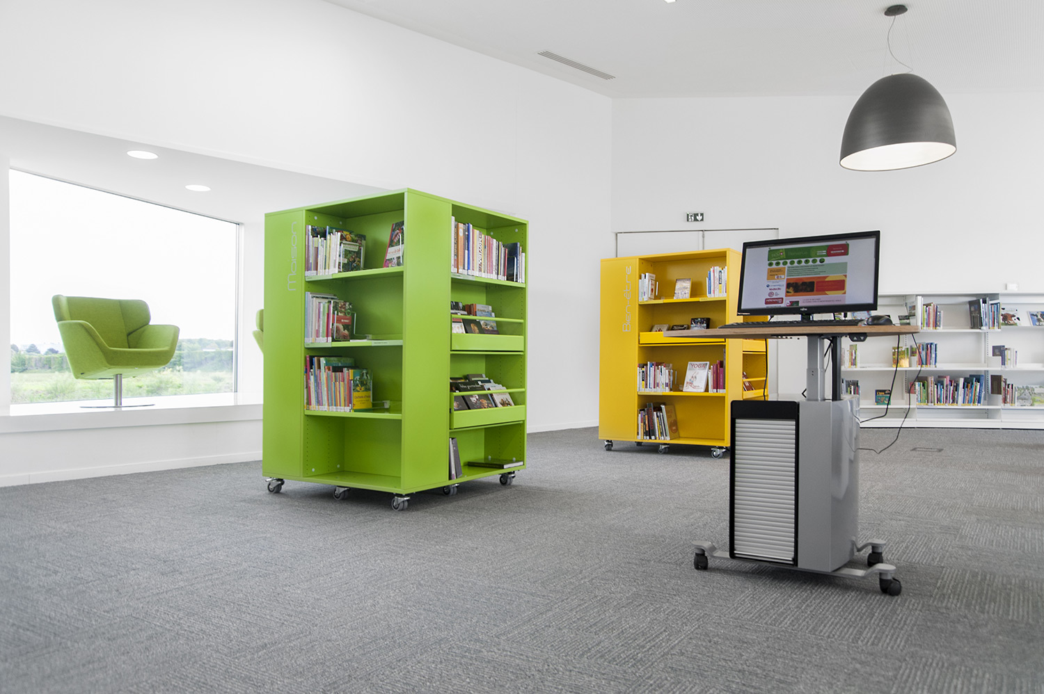 L’objectif est d’offrir, dans les quatre espaces de la médiathèque, un confort et un sentiment d’accueil permanent. Pour cela, une attention toute particulière est apportée au mobilier fournit par l’entreprise BC intérieur qui est d’une esthétique sobre, intemporelle et pratique. La mise en valeur des collections, par leur présentation, représente une valeur ajoutée au concept développé.