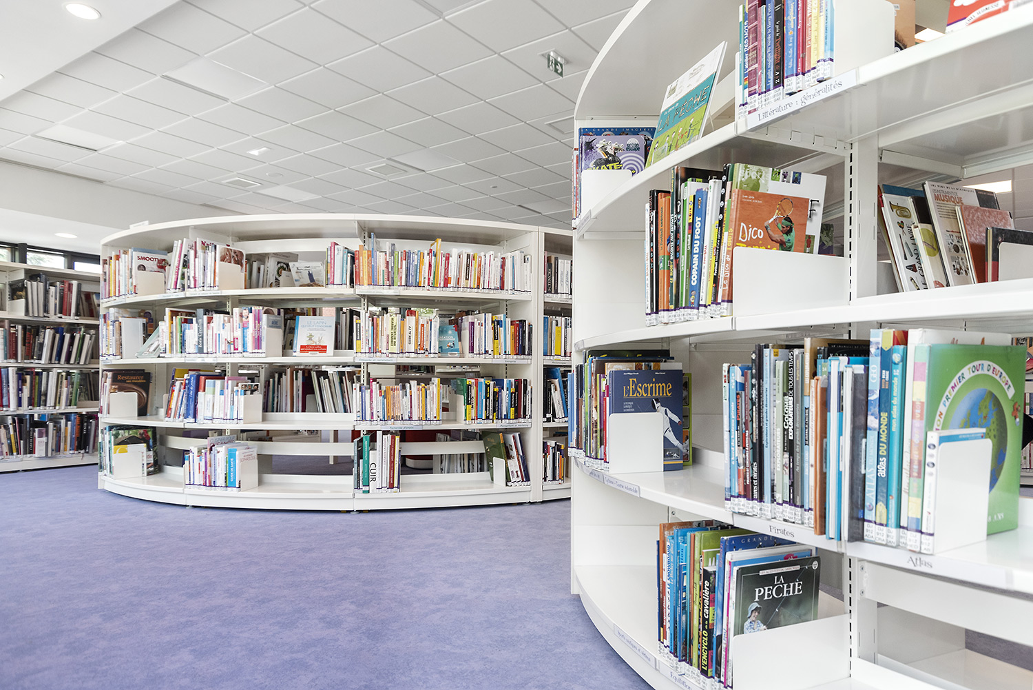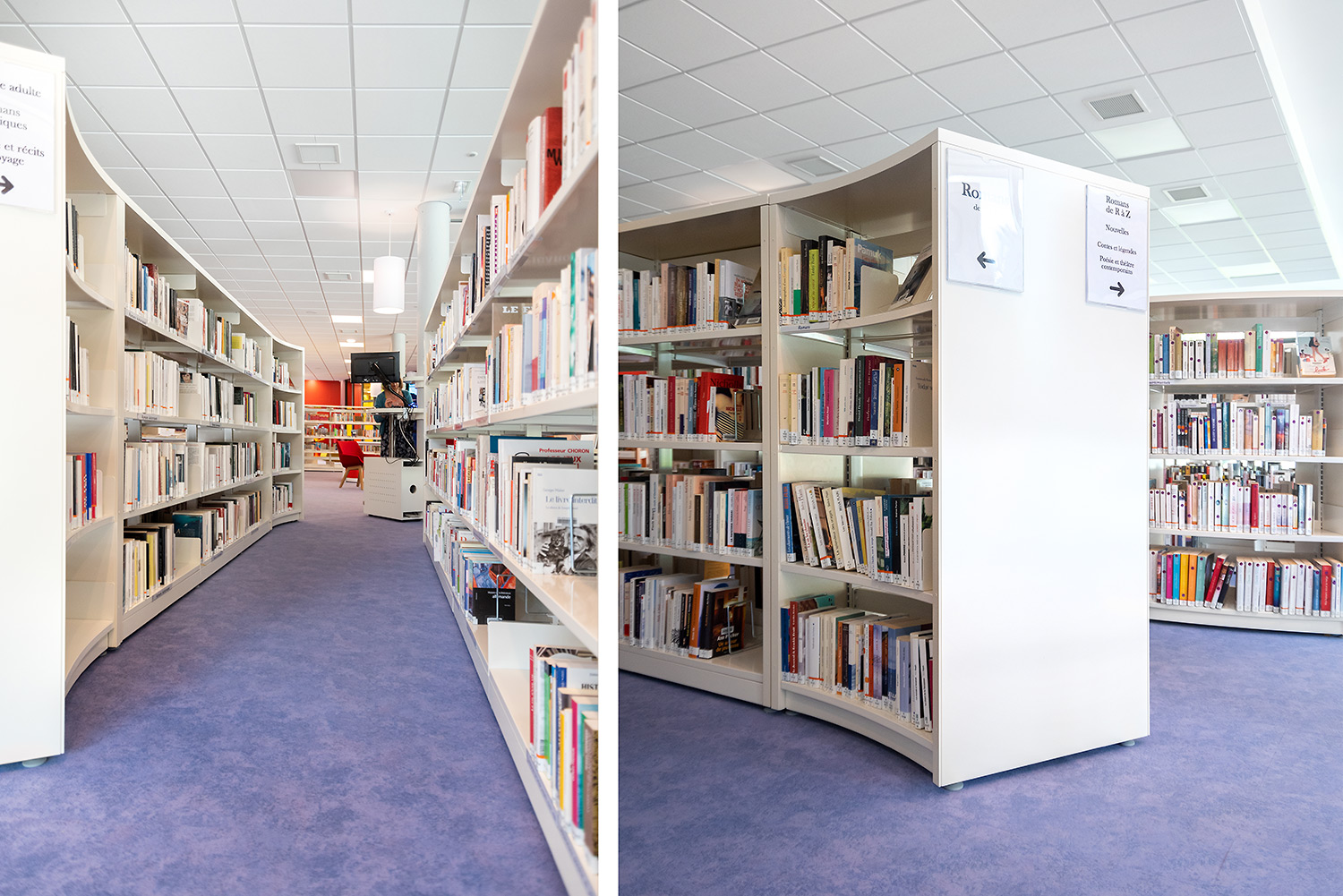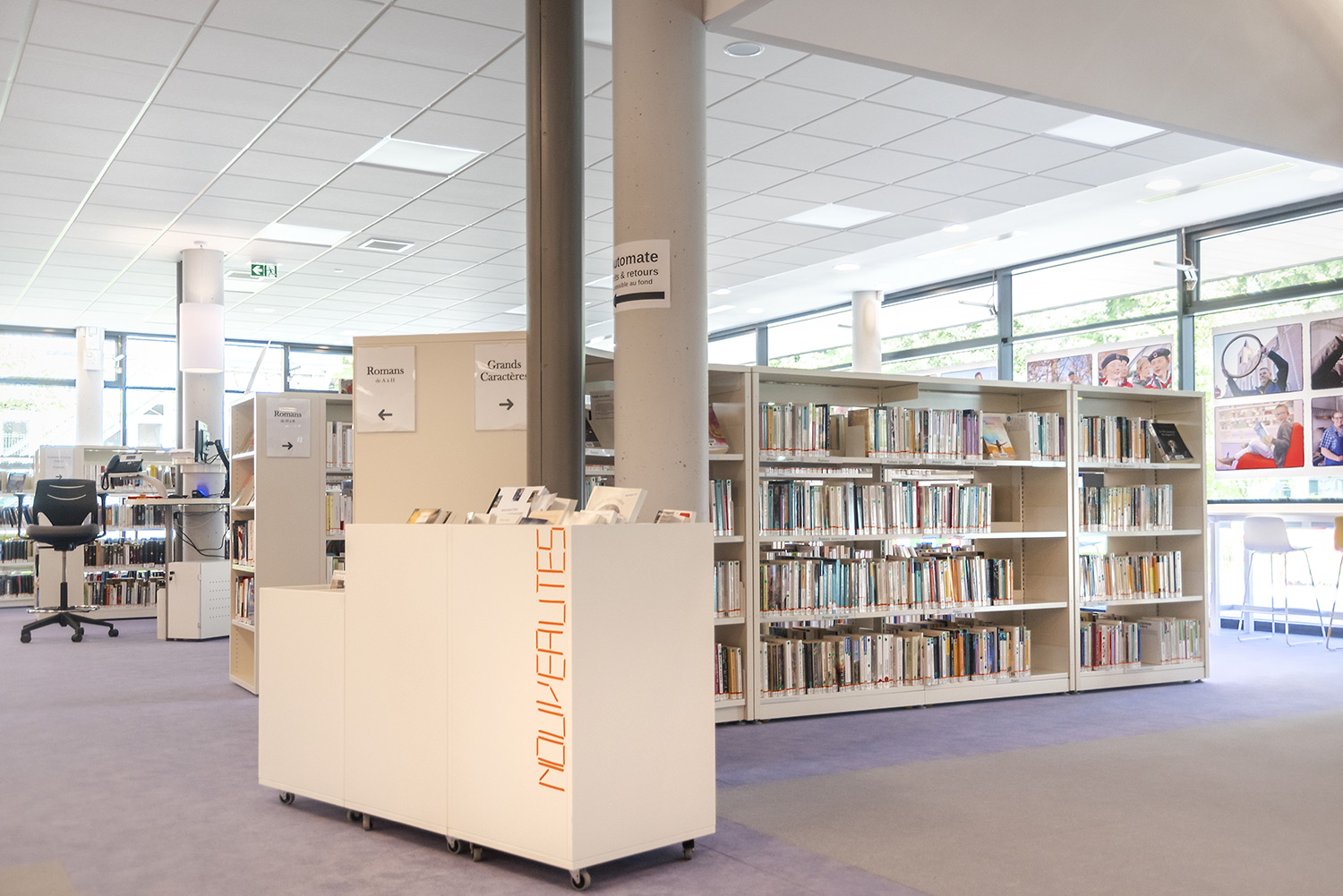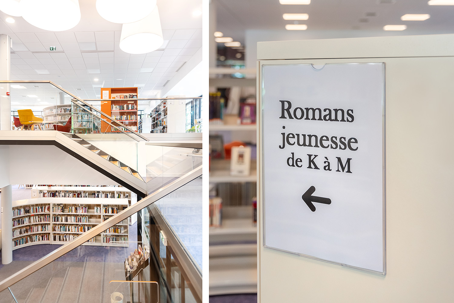 Au Rez de Chaussée, la Littérature adulte et littérature jeunesse se trouvent sur un même niveau pour faciliter la transition de lecture.