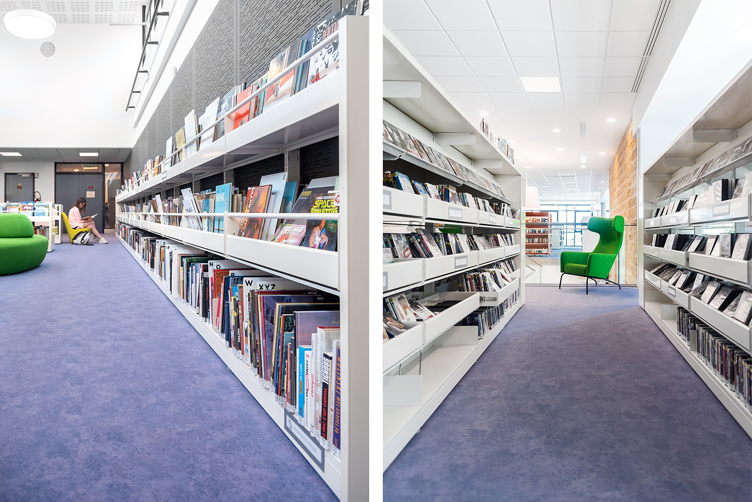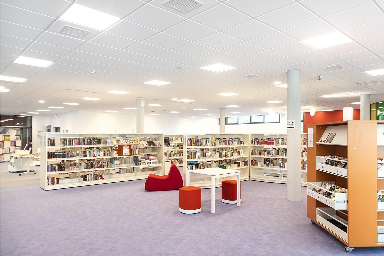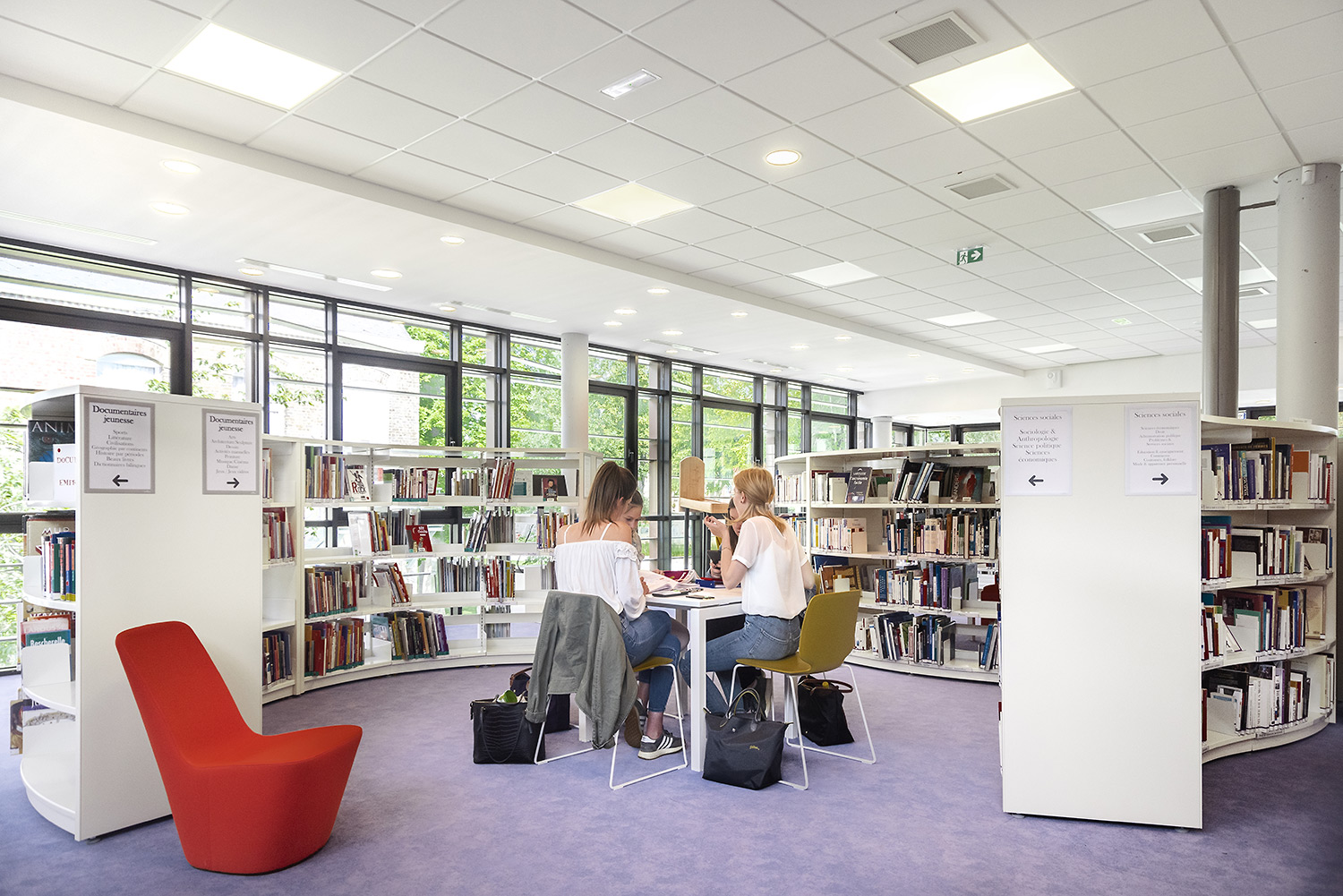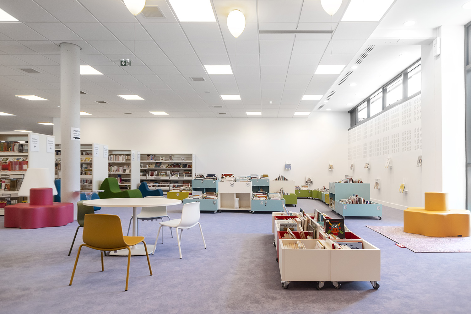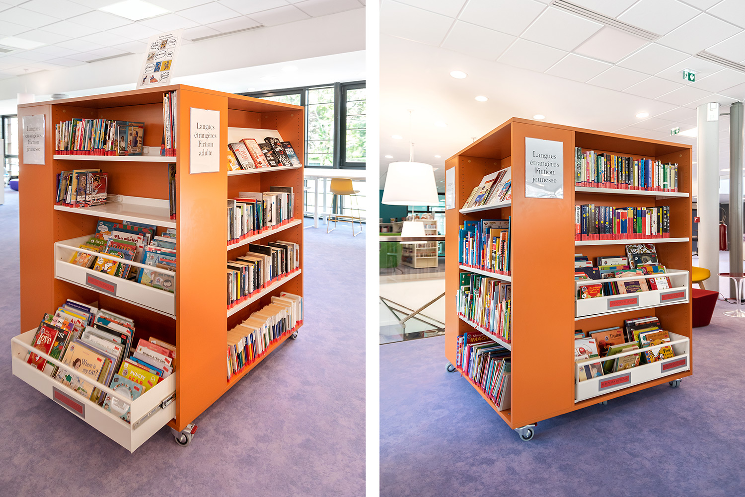 Au Rez de Chaussée, la Littérature adulte et littérature jeunesse se trouvent sur un même niveau pour faciliter la transition de lecture.
