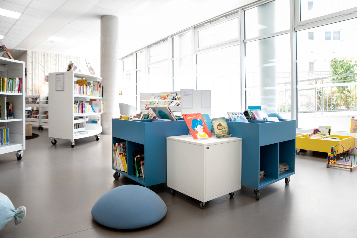 Le travail mené avec BC Intérieur pour toute la conception de l’aménagement intérieur, le choix de mobiliers parmi un large catalogue a donné naissance à une médiathèque à taille humaine, joyeuse et modulable avec des espaces visuellement cohérents et pourtant bien différenciés ! Ce travail fructueux amène un public nombreux à investir ce lieu de vie culturel en venant écouter un disque dans de larges chauffeuses, lire des histoires ou des BD sur de confortables poufs, travailler en groupe au cœur des espaces, etc.