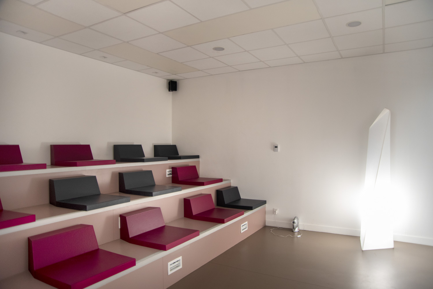 Du fait de son implantation en rez-de-jardin, les contraintes architecturales étaient nombreuses (luminosité naturelle limitée, nombreux poteaux porteurs, etc.) et nécessitaient de porter un soin tout particulier à son aménagement intérieur. Le travail d’implantation et de choix des mobiliers devait structurer les différents espaces et développer une atmosphère chaleureuse. La modularité et la proposition de meubles évolutifs et adaptés aux différents usages et besoins des publics étaient également au cœur de la réflexion.