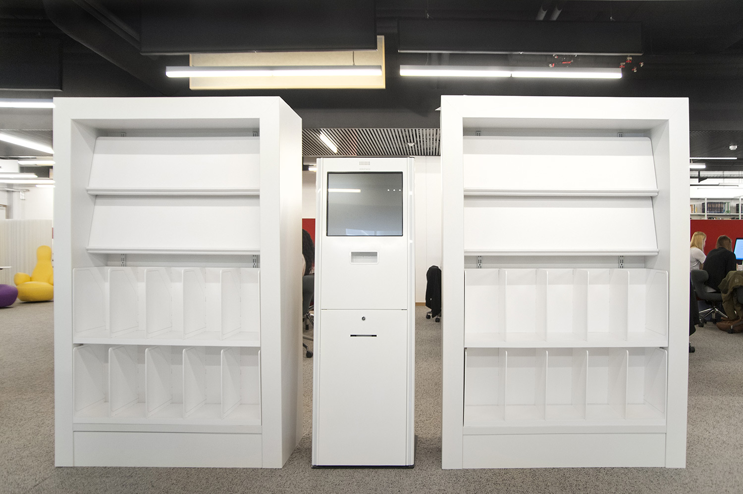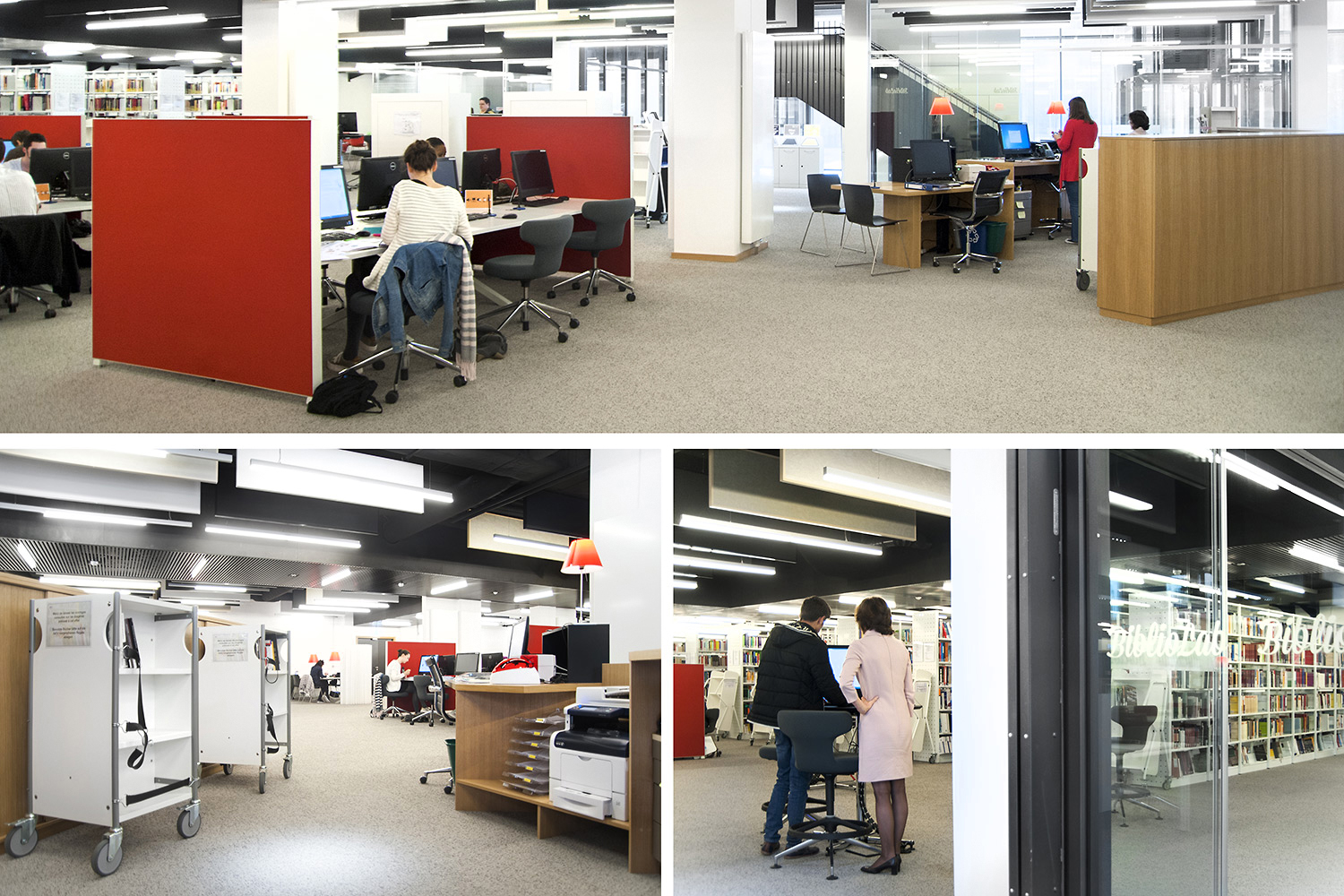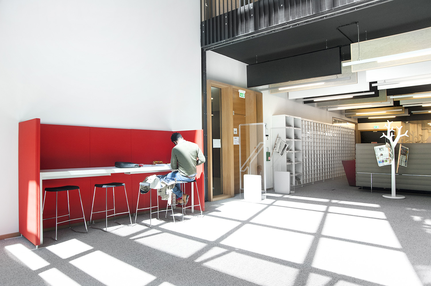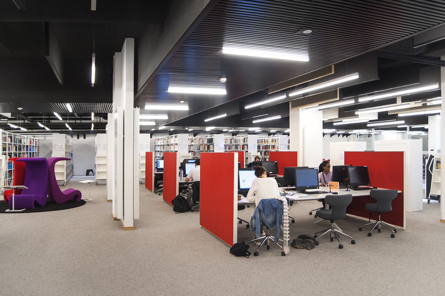 L’accent a été placé sur le confort, l’espace de travail et la prestation de service. Les espaces de travail et de lecture contemporains occupent près des trois quarts de la bibliothèque. Derrière la banque d’accueil centrale, le personnel se tient à la disposition des étudiants. La collection de livres est mise en valeur dans des rayonnages blancs flambant neufs. L’important taux de fréquentation de cette bibliothèque témoigne du réel succès de ce type d’aménagement.