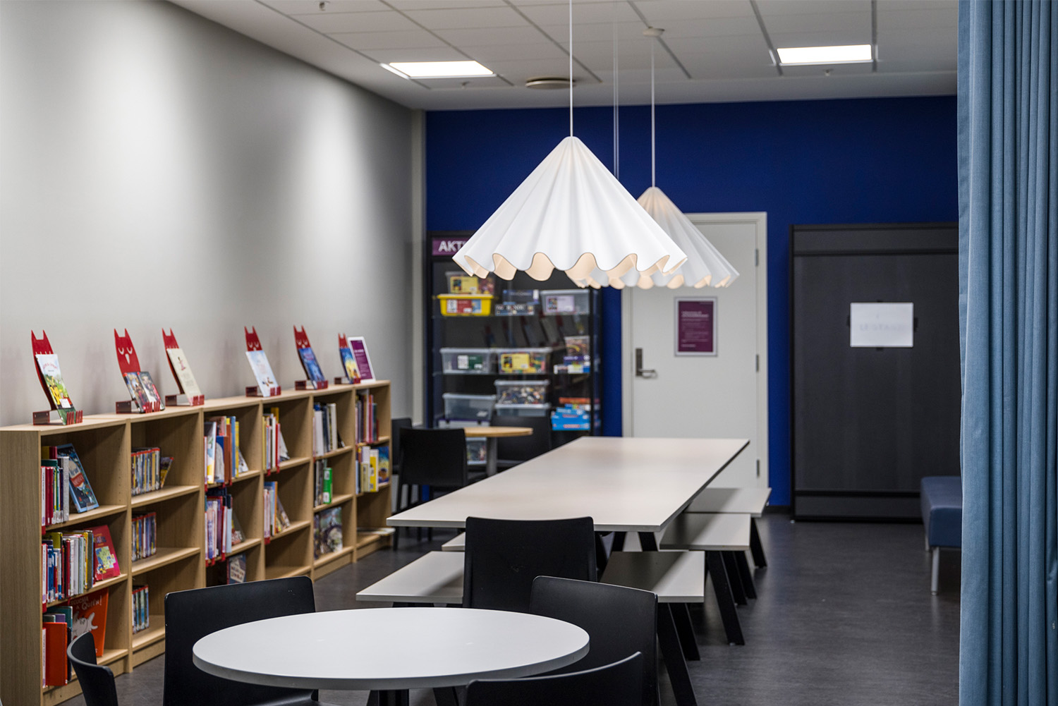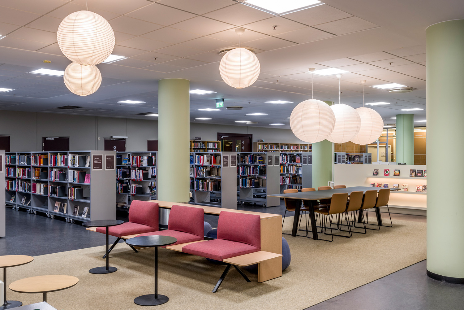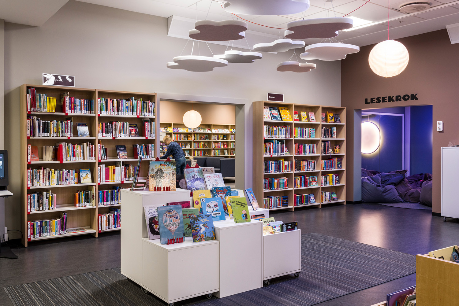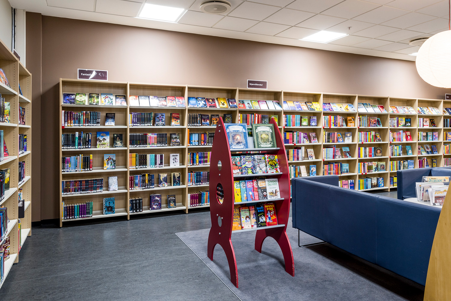 La Bibliothèque d’Asker est un lieu emblématique de la ville et un centre dynamique dédié à l’apprentissage, à l’inspiration et aux échanges. Grâce à sa position centrale et à ses vastes façades vitrées, la bibliothèque attire naturellement les visiteurs, devenant ainsi un point de rencontre incontournable. À la suite d’une rénovation complète des locaux, avec un nouvel agencement, de nouvelles couleurs et le remplacement de la majorité des rayonnages, l’espace offre désormais une atmosphère contemporaine et accueillante. Ces transformations contribuent à séduire un public toujours plus large, attiré par l’ambiance conviviale du lieu.