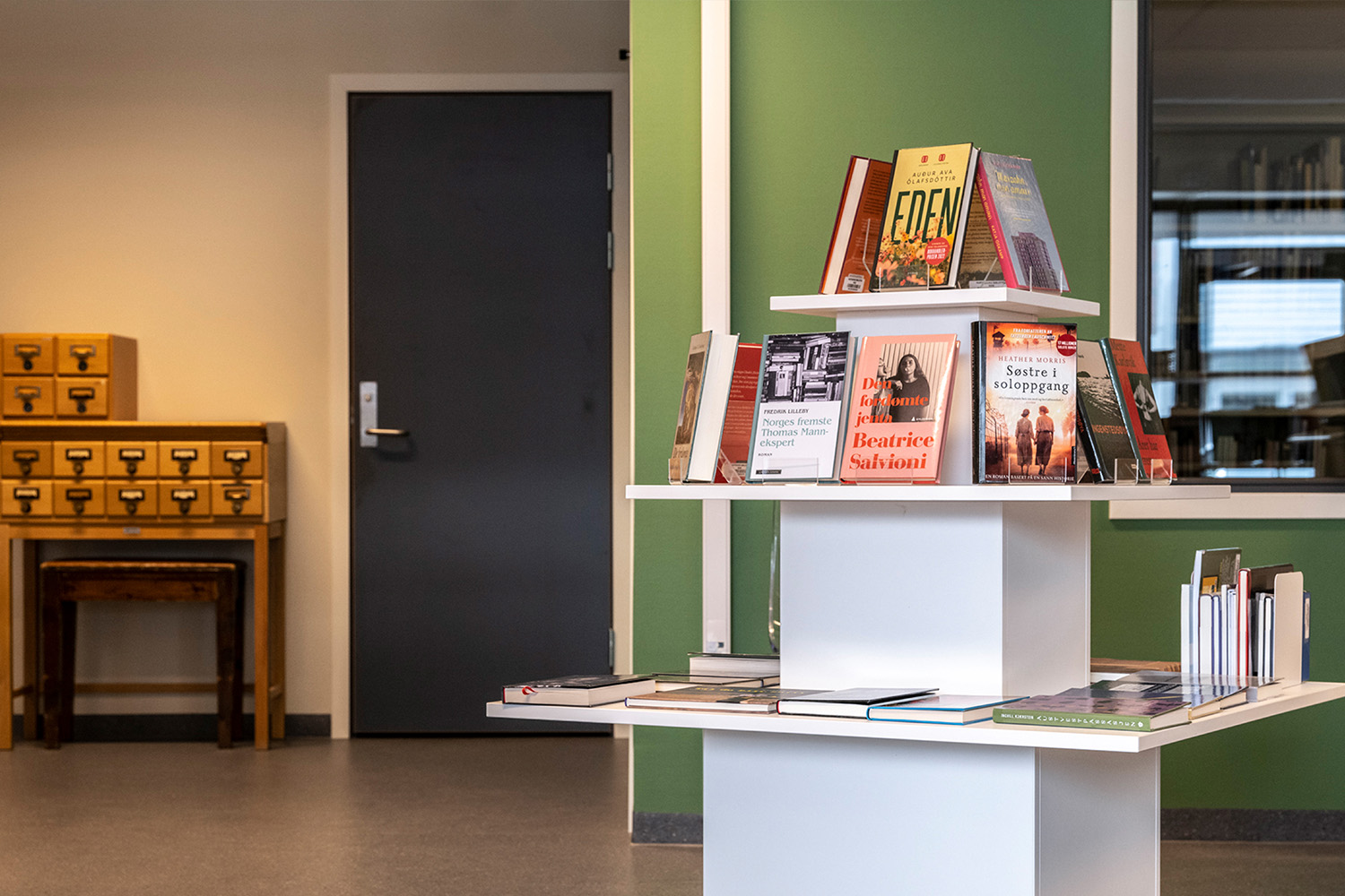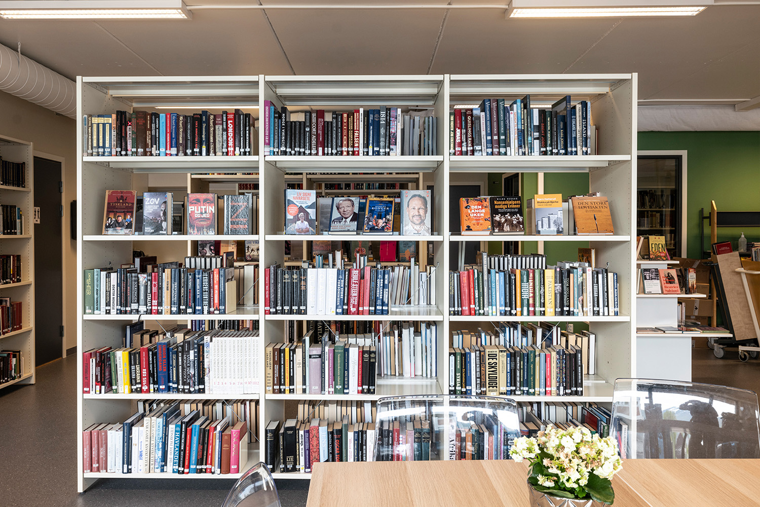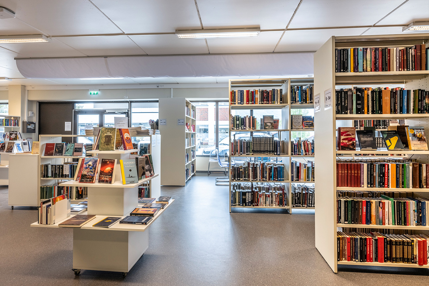 La bibliothèque visait une combinaison harmonieuse de nouvelles étagères fonctionnelles et de comptoirs, agrémentée par la réutilisation de meubles et de présentoirs à livres existants. Notre équipe de design norvégienne, BS Eurobib, a pris en charge l'agencement et les schémas de couleurs, en collaboration avec un distributeur local pour fournir des systèmes d'étagères, des comptoirs, des tours d'exposition, des chariots à livres et bien plus encore.