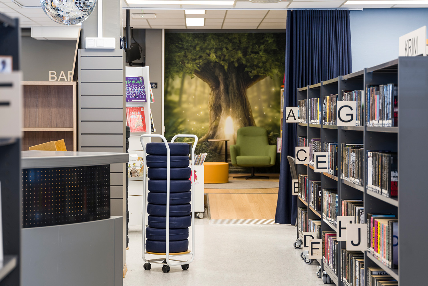 Au fond de l’espace jeunesse, la bibliothèque a imaginé une véritable petite forêt enchantée. Ornée de décorations murales et dotée d’une scène intégrée, cette salle est devenue un lieu idéal pour la narration de contes, pour le théâtre ou pour d’autres moments ludiques. Les rayonnages mobiles et les poufs permettent de transformer facilement l’espace : d’une forêt magique en coin lecture ou en scène culturelle, selon les besoins.