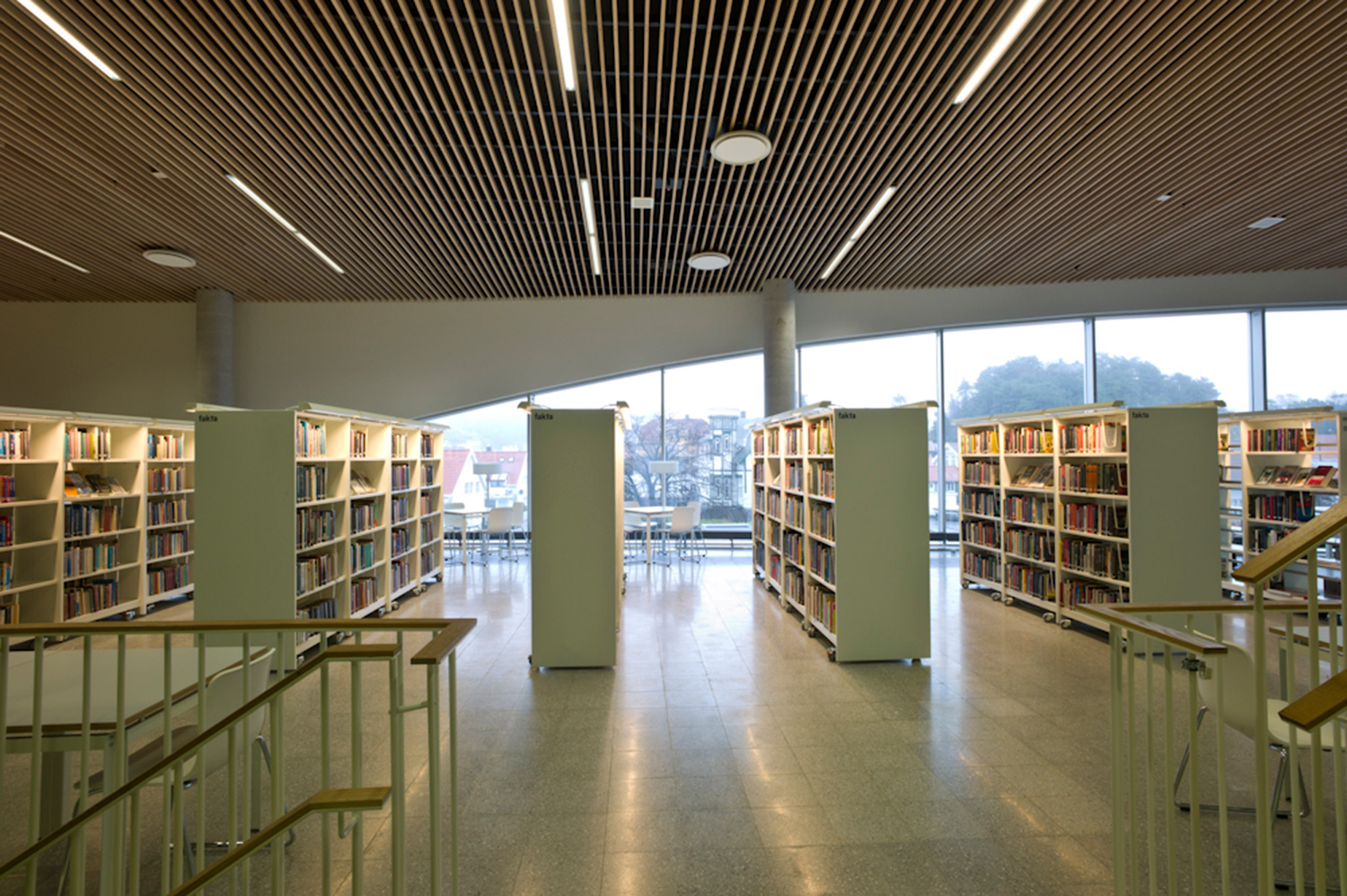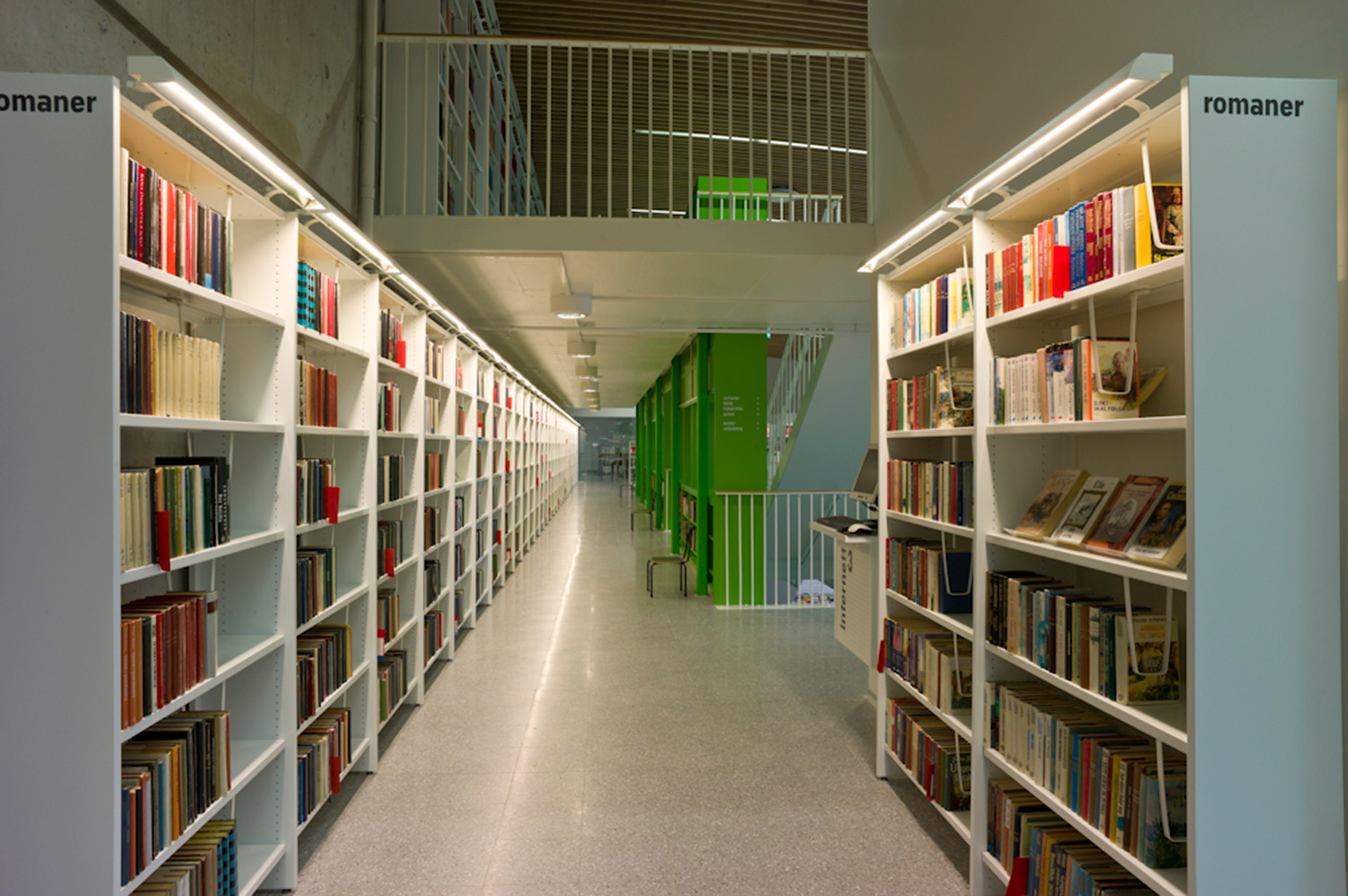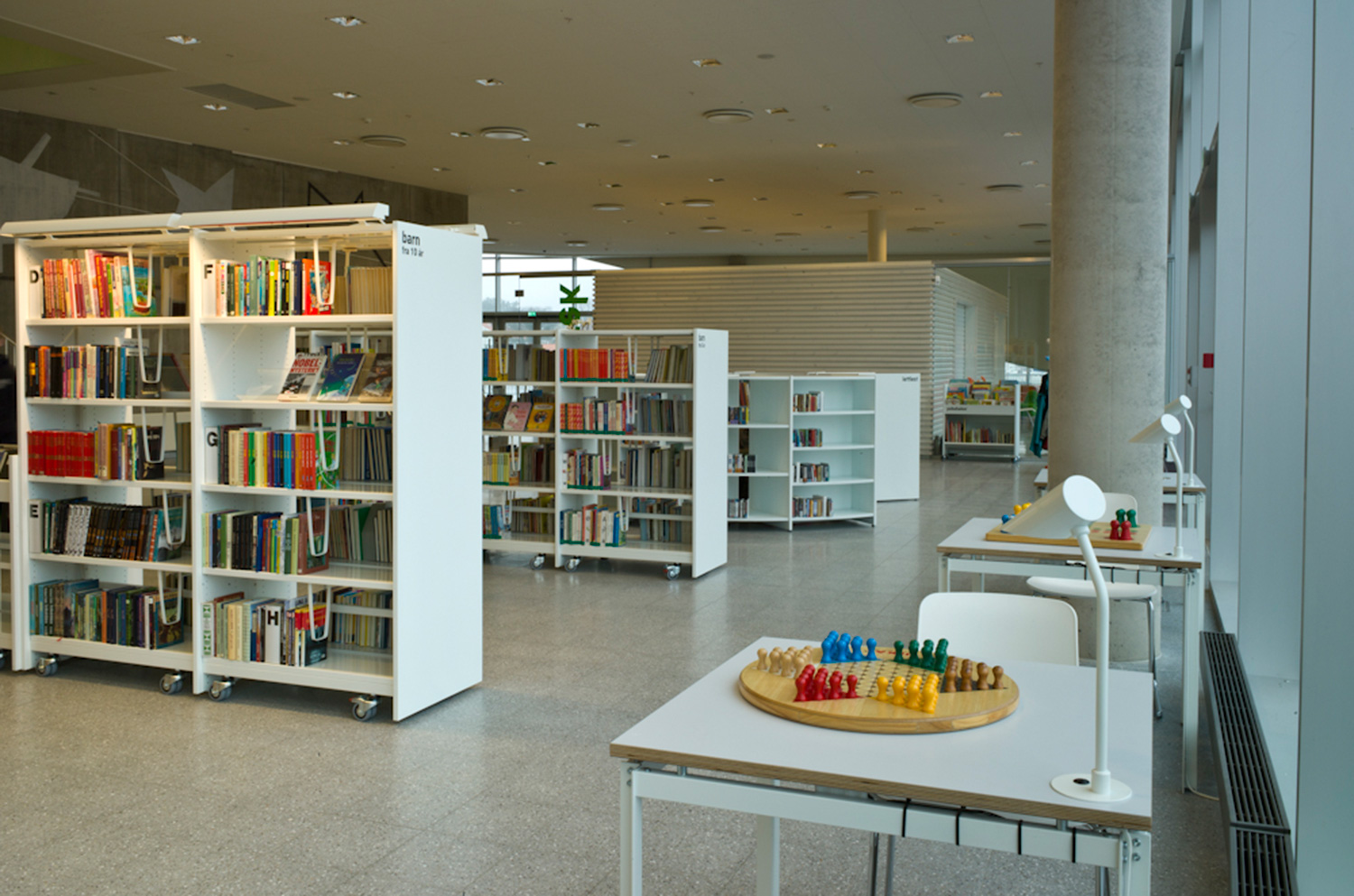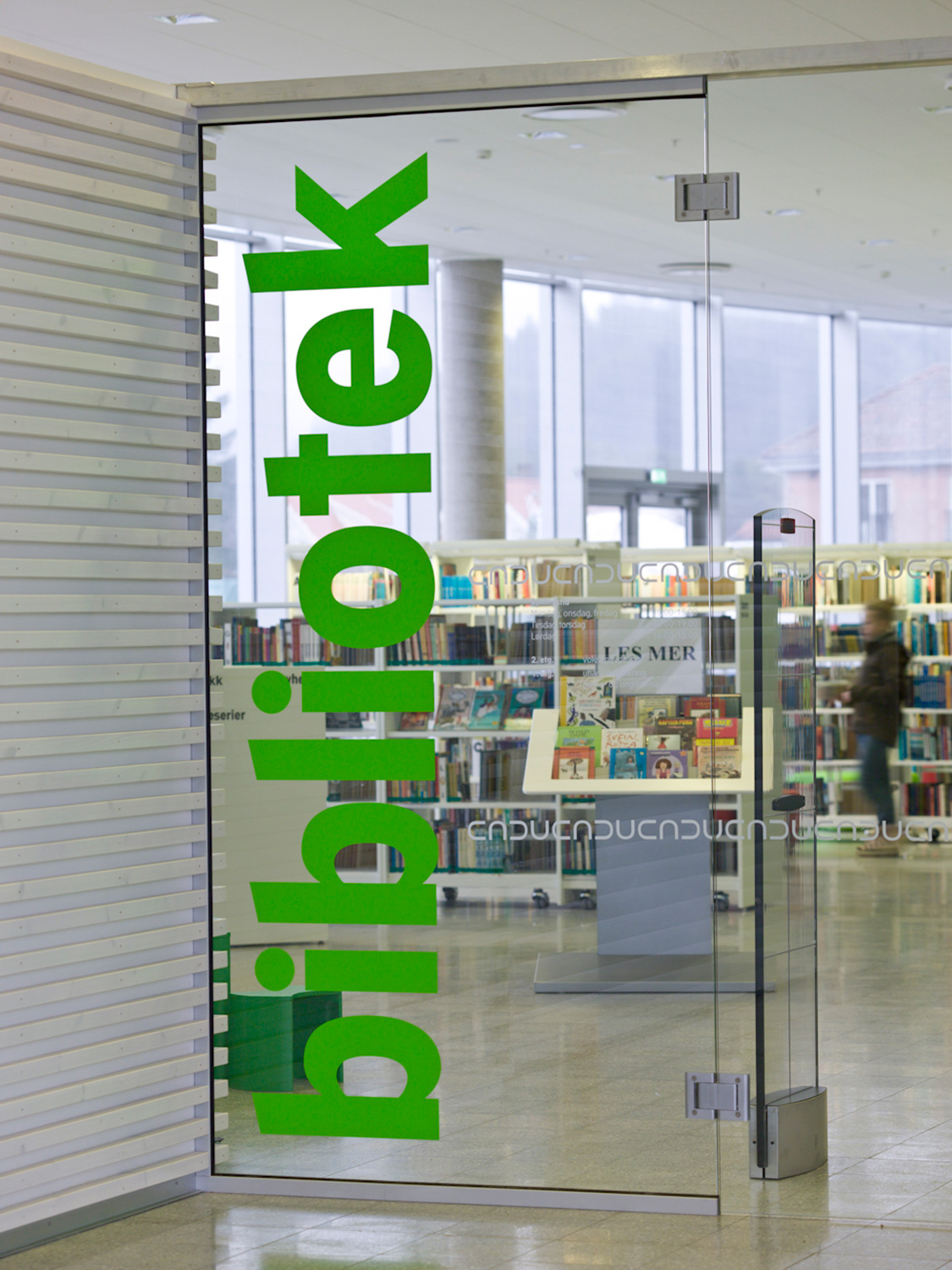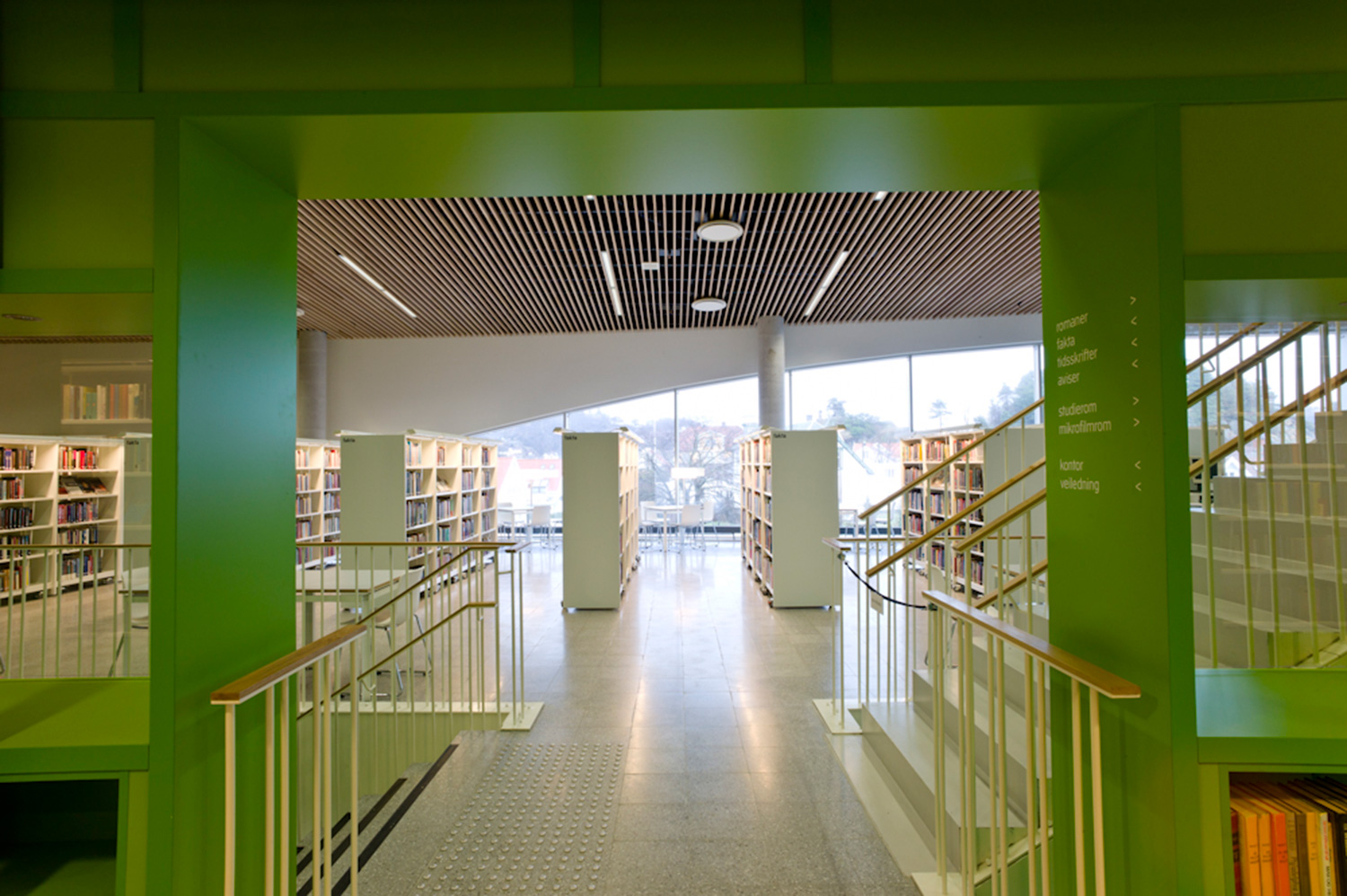 Lumineuse et aérée, la bibliothèque s’étend sur trois étages. L’intérieur se caractérise par un mur vert du plafond au sol spécialement conçu, qui contraste superbement avec les rayonnages blancs. Les vitres panoramiques offrent une vue spectaculaire de le rivière. Nature et tradition rencontrent développement et innovation.