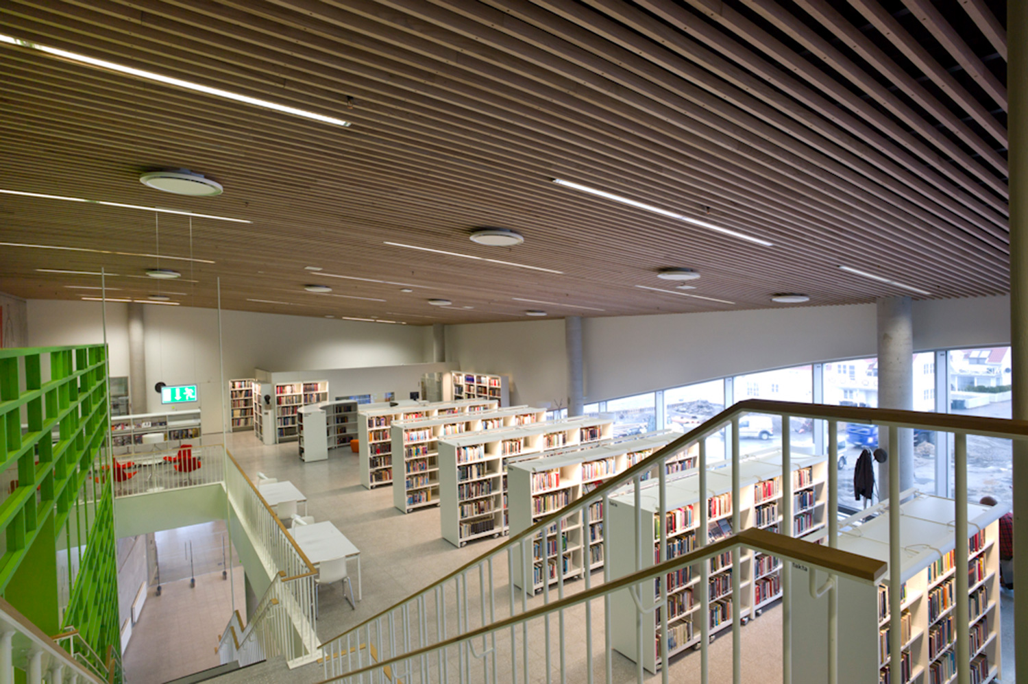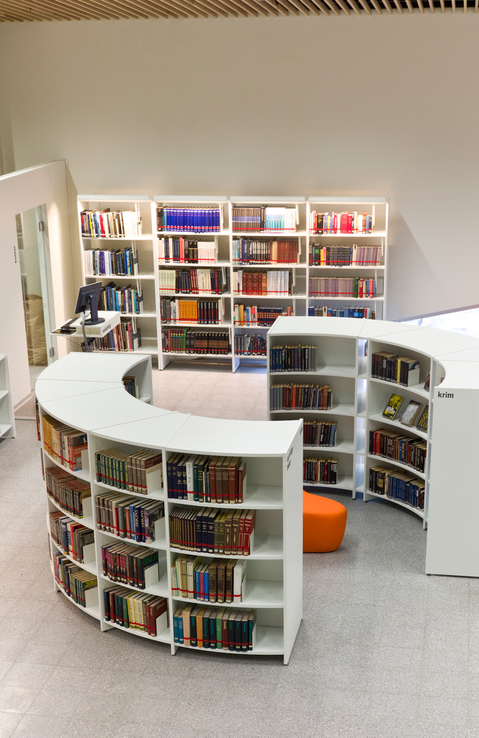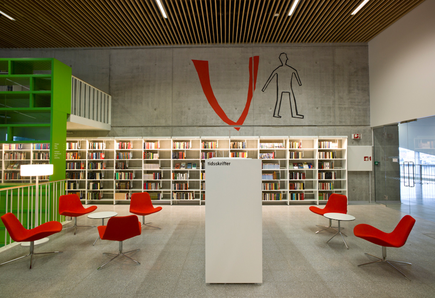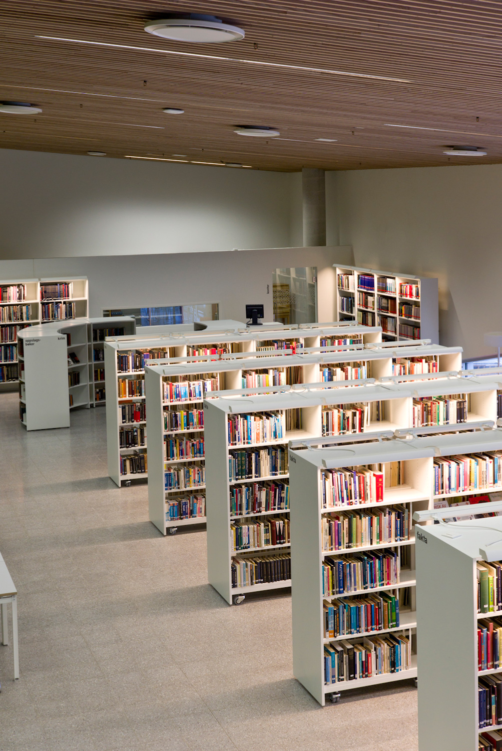 Lumineuse et aérée, la bibliothèque s’étend sur trois étages. L’intérieur se caractérise par un mur vert du plafond au sol spécialement conçu, qui contraste superbement avec les rayonnages blancs. Les vitres panoramiques offrent une vue spectaculaire de le rivière. Nature et tradition rencontrent développement et innovation.