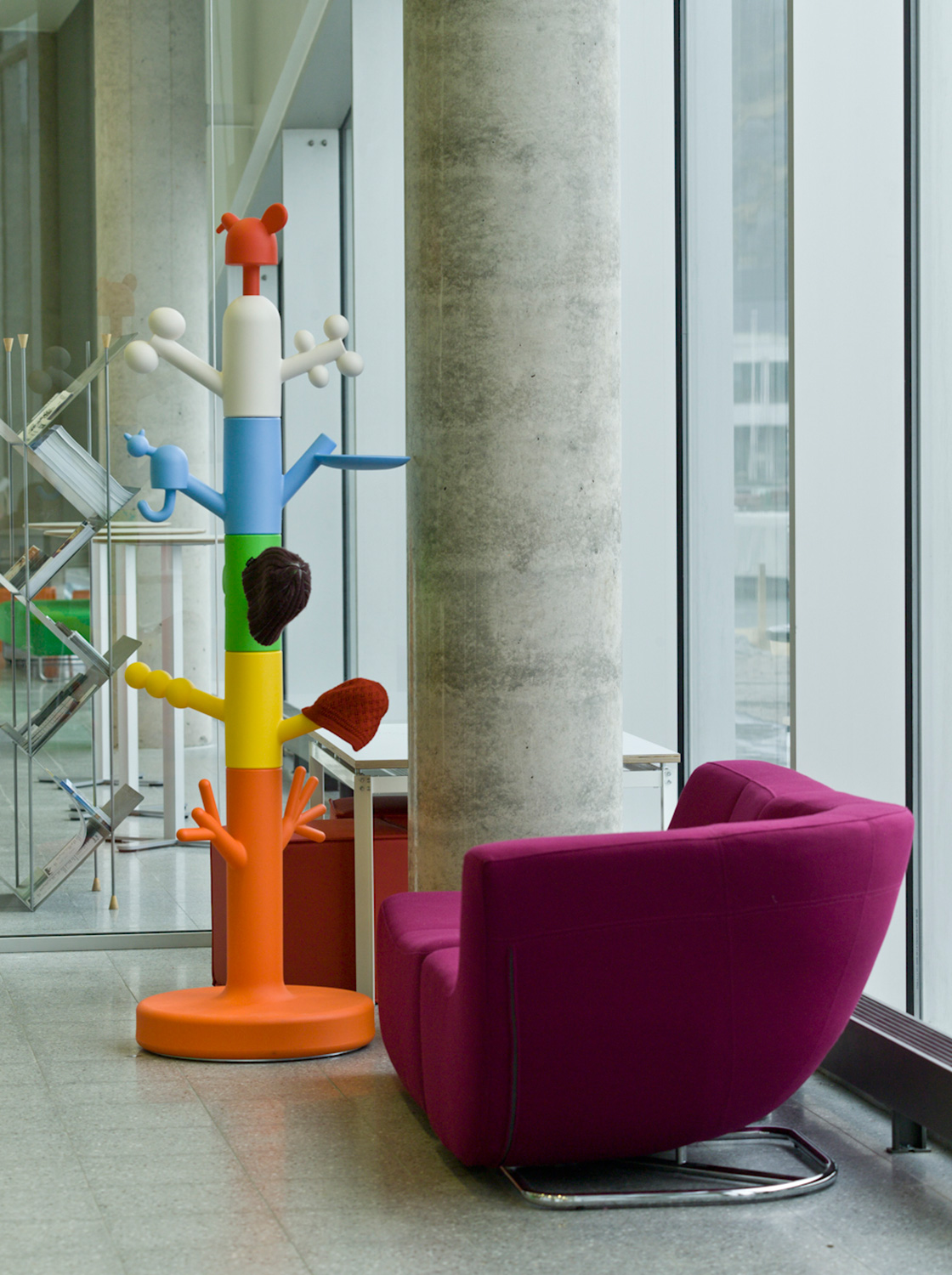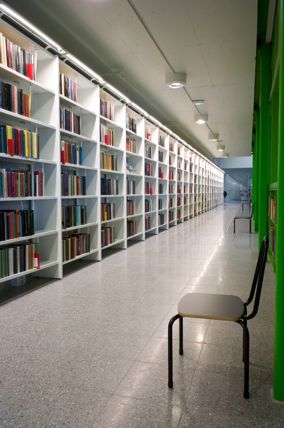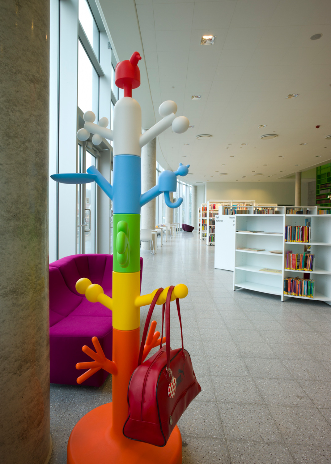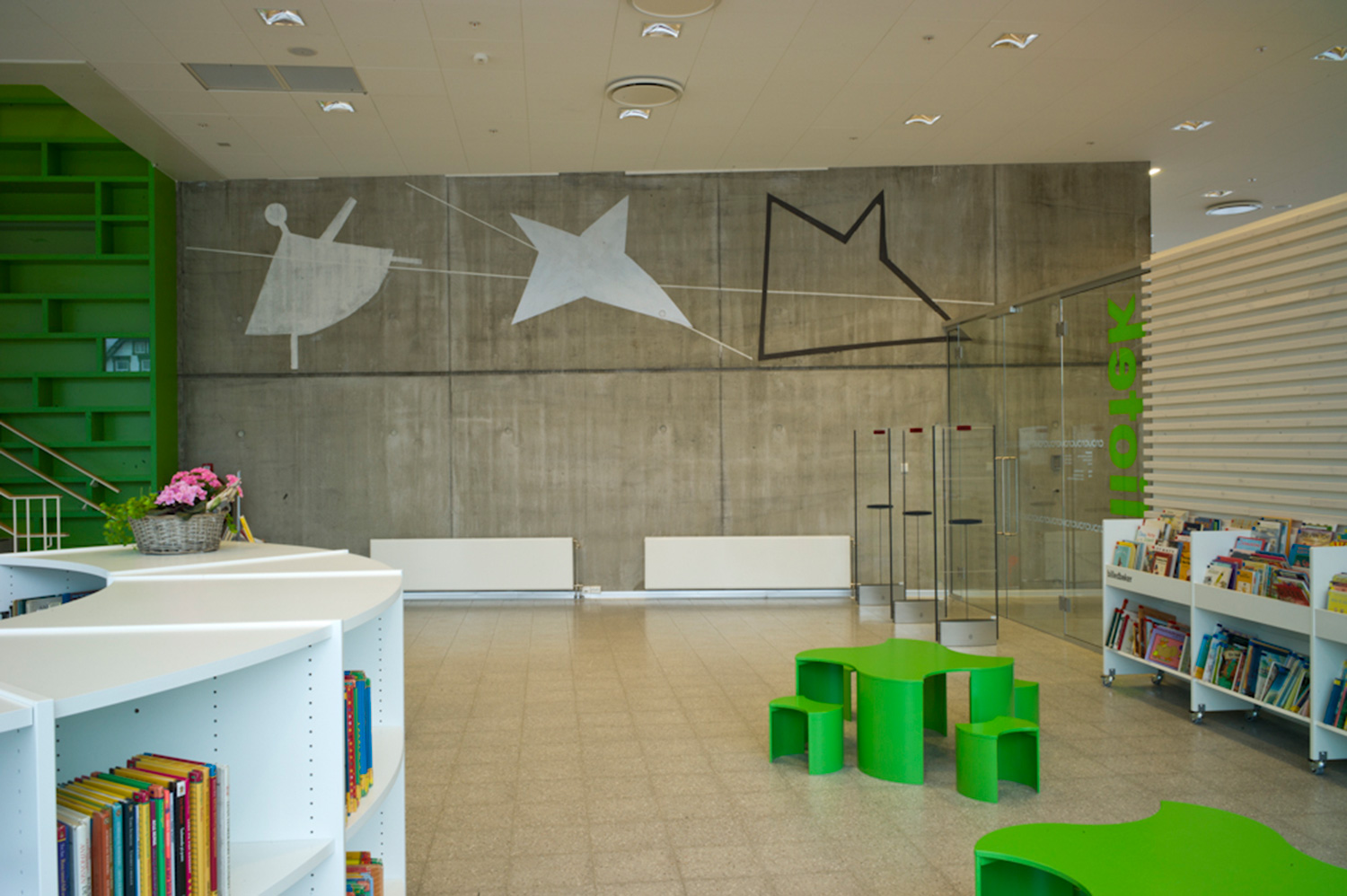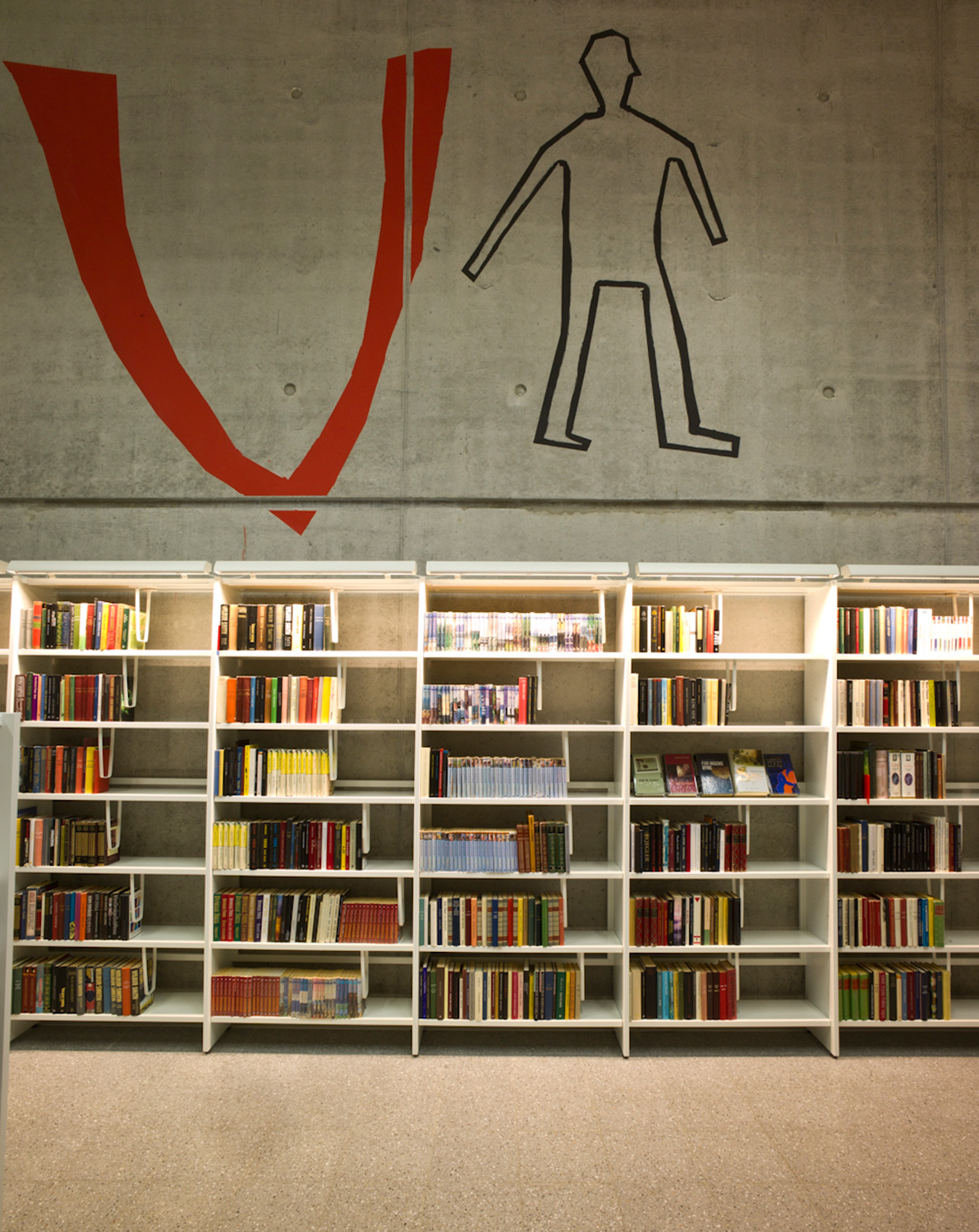 Lumineuse et aérée, la bibliothèque s’étend sur trois étages. L’intérieur se caractérise par un mur vert du plafond au sol spécialement conçu, qui contraste superbement avec les rayonnages blancs. Les vitres panoramiques offrent une vue spectaculaire de le rivière. Nature et tradition rencontrent développement et innovation.