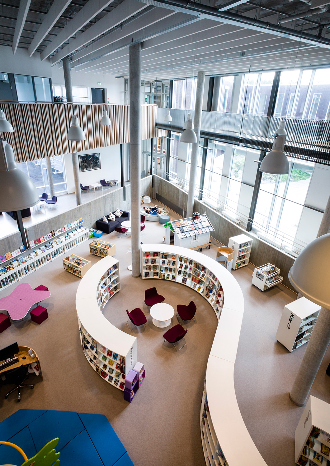 Avec ses formes organiques et ses courbes douces, elle se distingue par une nouvelle approche. Cela se reflète non seulement dans l’architecture, mais aussi dans les rayonnages qui adoptent la forme organique. Les tables et les sièges confortables sont nombreux, ainsi que les points d’information et les bornes de prêt et de retour en libre-service, pour le plus grand plaisir des usagers.