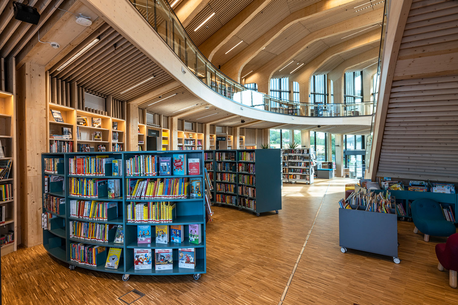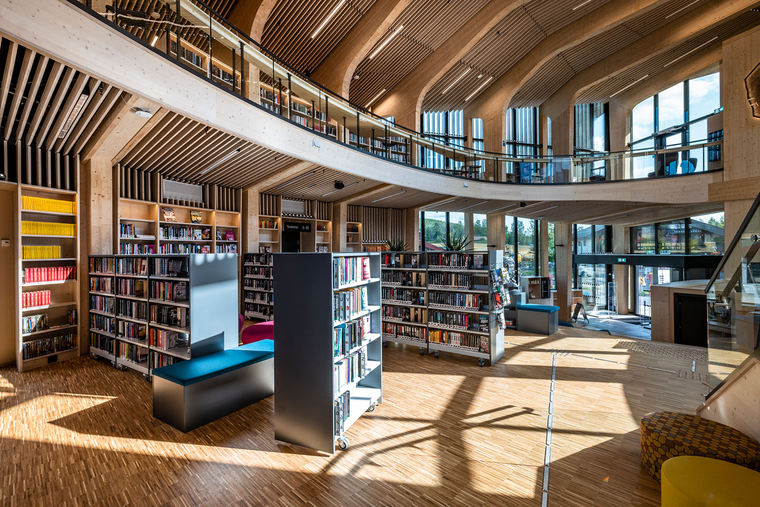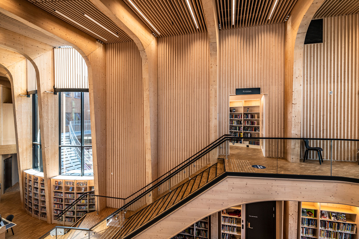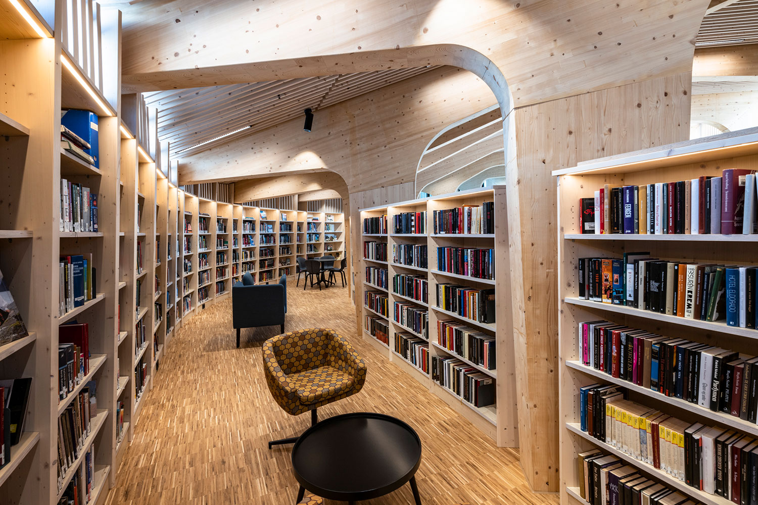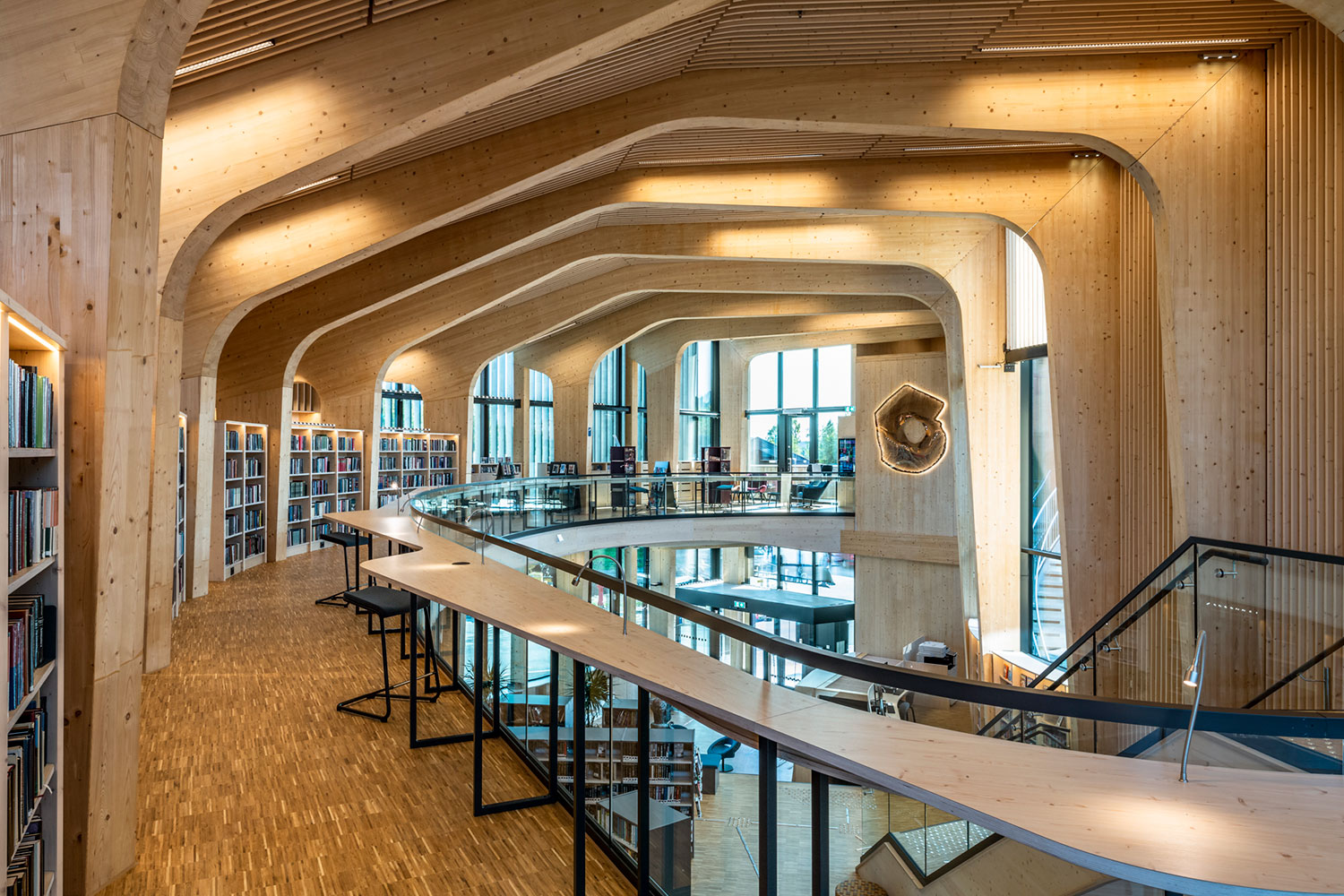 Le bâtiment spectaculaire, de forme organique, est devenu un aimant pour les amateurs de littérature et d’architecture. La structure de l’édifice est en bois massif avec un atrium ouvert au centre.