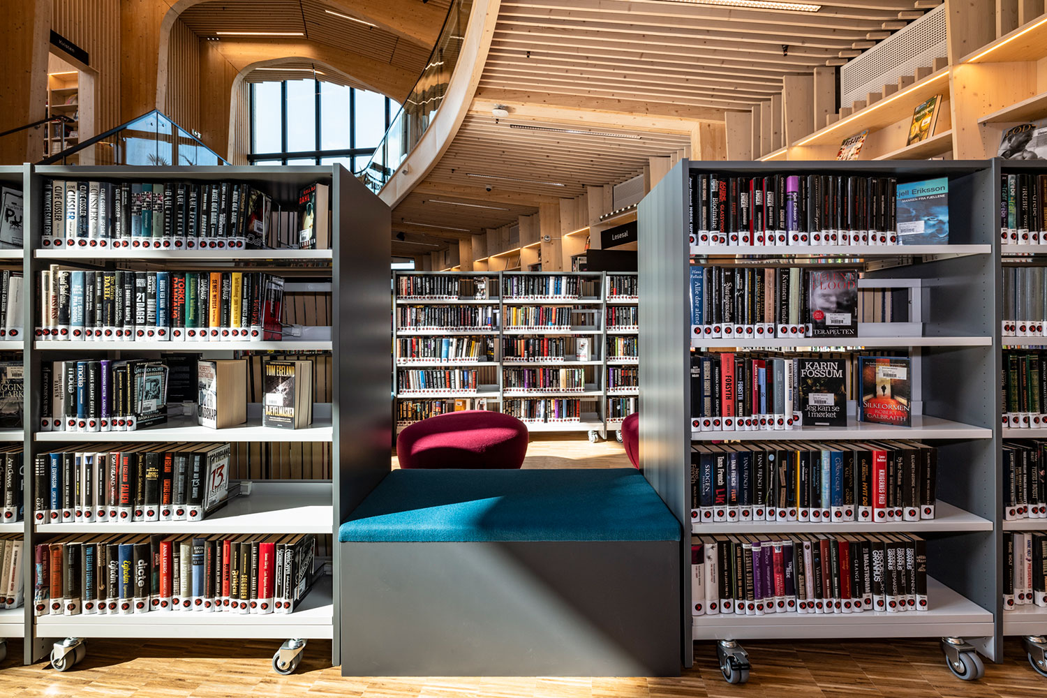 La bibliothèque s'étend sur deux étages dans le bâtiment, avec des zones de rassemblement ingénieusement placées au centre, et des zones plus isolées et intimes le long des murs extérieurs.
