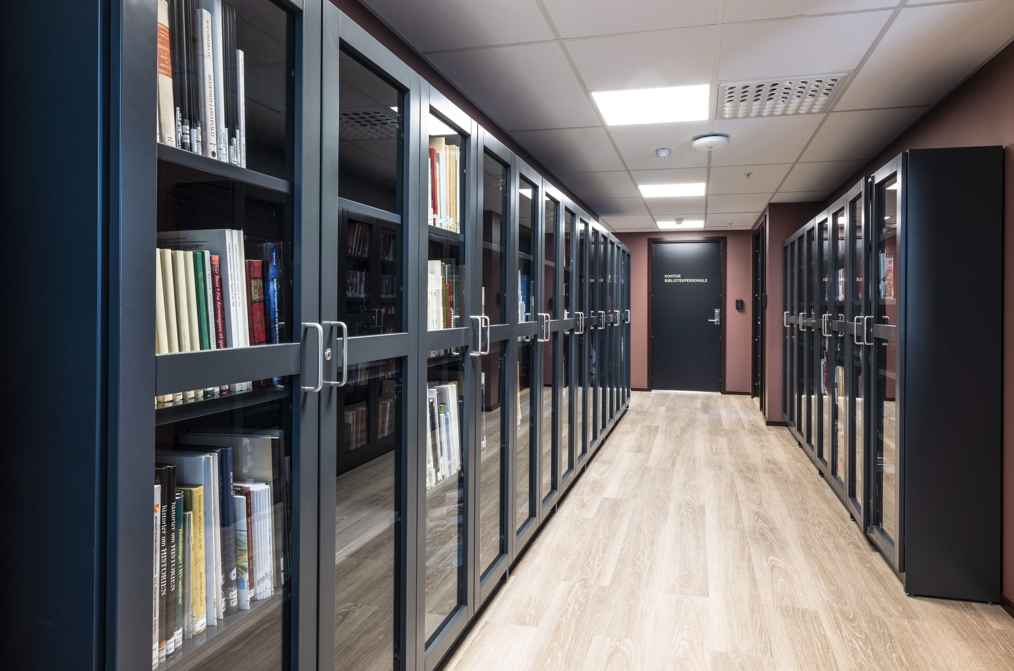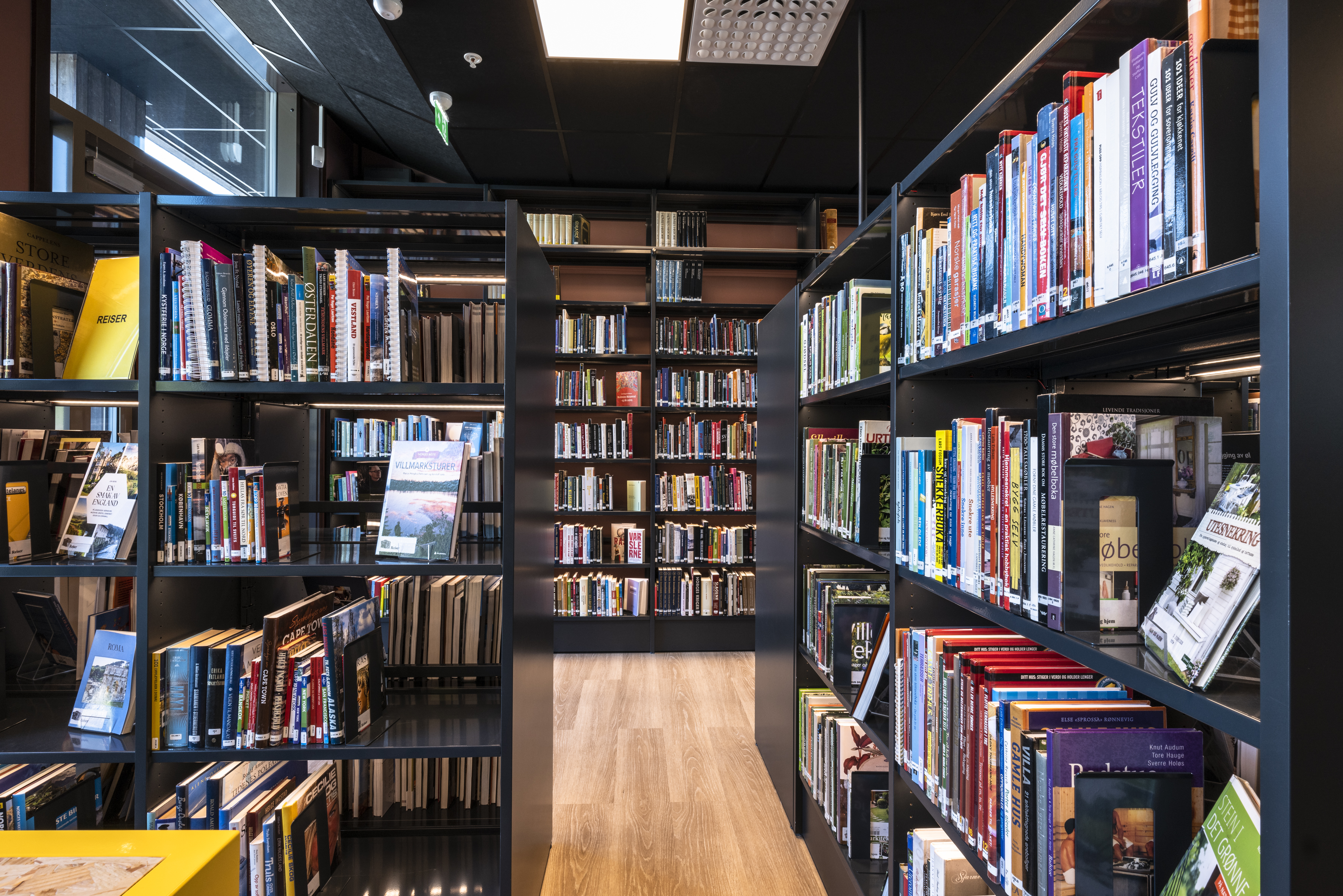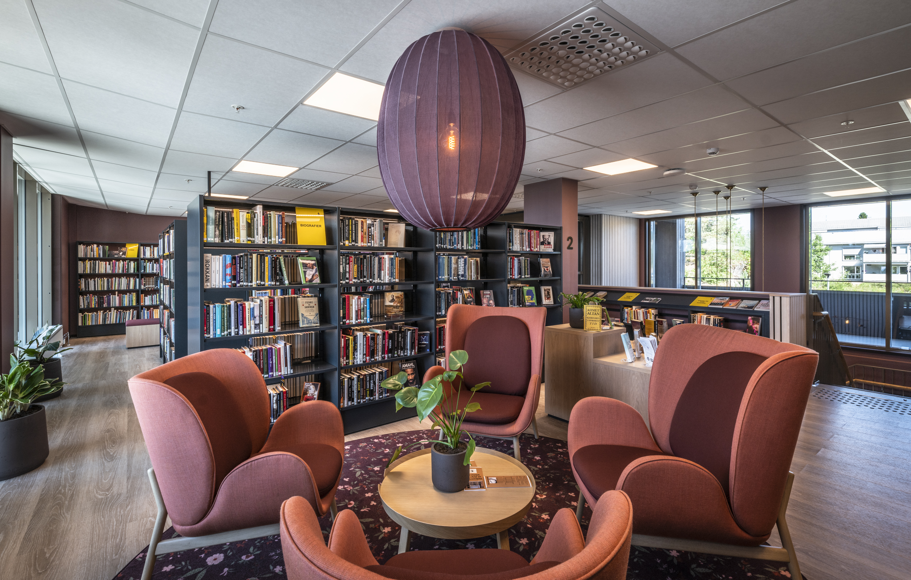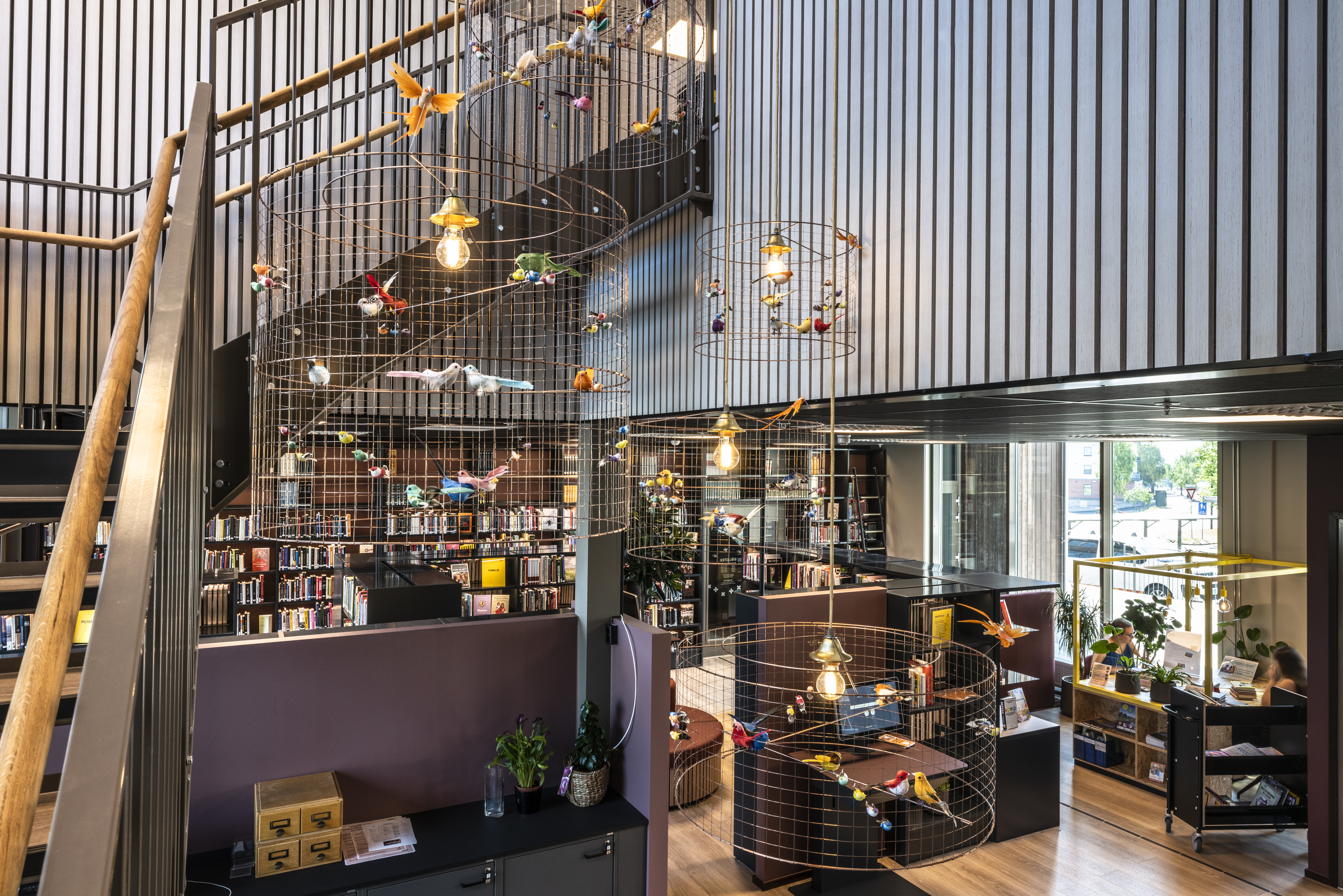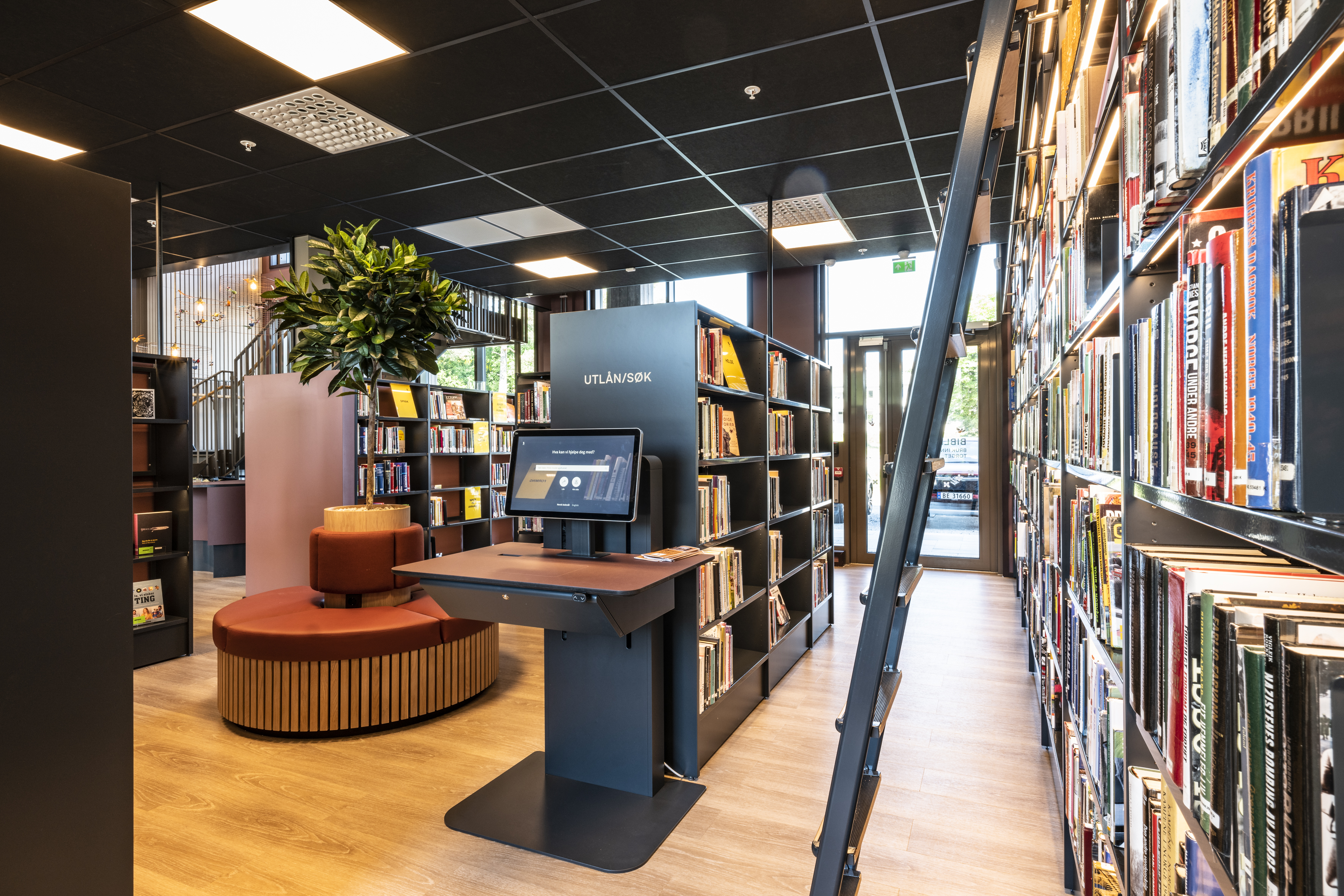 Après avoir passé plus de 40 ans dans le sous-sol d'une école, la bibliothèque de Skiptvet bénéficie désormais d'un emplacement idéal dans le nouveau quartier moderne de Torggården. Les différents départements sont répartis sur deux niveaux, reliés par un escalier orné d'amusants luminaires en forme de cage à oiseaux suspendus entre les deux étages. Différents éléments tels que l'air, la lumière et les couleurs chaudes ont été privilégiés pour rendre le nouveau lieu de rencontre de la collectivité aussi accueillant que possible. Parallèlement, une atmosphère de bien-être règne grâce à l'utilisation de composants naturels - par exemple, de nombreuses plantes de différentes formes et tailles sont présentes un peu partout dans la bibliothèque.