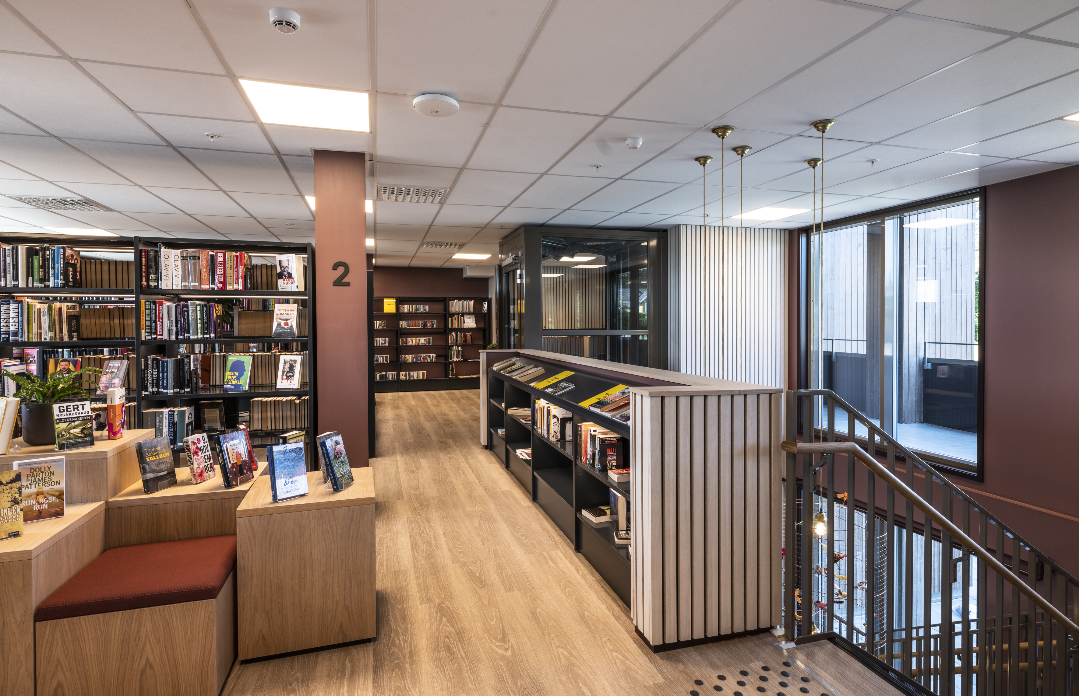 Au premier étage, se trouvent la section enfants avec des meubles colorés et de nombreux bacs à albums ainsi que la section adultes, avec les documentaires, usuels et un espace magazines et presse. Au deuxième étage, se trouve la fiction pour adultes, avec sa propre "salle" pour les polars. La section jeunesse a été placée un peu à l'écart, dans la partie la plus reculée de ce niveau, où les jeunes peuvent se retirer dans des cabines confortables et cosy pour étudier et travailler seul ou en groupe. On peut également y trouver le fonds patrimonial, bien conservé dans de hautes étagères aux portes vitrées fermant à clé.