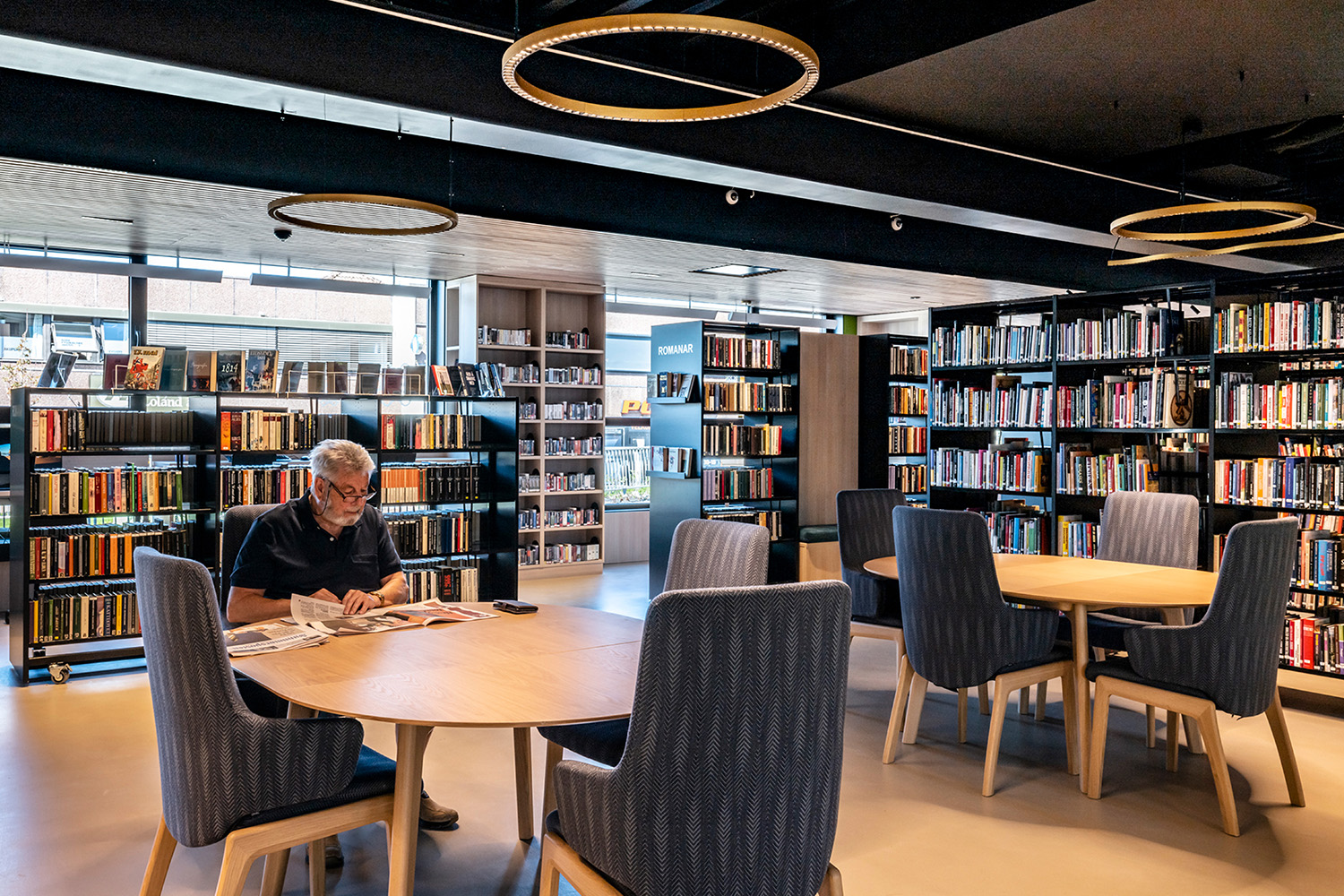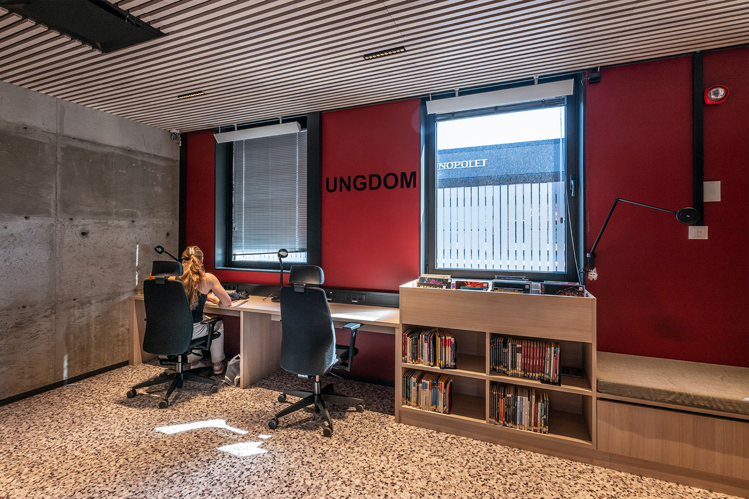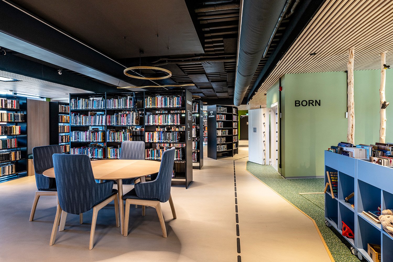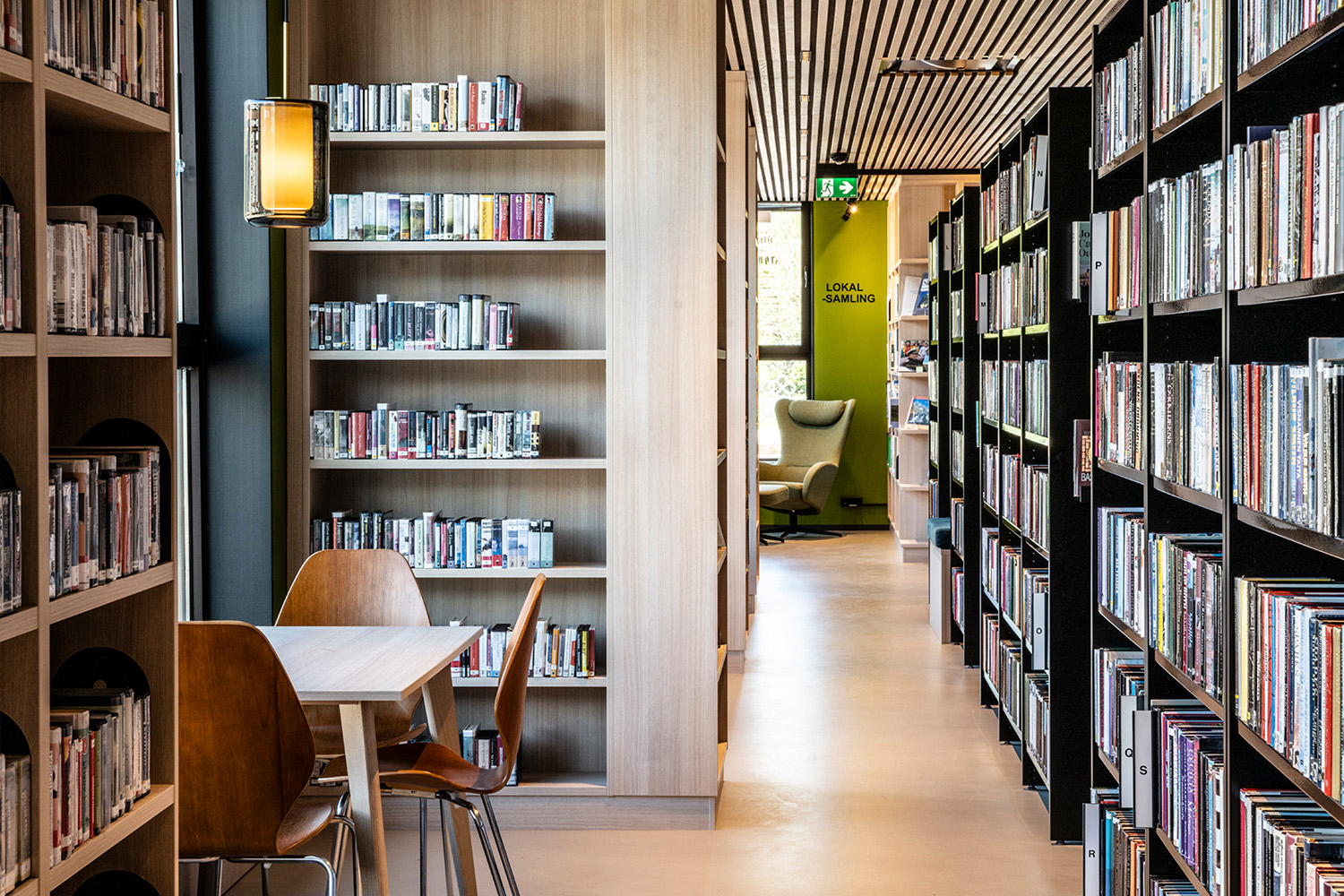 Les étagères noires au centre de la pièce ont été fournies par BS Eurobib, mais pour profiter de la grande hauteur sous plafond, toutes les étagères en bois clair le long des murs ont été conçues sur mesure. La bibliothèque est devenue un véritable lieu de rencontre où l'on peut se retrouver entre amis, jouer, lire les journaux, étudier et bien d'autres choses encore. Par ailleurs, la bibliothèque a étendu ses heures d'ouverture, donnant ainsi la possibilité de s'y rendre également le week-end.