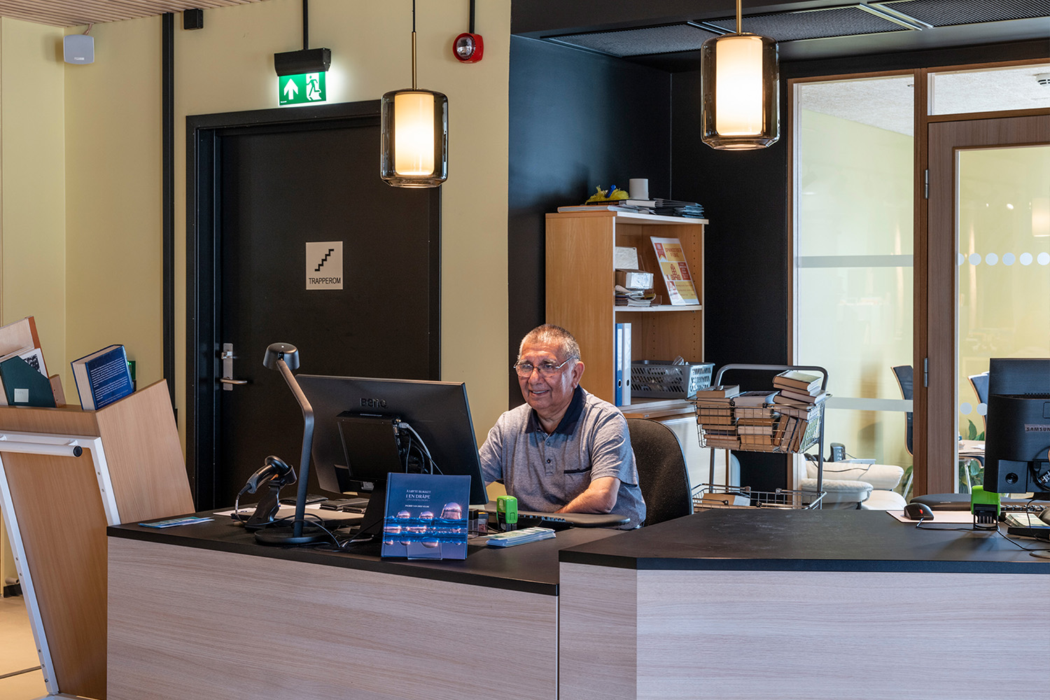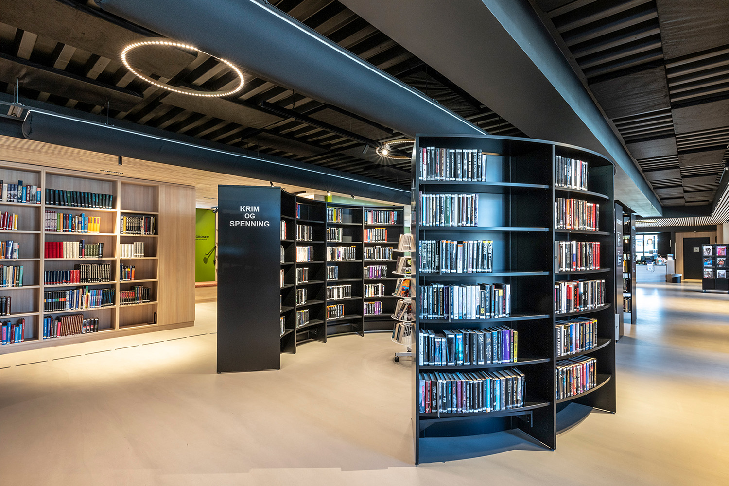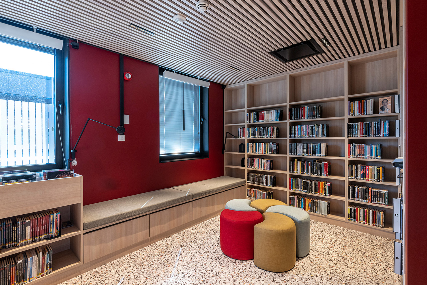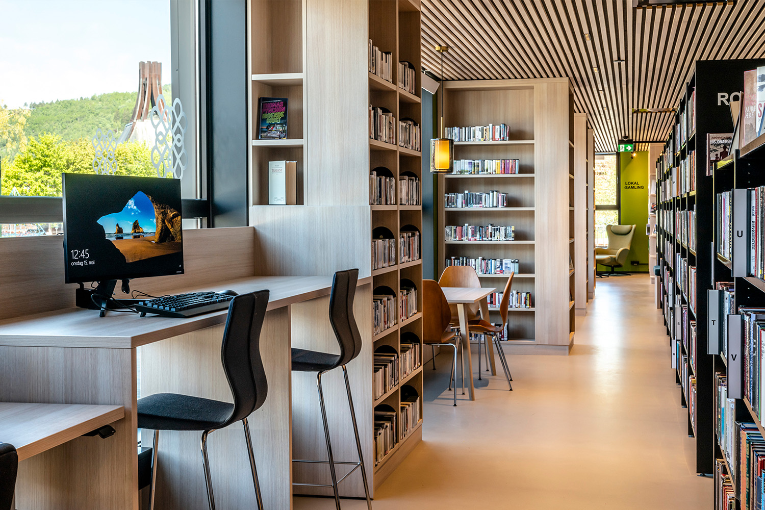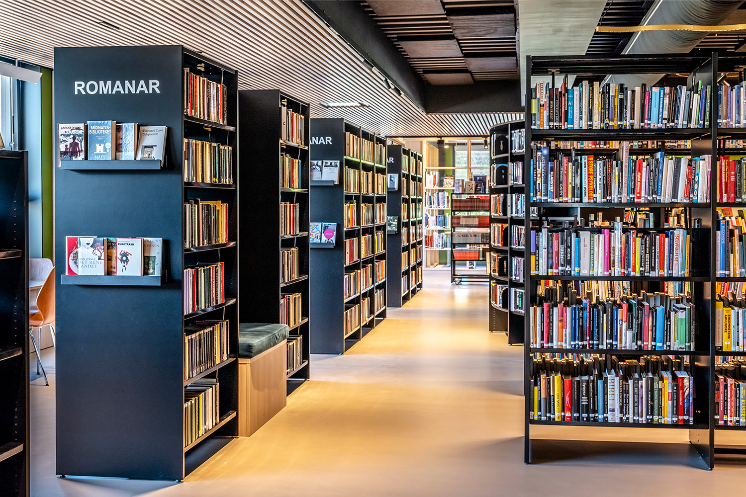 Les étagères noires au centre de la pièce ont été fournies par BS Eurobib, mais pour profiter de la grande hauteur sous plafond, toutes les étagères en bois clair le long des murs ont été conçues sur mesure. La bibliothèque est devenue un véritable lieu de rencontre où l'on peut se retrouver entre amis, jouer, lire les journaux, étudier et bien d'autres choses encore. Par ailleurs, la bibliothèque a étendu ses heures d'ouverture, donnant ainsi la possibilité de s'y rendre également le week-end.