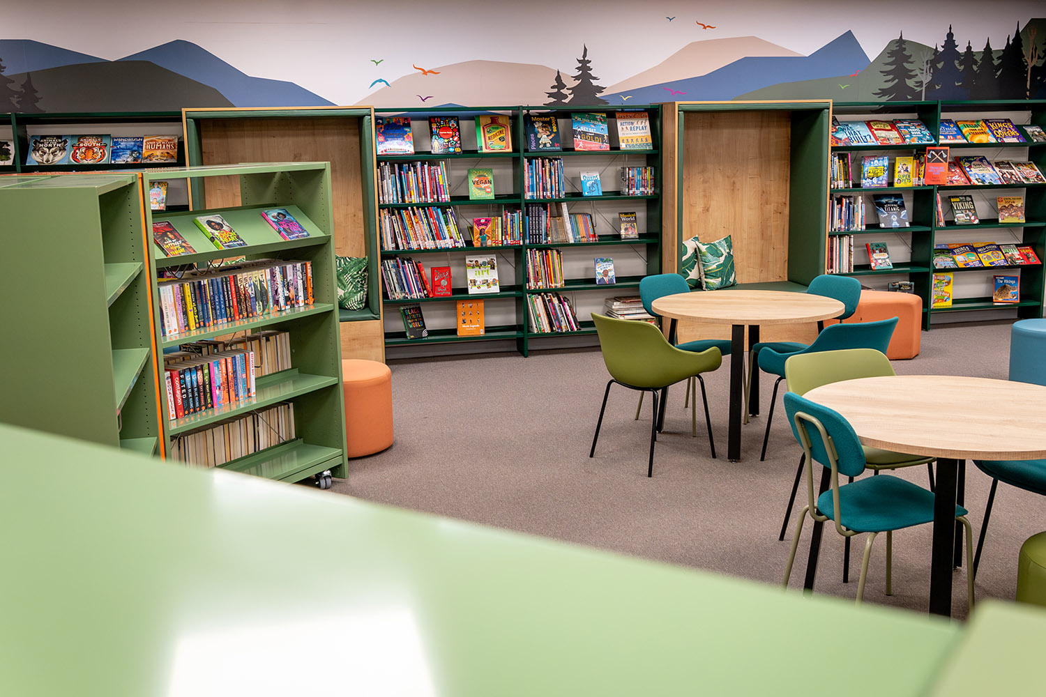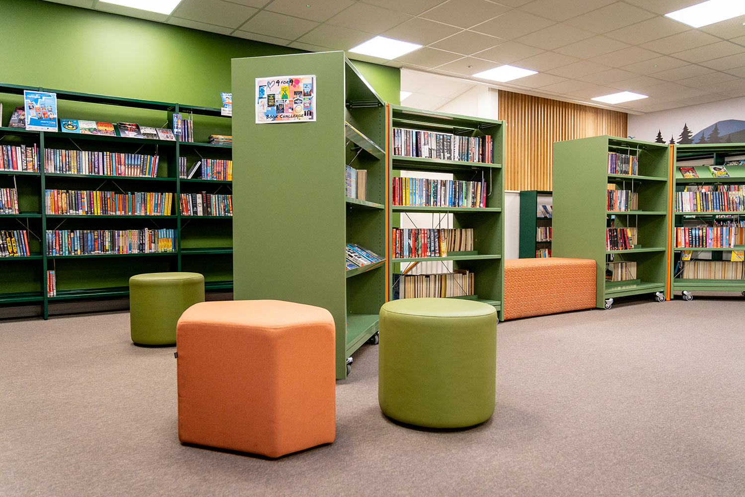 Les éléments graphiques distinctifs ont été élaborés en collaboration avec les étudiants, ce qui confère à l’espace une dimension personnelle et un fort sentiment d’appartenance. Les teintes choisies pour le mobilier de confort et les rayonnages verts ont permis d’assurer une cohérence esthétique de l’ensemble de l’architecture de la bibliothèque.